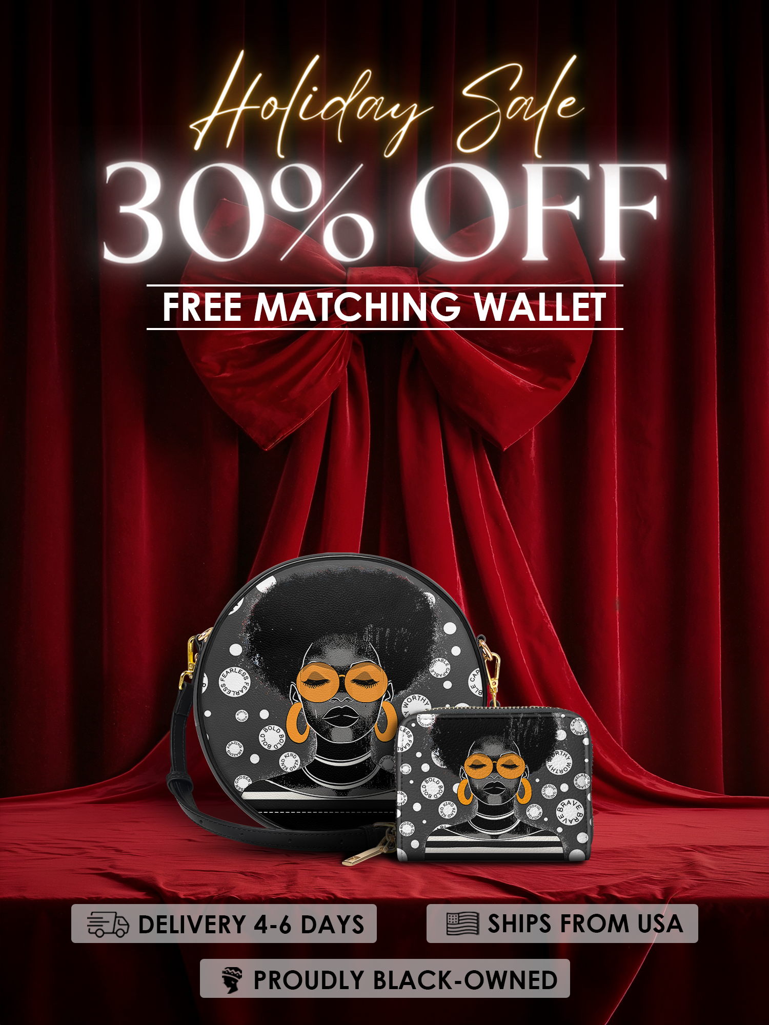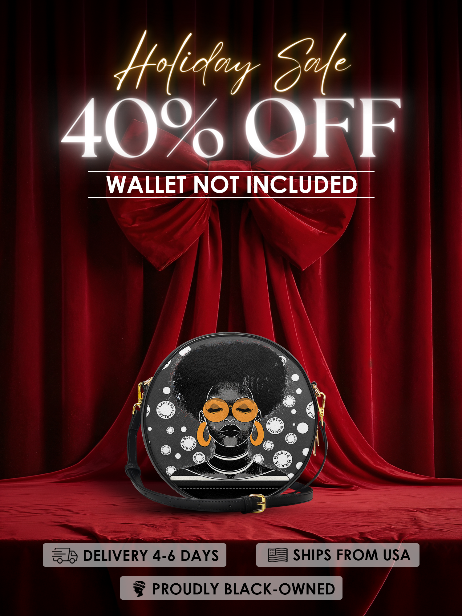 With her oversized hoops, power-fro, and golden shades that say “I see you, but I’m still focused,” this queen brings quiet confidence and loud style in one fierce design. Surrounded by powerful affirmations like “brave,” “worthy,” and “fearless,” this circle bag isn’t just fashion—it’s a whole mood.