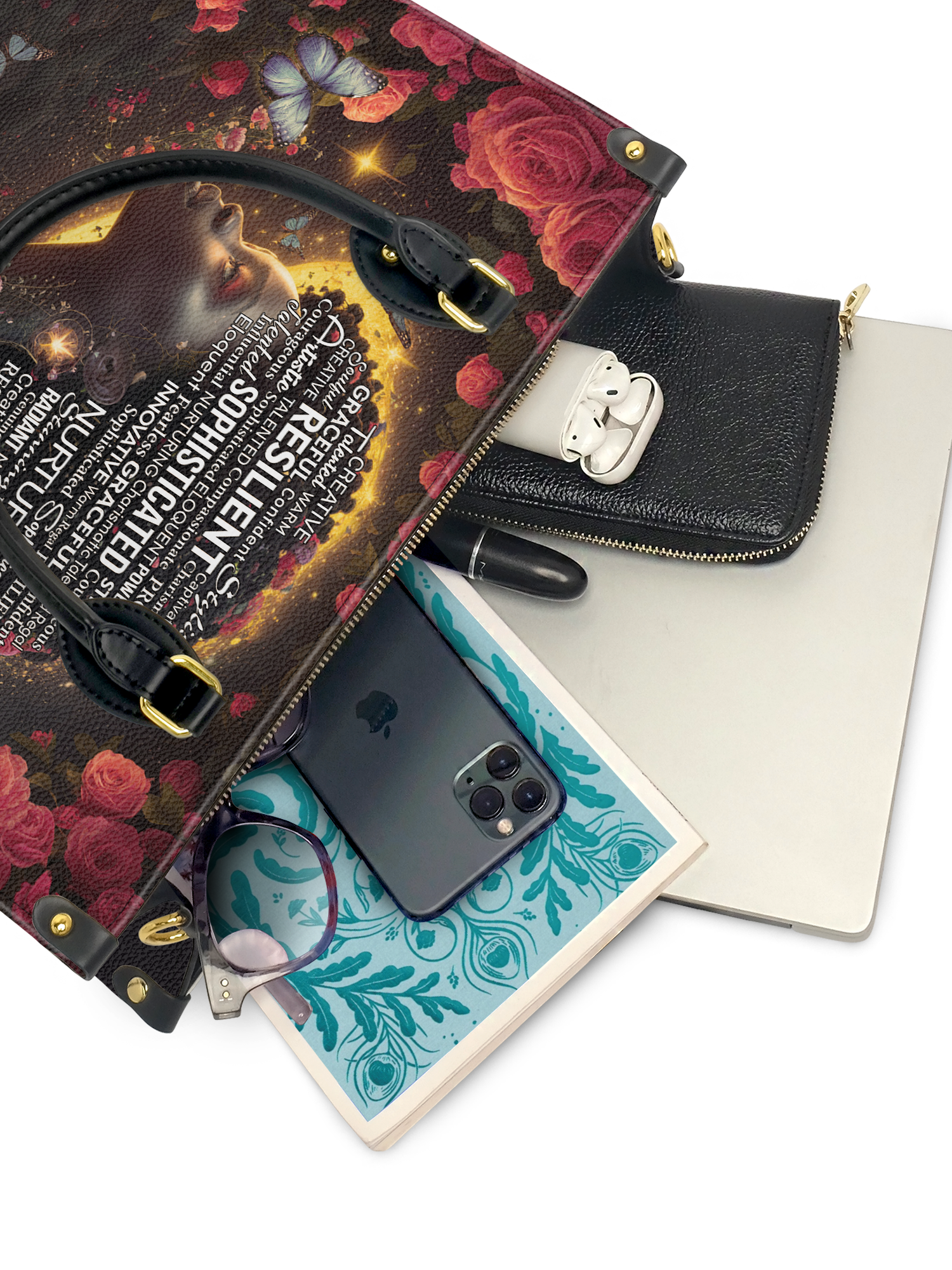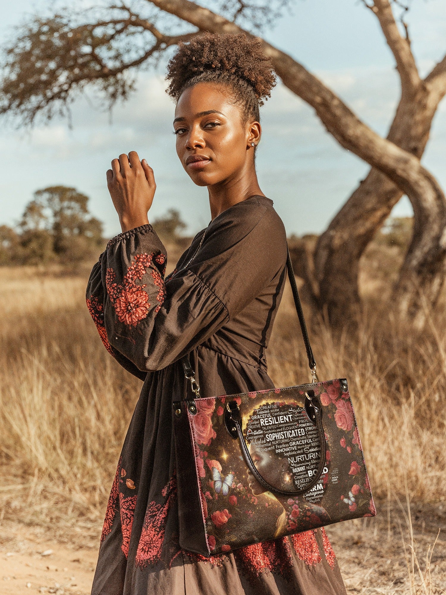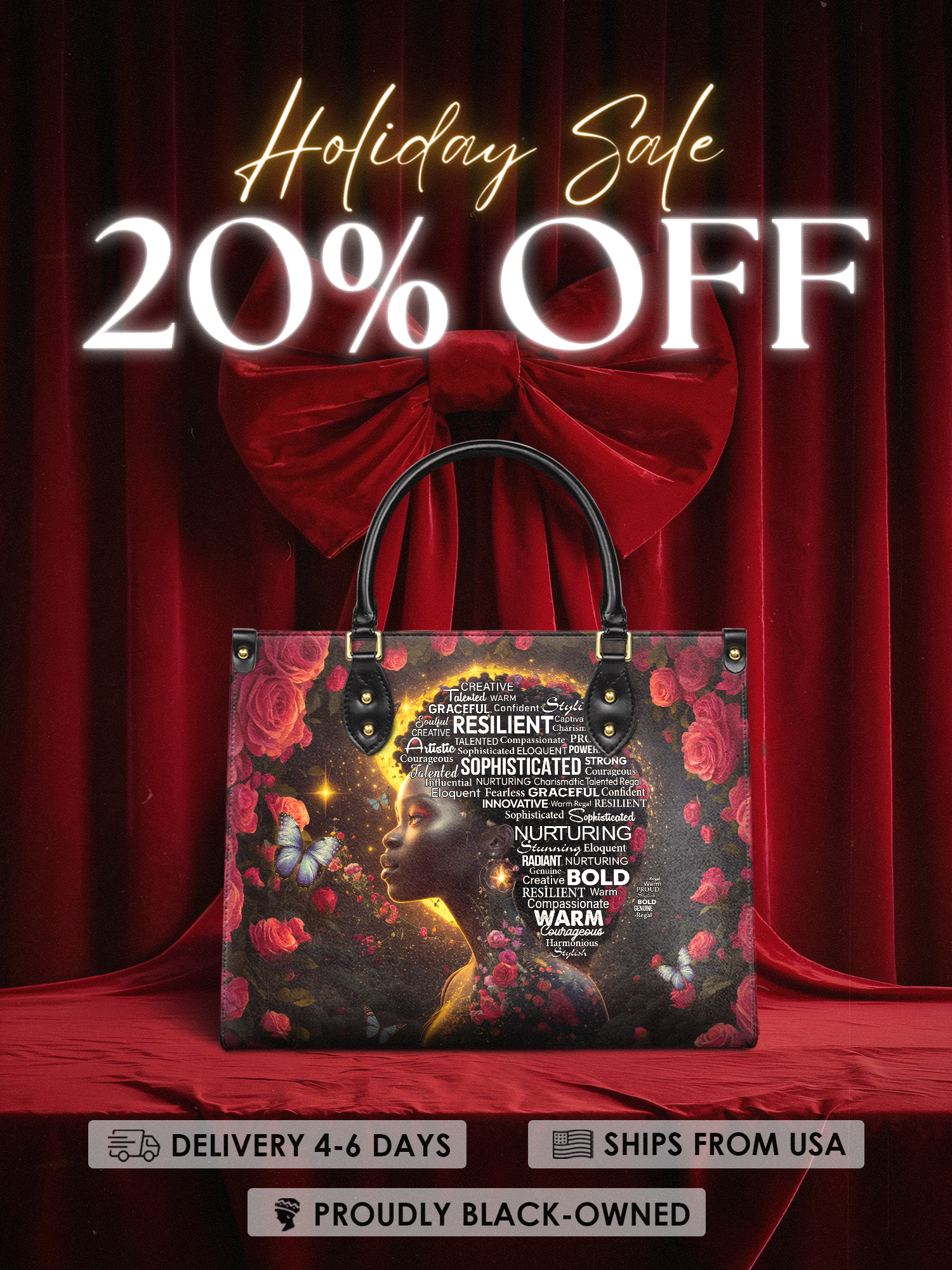 The Aurenna Leather Handbag is more than a statement—it’s a mirror. A reflection of the woman who wears it: radiant, resilient, sophisticated, nurturing… and so much more. This design wraps powerful affirmations into the silhouette of a regal Black woman bathed in golden light and blooming florals, as if to say: “This is who you’ve always been.”