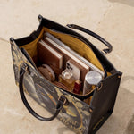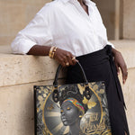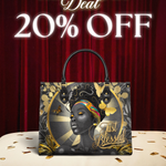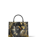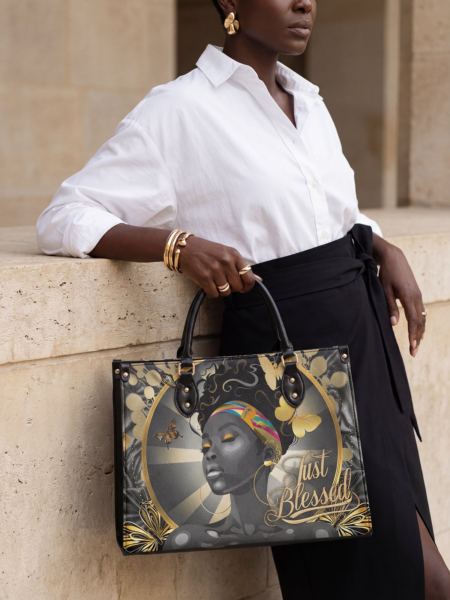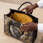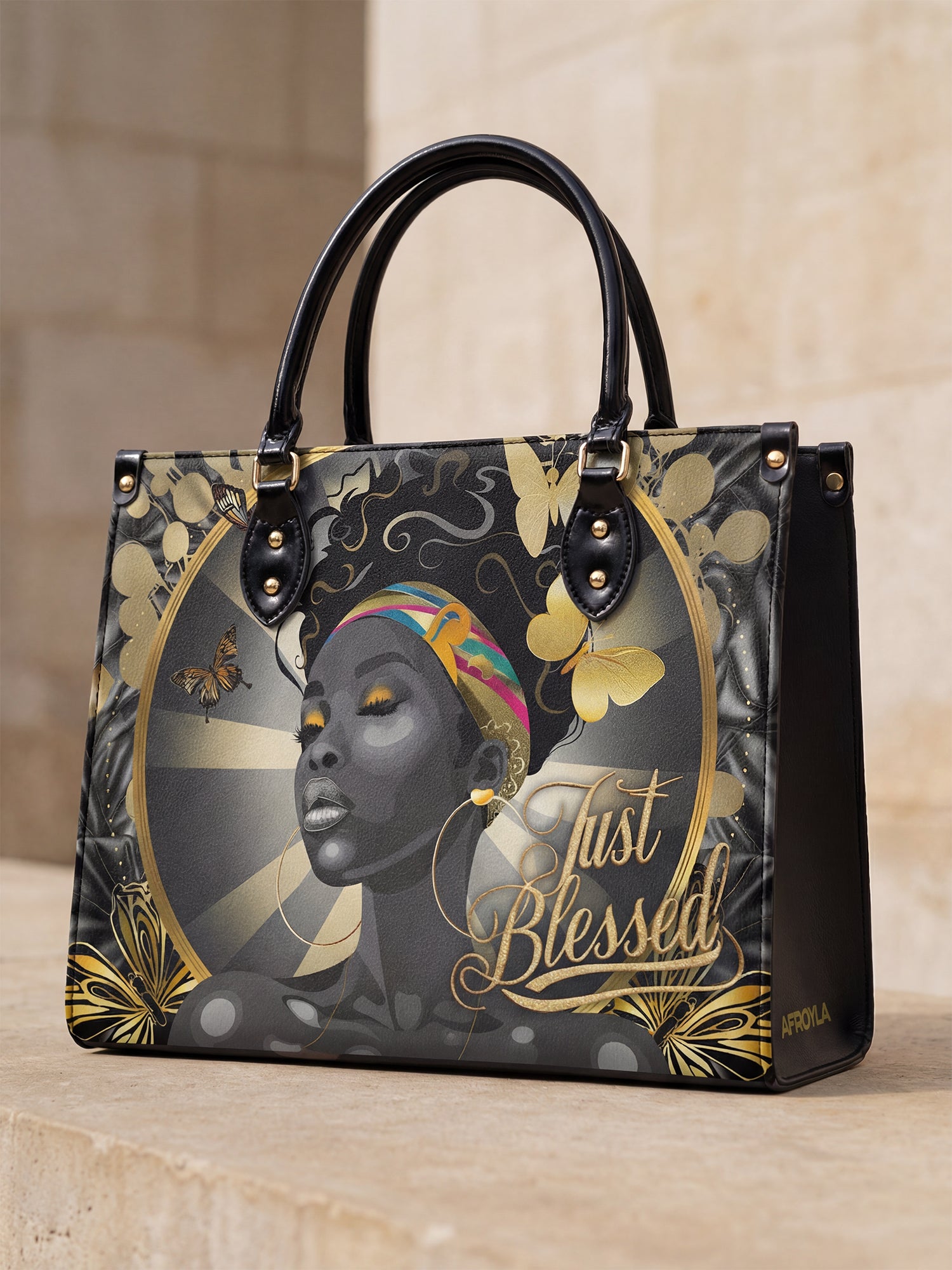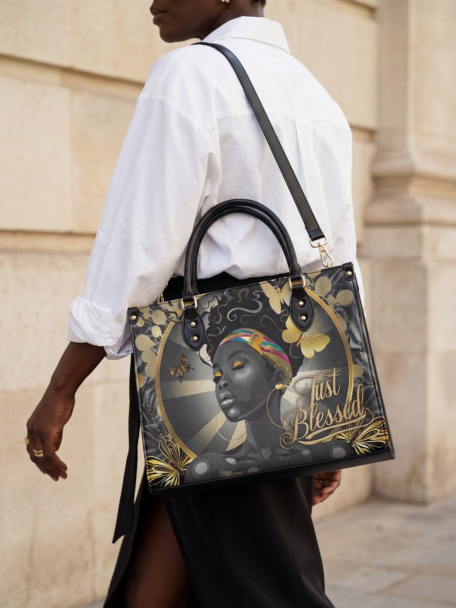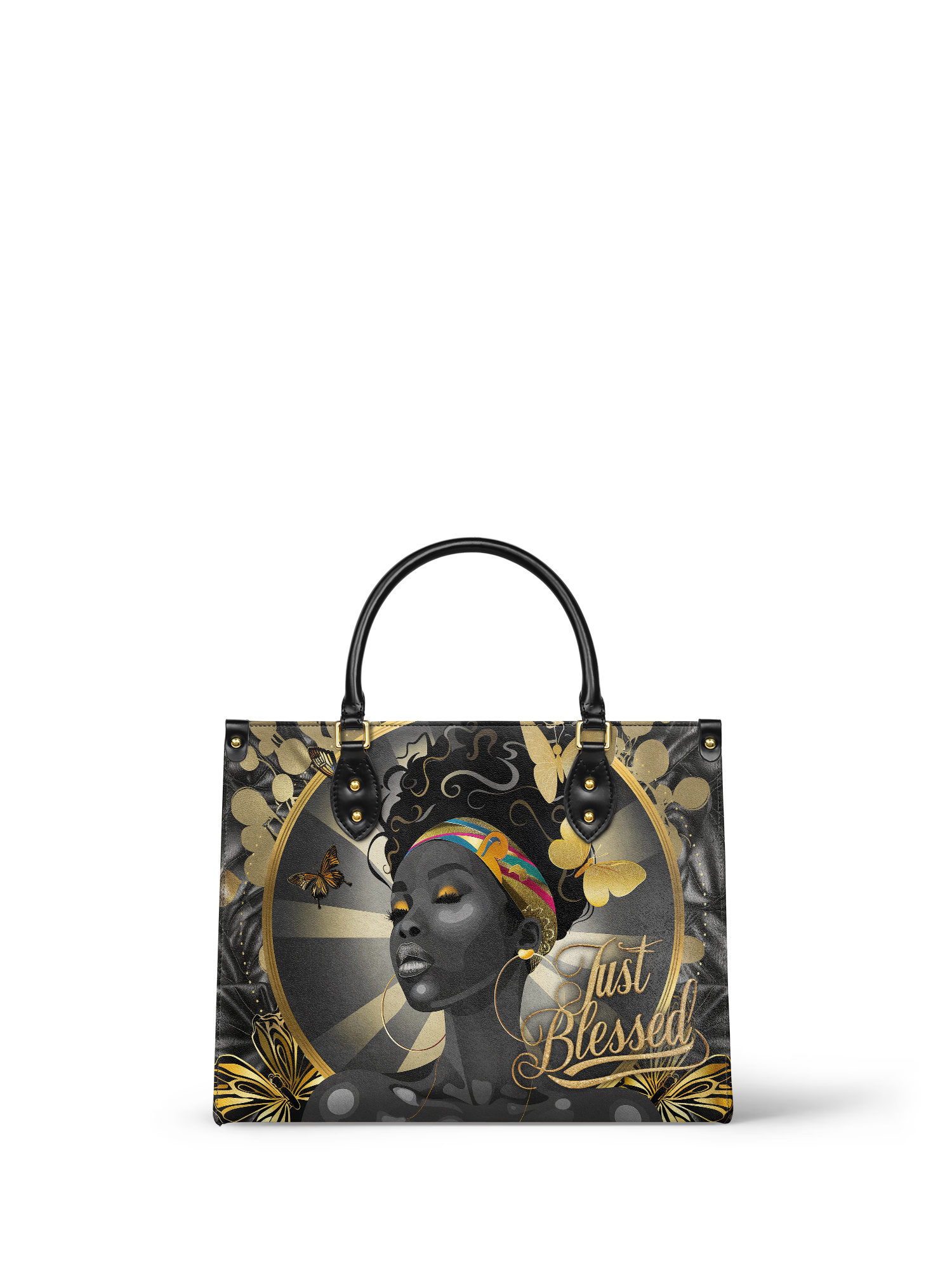 Featuring the elegant "Just Blessed!" quote, this design reflects the unshakable confidence and gratitude of a woman who recognizes her power, beauty, and spiritual abundance. The rich black and gold tones, paired with intricate artistic details, make this handbag a bold and meaningful statement piece. Carry your blessings with style and purpose!