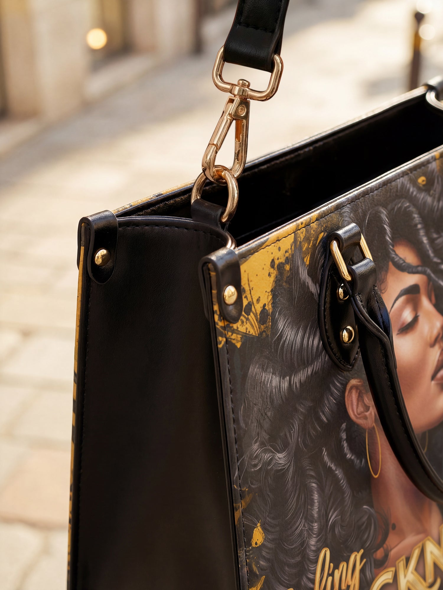 Sis… this ain’t just a bag. It’s a whole mood. The Blacknificent leather handbag is that daily reminder that your melanin, your magic, your presence—is pure power. With a golden glow backdrop and a portrait that radiates strength, style, and softness all at once, this bag doesn’t whisper confidence. It SHOUTS it. Because when you step out, you’re not just feeling good. You’re feeling Blacknificent. And every Queen deserves to carry something as bold, brilliant, and beautiful as she is.