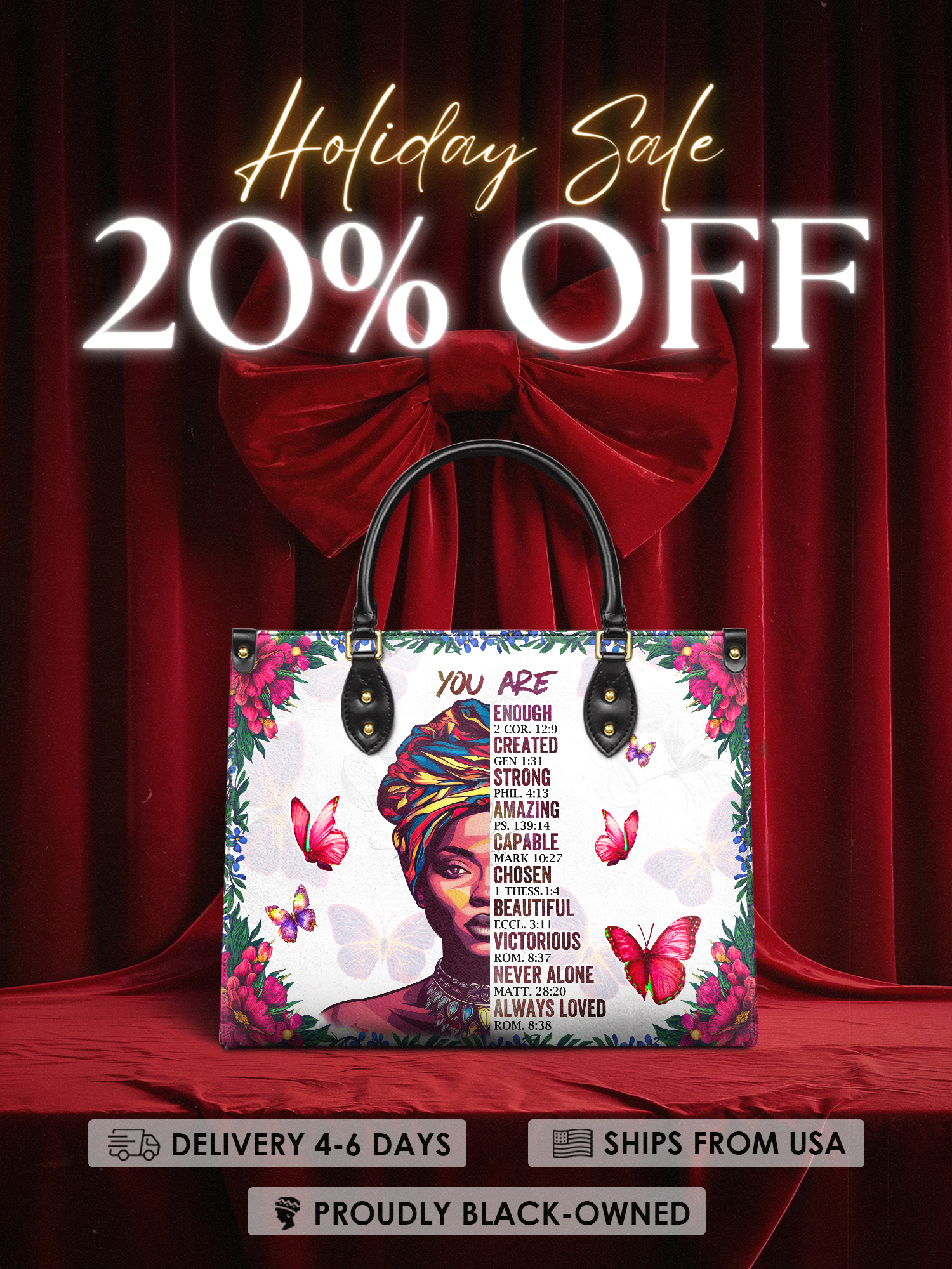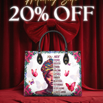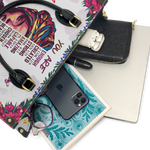 The Imani Affirmation handbag in white is soft, uplifting, and full of peace. Framed by blooming flowers and bright butterflies, it carries powerful reminders of who you are—enough, strong, beautiful, never alone. The light background lets every word shine with gentle strength. It’s the kind of bag that speaks before you do, wrapping you in faith, grace, and love wherever you go. A quiet glow, but full of power.