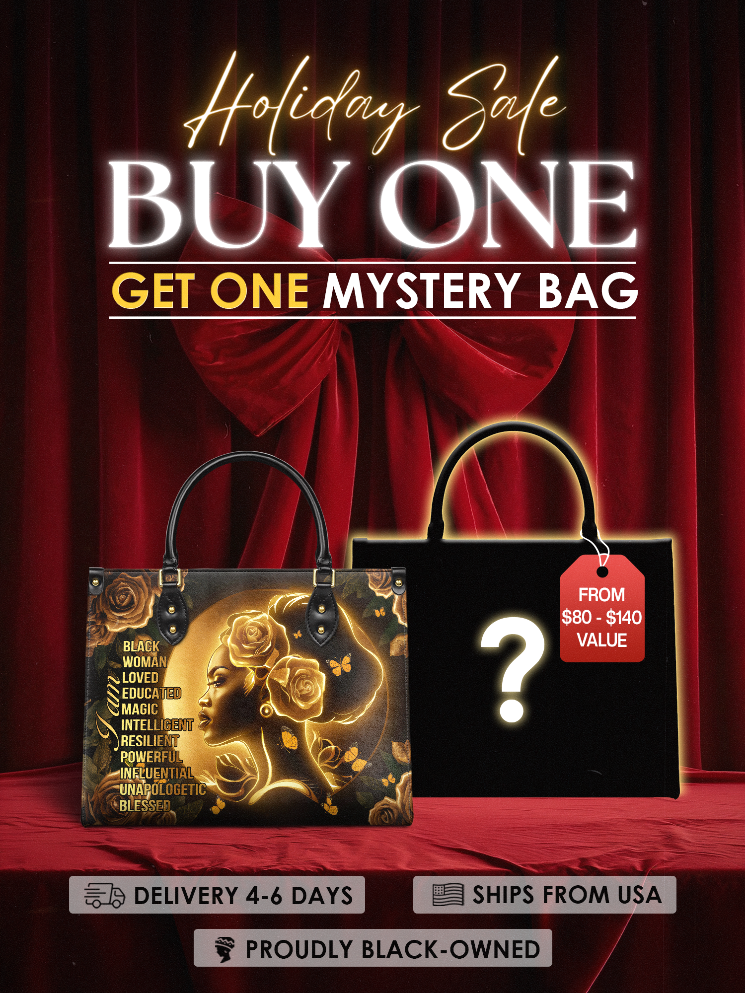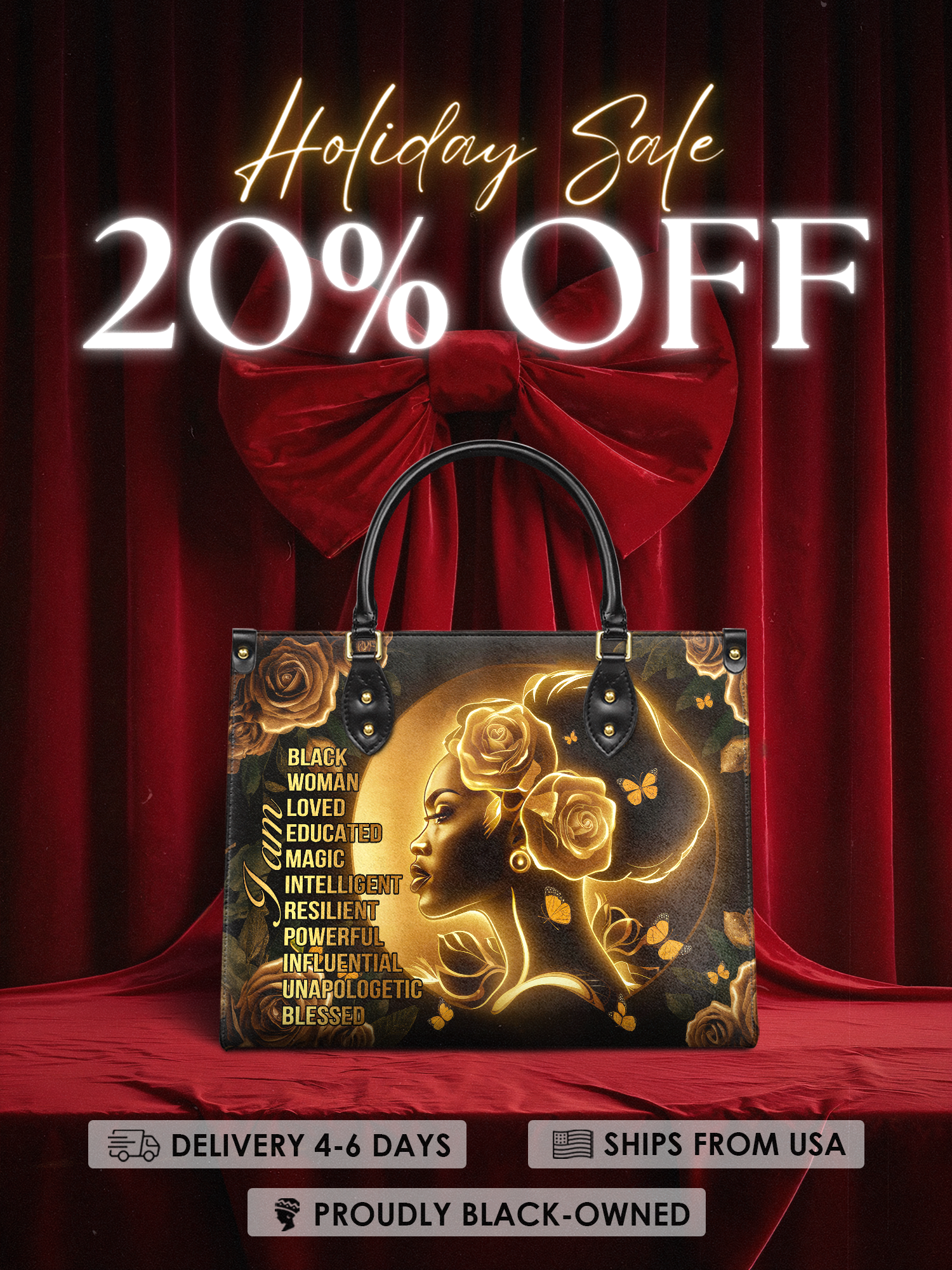 “Lumina” means light—and this bag is exactly that. A radiant tribute to everything a Black woman is: LOVED. EDUCATED. MAGIC. RESILIENT. UNAPOLOGETIC. Designed in deep, golden tones and crowned with blooming roses, the artwork doesn’t just glow—it speaks. It speaks to your strength. Your story. Your soul. Every time you carry it, it’s not just fashion—it’s a declaration. A daily reminder that you are powerful, you are influential, and you were never meant to shrink.