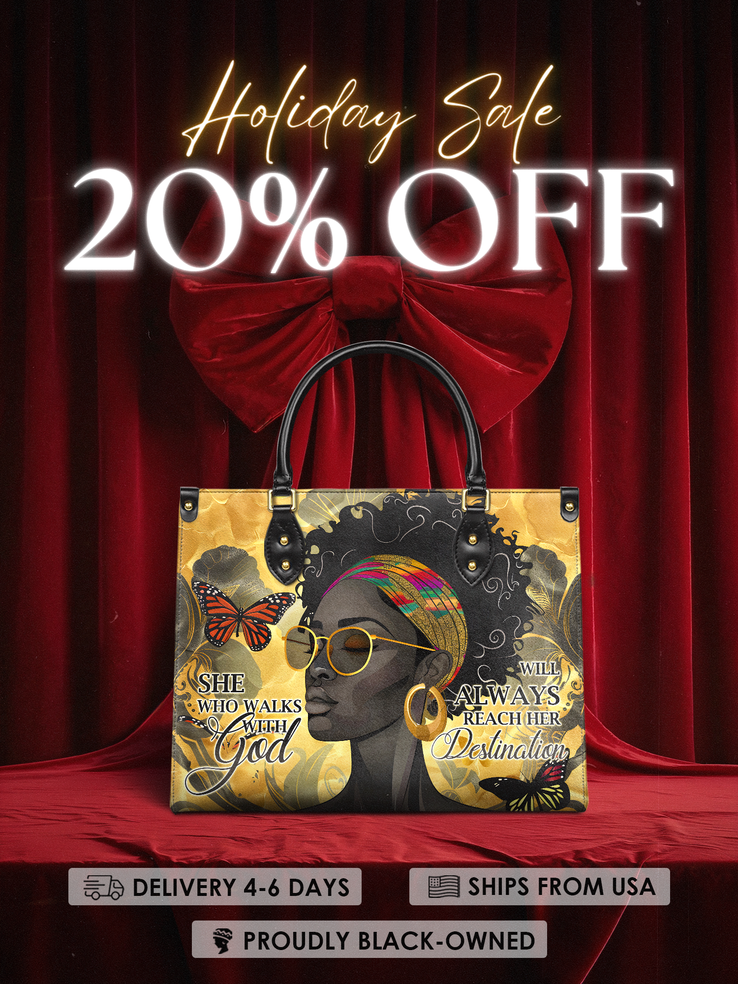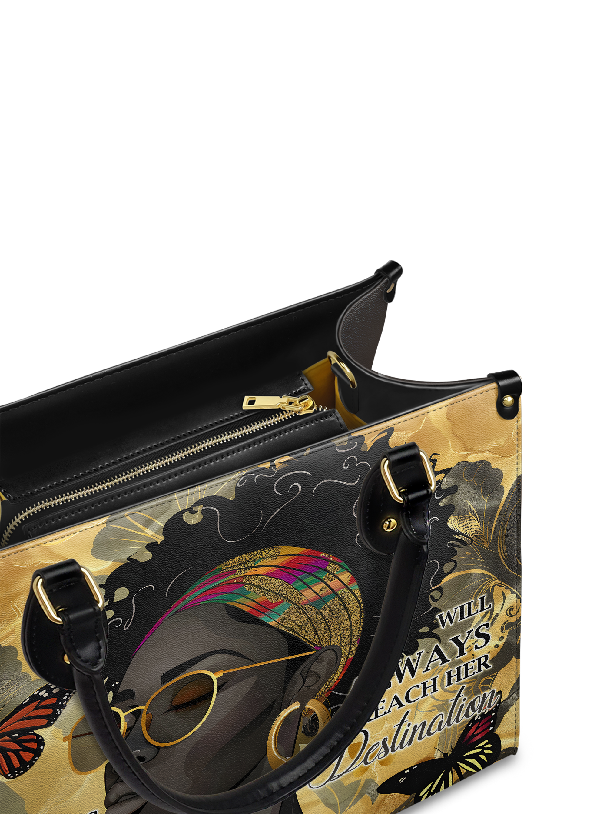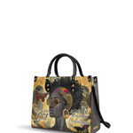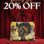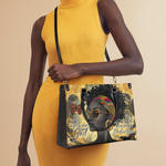 The Njia Handbag, meaning "path" in Swahili, symbolizes faith and strength. Featuring the quote "She who walks with God will always reach her destination" this design celebrates the resilience of Black women. The artwork showcases a regal Black woman with bold confidence, surrounded by butterflies representing transformation. Made from premium leather, this handbag is a stylish reminder that faith leads the way.