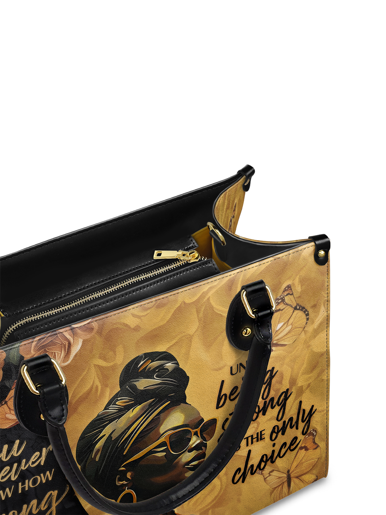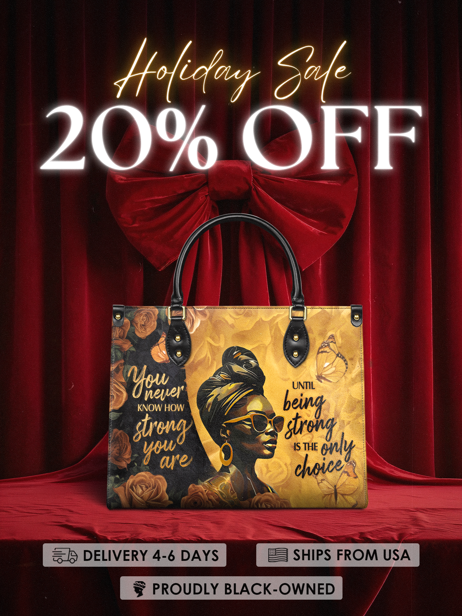 The "Siyanda" Strong Handbag is a tribute to the unshakable strength of Black women. Featuring the powerful quote "You never know how strong you are until being strong is the only choice," this bag is a reminder of resilience, courage, and grace. With rich golden tones and elegant artwork, "Siyanda" is more than a handbag—it’s a statement of power and perseverance. Carry it with pride, because your strength is unmatched.