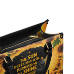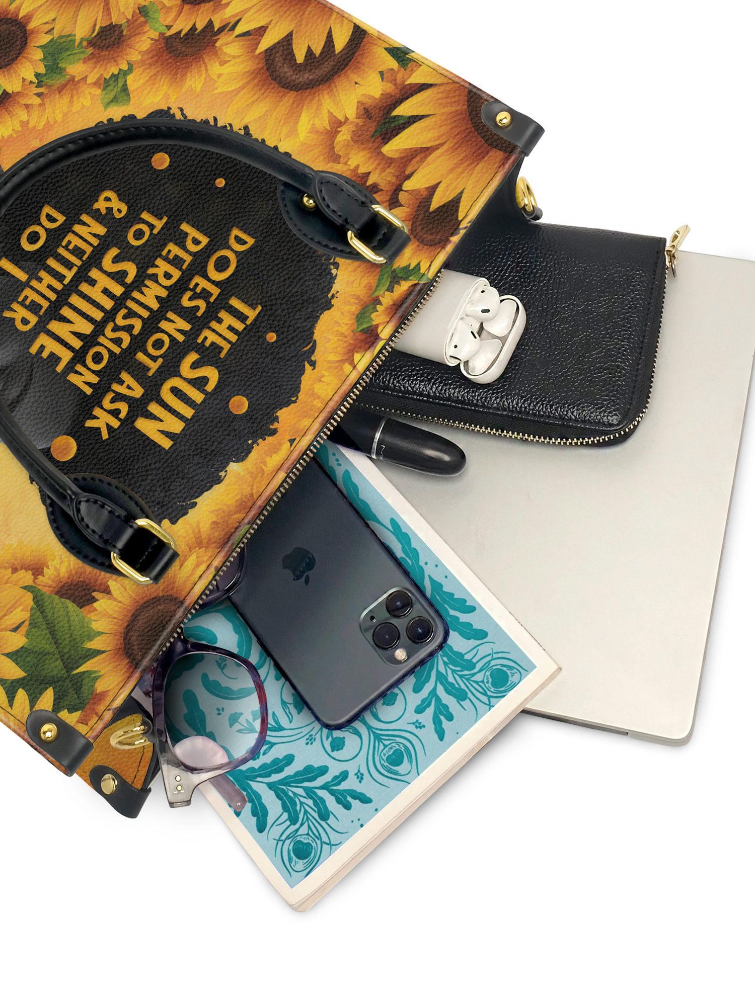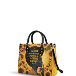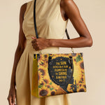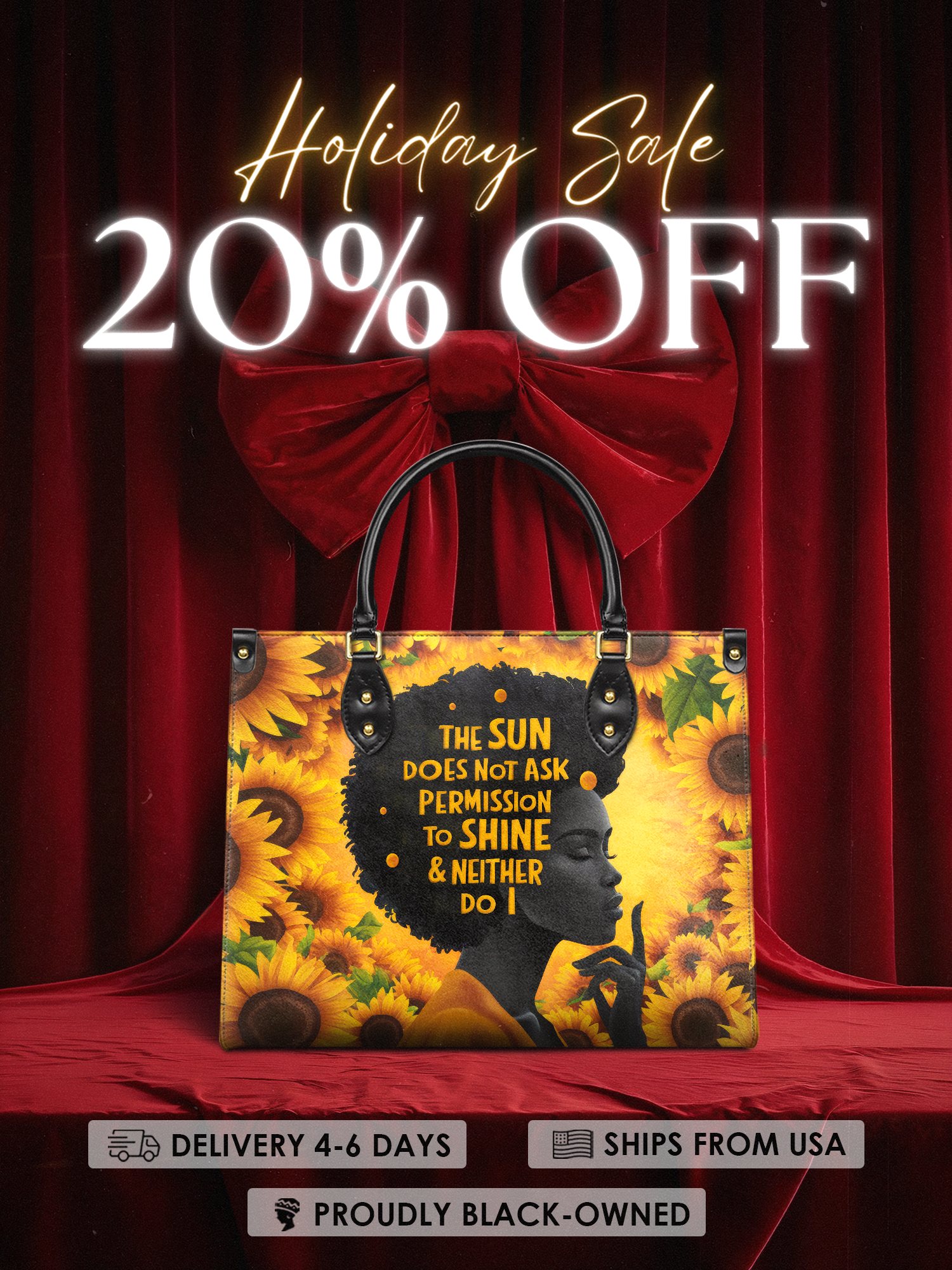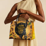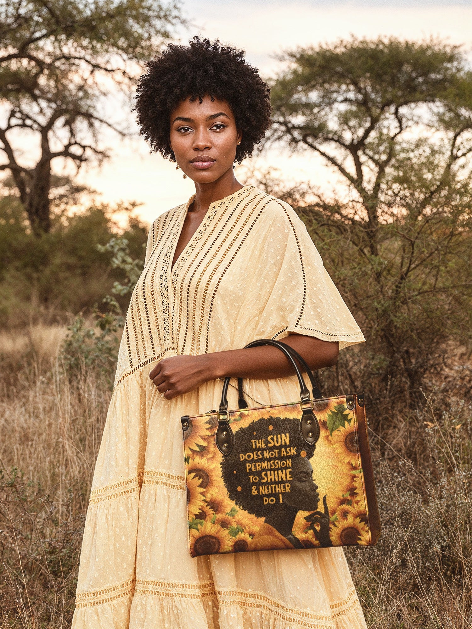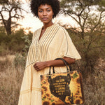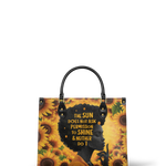Meet "Sunaya," more than a handbag—it's your everyday reminder to shine unapologetically. Crafted in luxurious leather with striking artwork, its vibrant sunflower design boldly proclaims: "The sun does not ask permission to shine & neither do I."