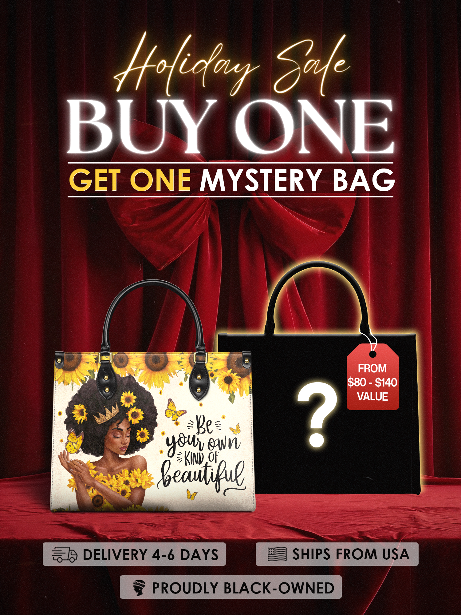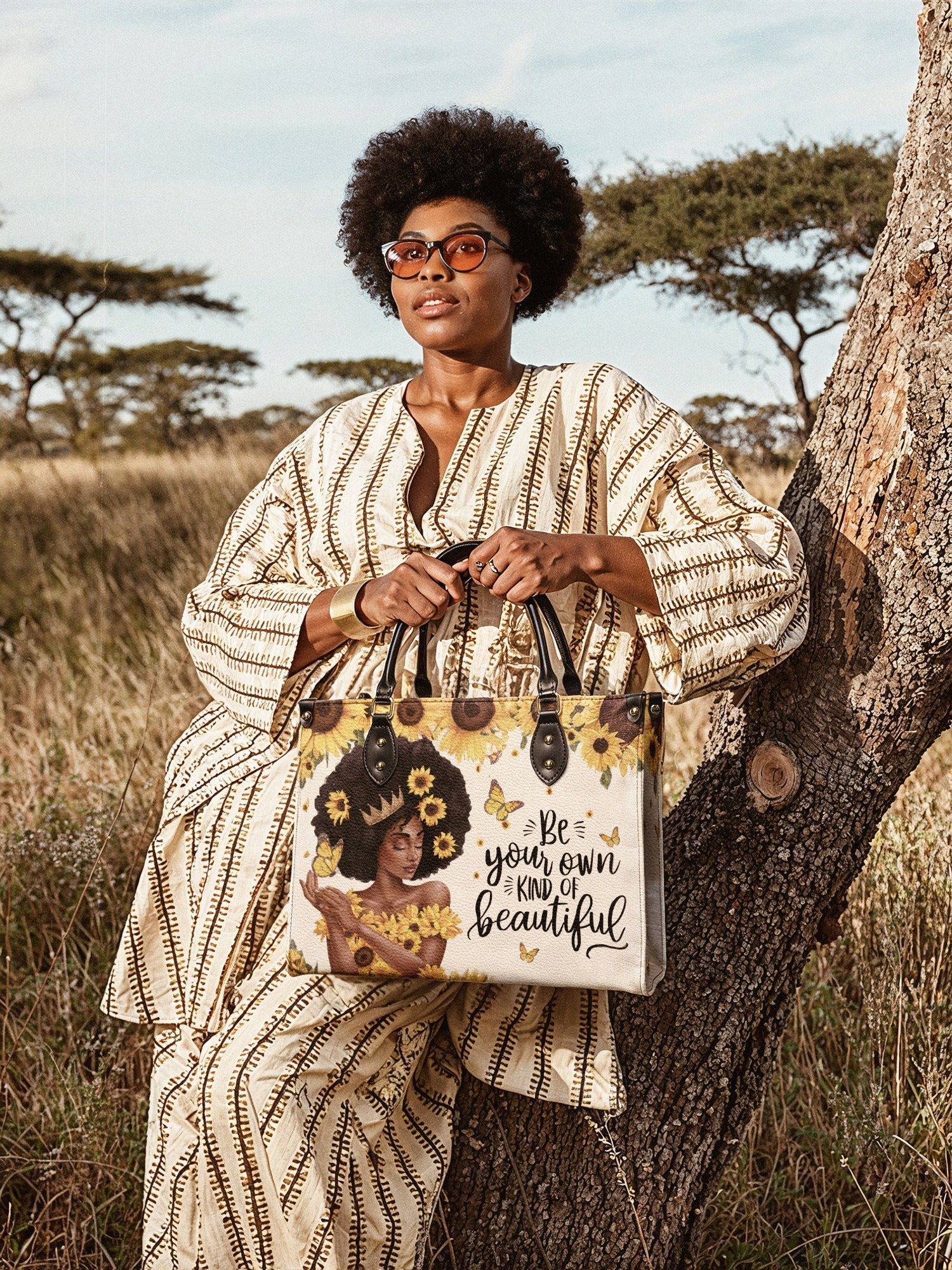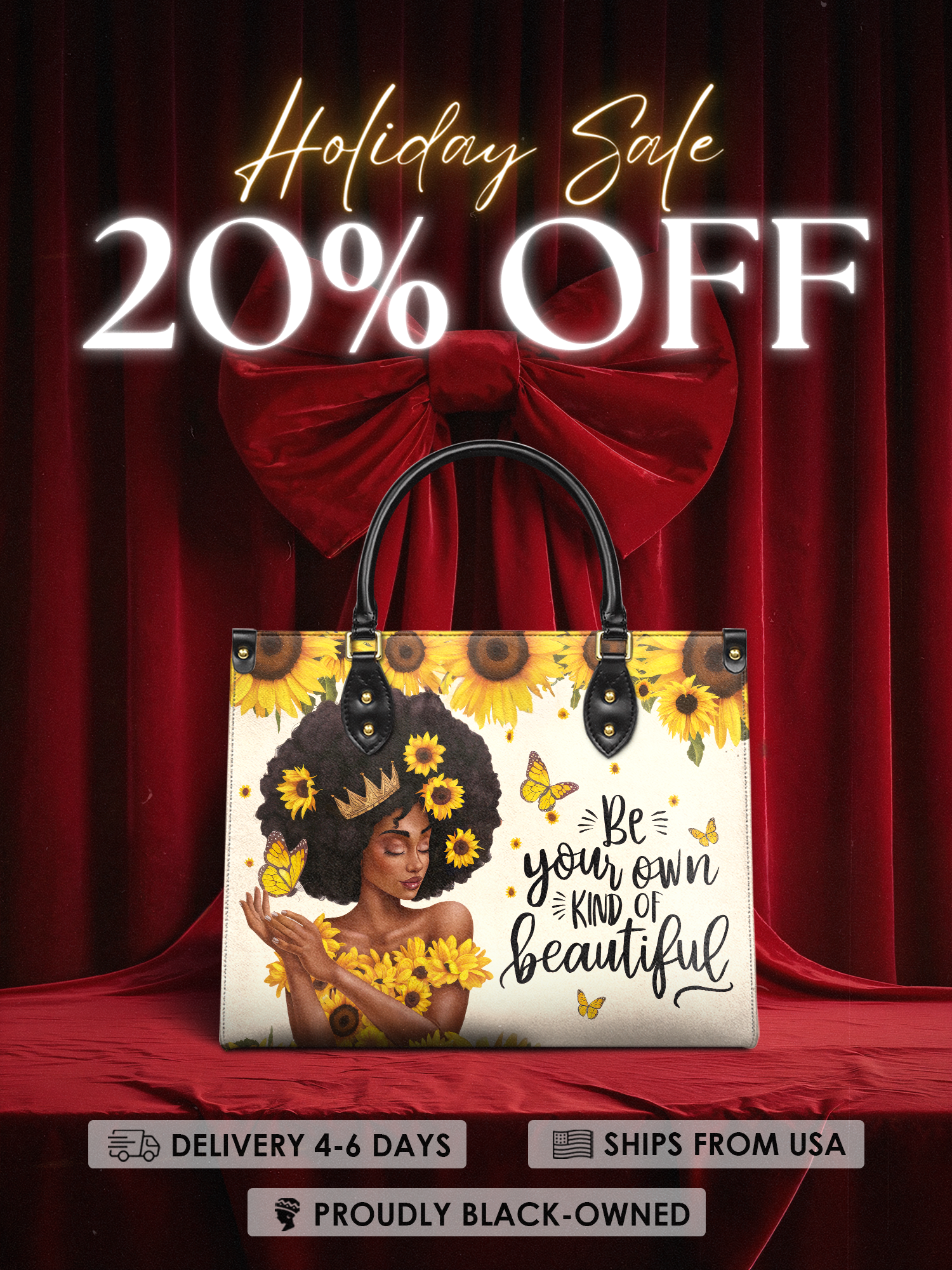 The Zuriya Handbag, inspired by the Swahili name Zuri, meaning "beautiful", is a celebration of Black women’s unique beauty and self-love. Featuring the empowering quote "Be your own kind of beautiful," this bag reminds you to embrace your radiance with confidence. Decorated with sunflowers, butterflies, and a regal queen, Zuriya is more than a handbag—it’s a statement of self-worth, pride, and the beauty of being unapologetically you. Carry it and shine!