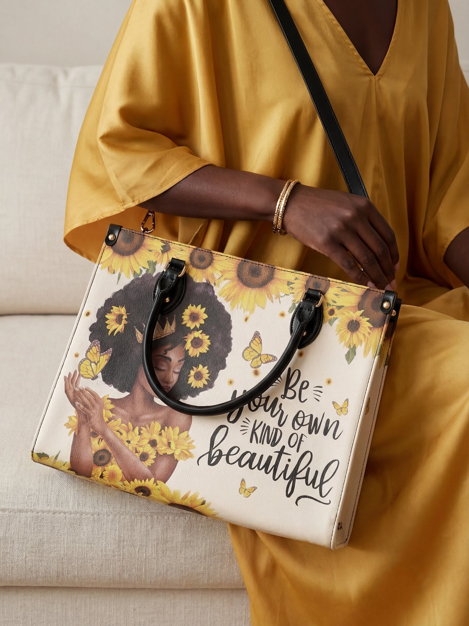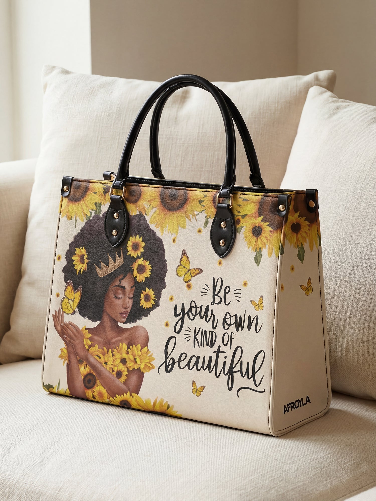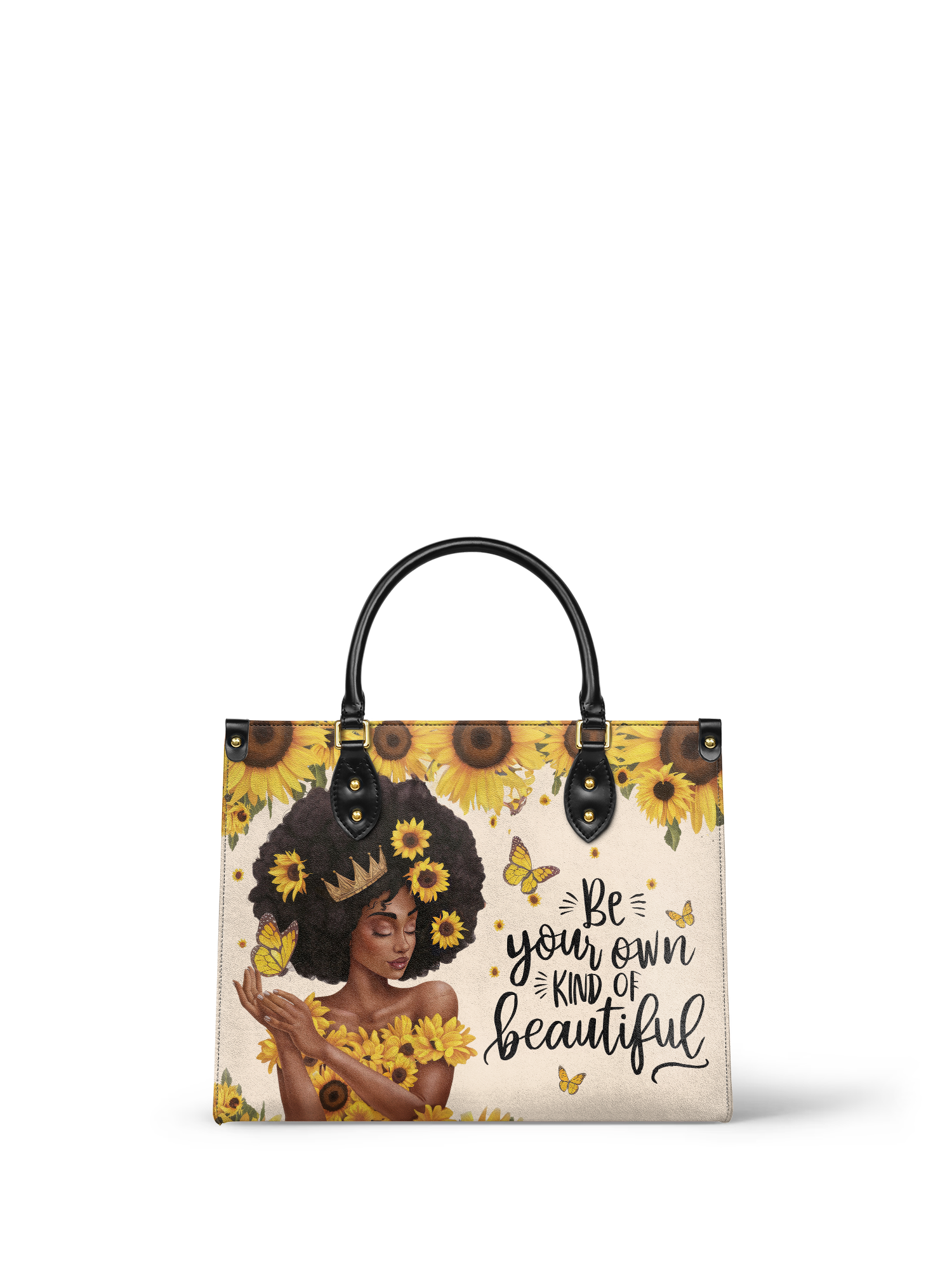 The Zuriya Handbag, inspired by the Swahili name Zuri, meaning "beautiful", is a celebration of Black women’s unique beauty and self-love. Featuring the empowering quote "Be your own kind of beautiful," this bag reminds you to embrace your radiance with confidence. Decorated with sunflowers, butterflies, and a regal queen, Zuriya is more than a handbag—it’s a statement of self-worth, pride, and the beauty of being unapologetically you. Carry it and shine!