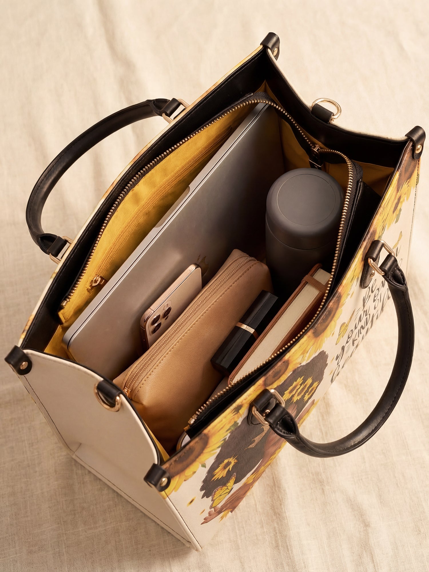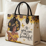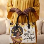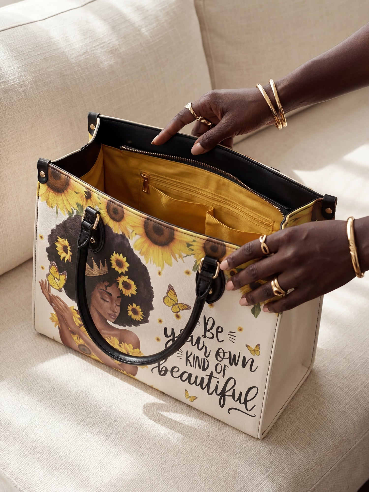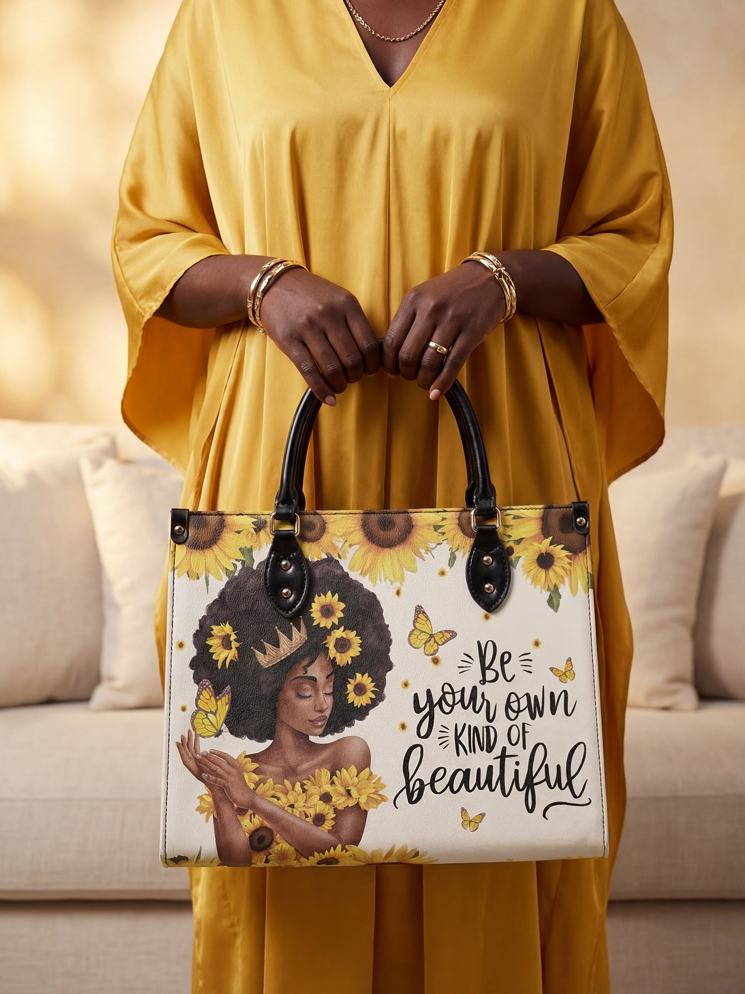 The Zuriya Handbag, inspired by the Swahili name Zuri, meaning "beautiful", is a celebration of Black women’s unique beauty and self-love. Featuring the empowering quote "Be your own kind of beautiful," this bag reminds you to embrace your radiance with confidence. Decorated with sunflowers, butterflies, and a regal queen, Zuriya is more than a handbag—it’s a statement of self-worth, pride, and the beauty of being unapologetically you. Carry it and shine!