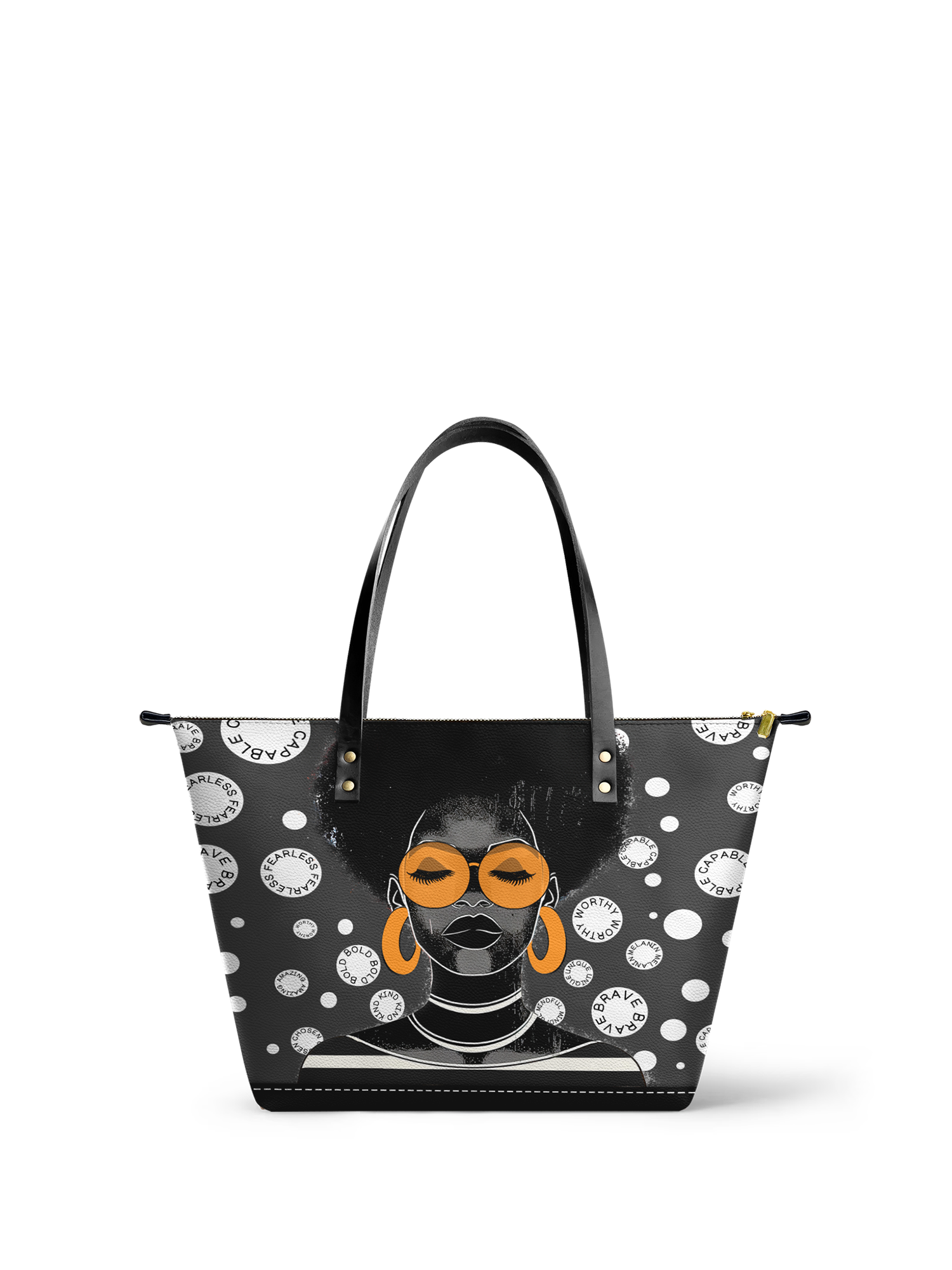 The Fahari Leather Tote is a bold statement in motion. With striking contrast, fierce orange accents, and affirmations like ‘Fearless,’ ‘Capable,’ and ‘Worthy’ wrapped around her crown, this tote is made for women who own every space they enter. Roomy, radiant, and rooted in pride—this is power you carry.