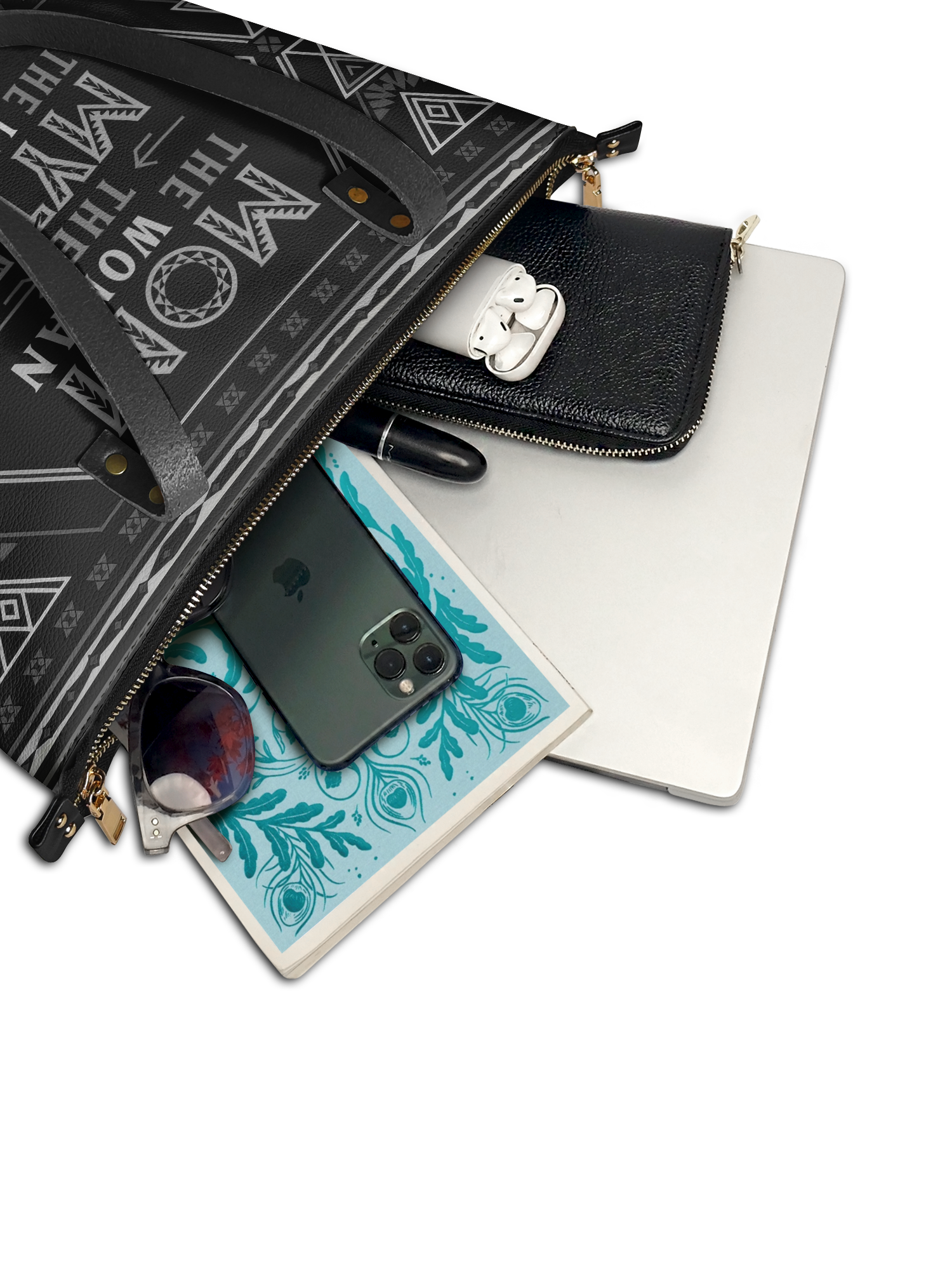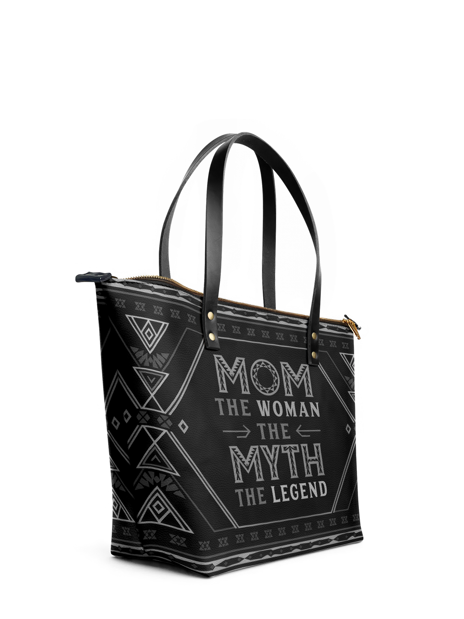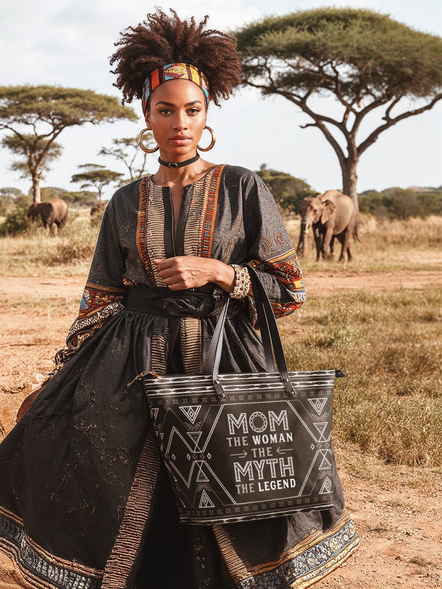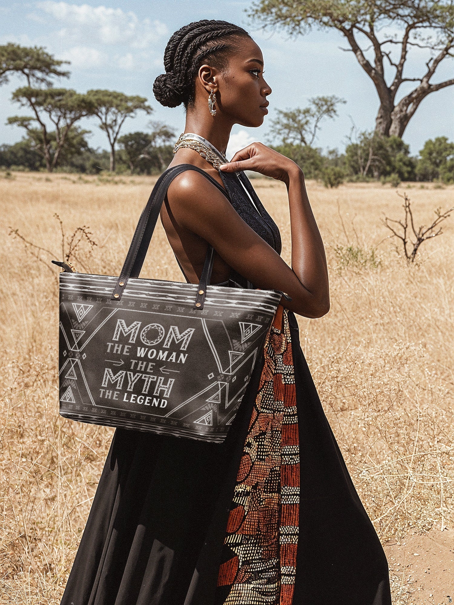 Featuring the bold quote "Mom – The Woman, The Myth, The Legend!", this tote is a powerful reminder of a mother's influence, resilience, and enduring greatness. Designed with Afrocentric patterns in a sleek black finish, it embodies both cultural pride and timeless elegance—a perfect statement piece for moms who lead, nurture, and inspire.