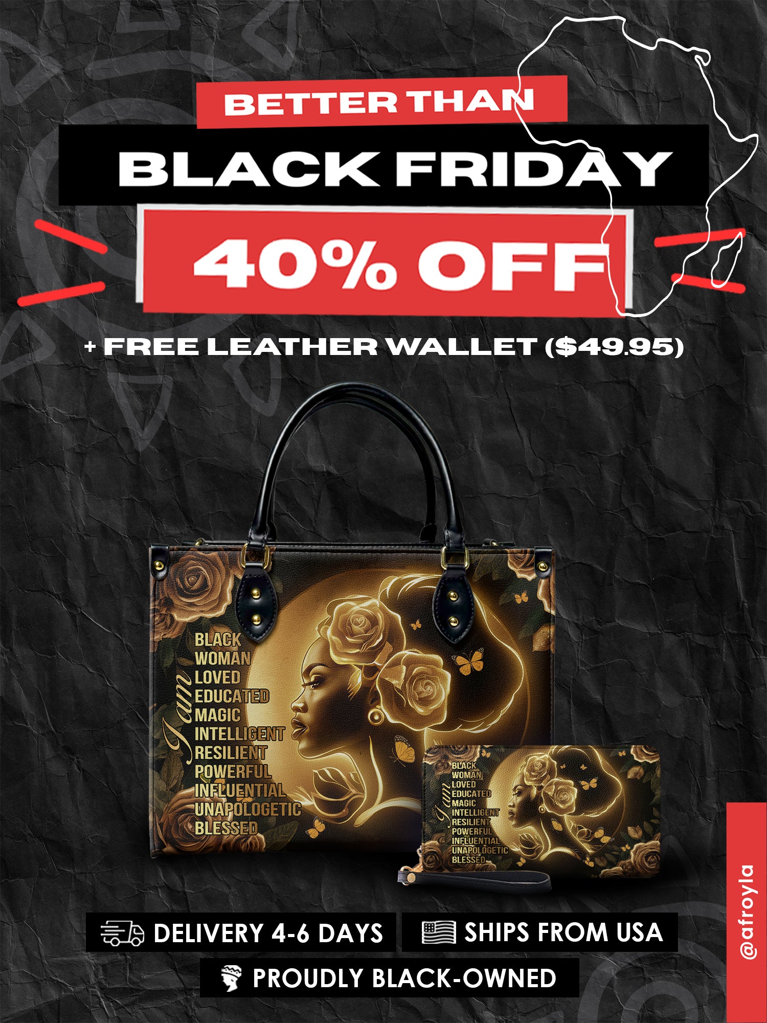 “Lumina” means light—and this bag is exactly that. A radiant tribute to everything a Black woman is: LOVED. EDUCATED. MAGIC. RESILIENT. UNAPOLOGETIC. Designed in deep, golden tones and crowned with blooming roses, the artwork doesn’t just glow—it speaks. It speaks to your strength. Your story. Your soul. Every time you carry it, it’s not just fashion—it’s a declaration. A daily reminder that you are powerful, you are influential, and you were never meant to shrink.