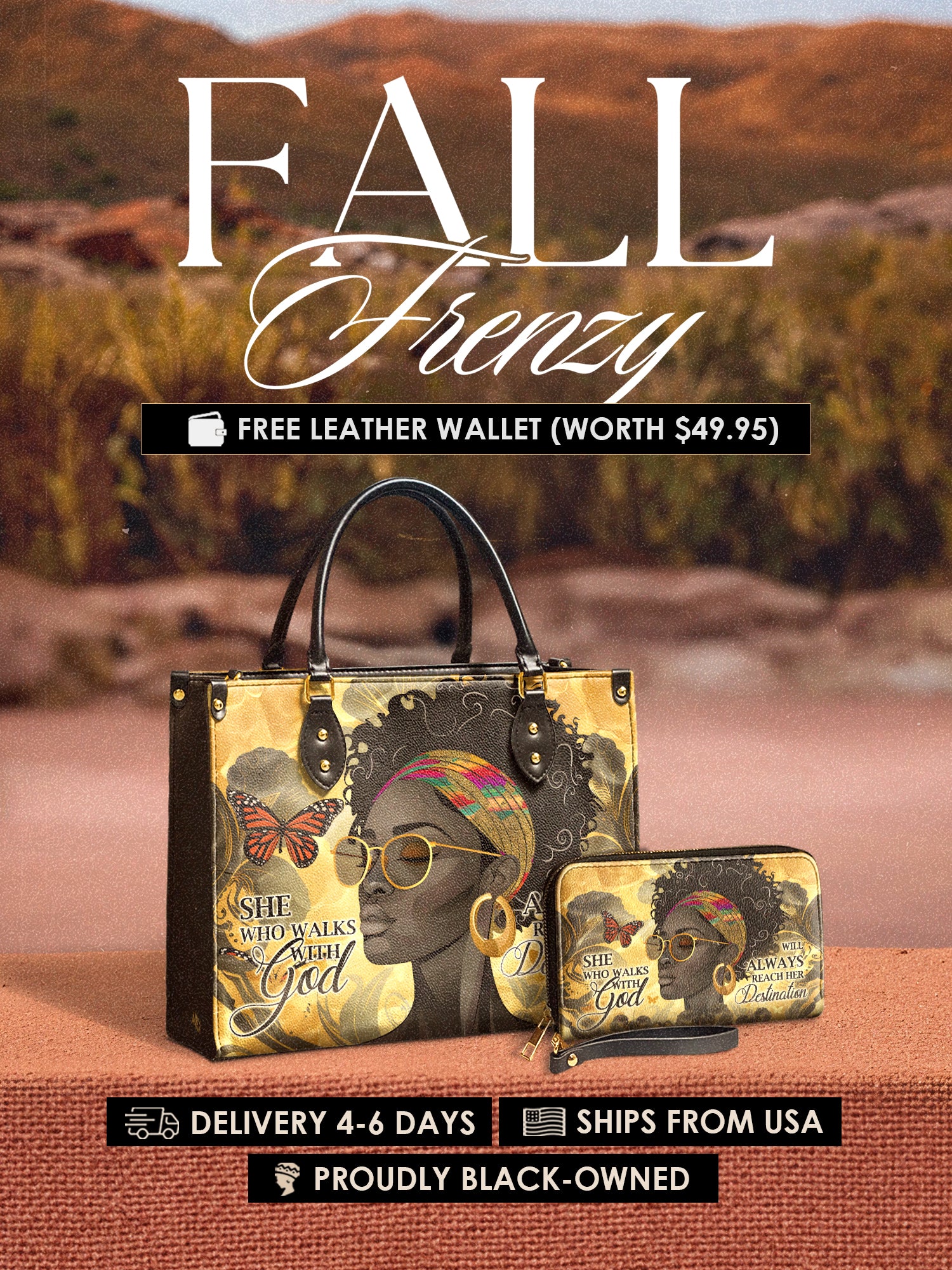 The Njia Handbag, meaning "path" in Swahili, symbolizes faith and strength. Featuring the quote "She who walks with God will always reach her destination" this design celebrates the resilience of Black women. The artwork showcases a regal Black woman with bold confidence, surrounded by butterflies representing transformation. Made from premium leather, this handbag is a stylish reminder that faith leads the way.