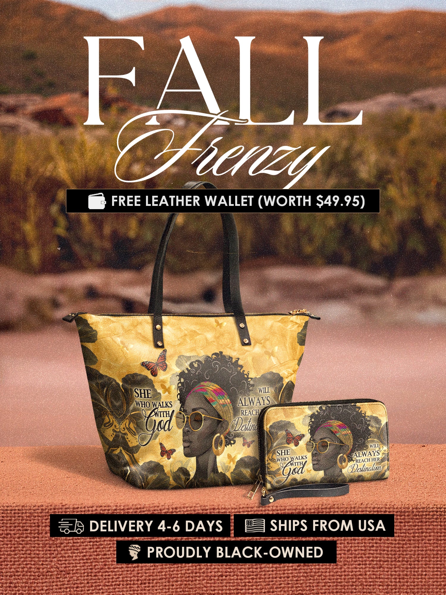 The Njia Tote Bag, meaning "path" in Swahili, embodies faith and perseverance. Featuring the quote "She who walks with God will always reach her destination," this elegant tote celebrates the strength of Black women. With a striking design of a confident Black queen surrounded by golden florals and butterflies, this premium leather bag is a reminder that faith paves the way.