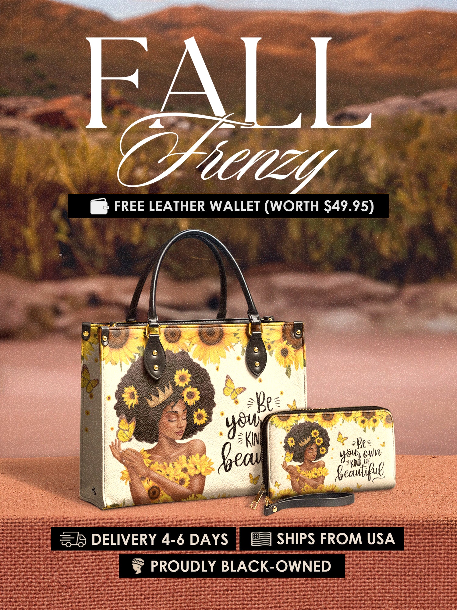 The Zuriya Handbag, inspired by the Swahili name Zuri, meaning "beautiful", is a celebration of Black women’s unique beauty and self-love. Featuring the empowering quote "Be your own kind of beautiful," this bag reminds you to embrace your radiance with confidence. Decorated with sunflowers, butterflies, and a regal queen, Zuriya is more than a handbag—it’s a statement of self-worth, pride, and the beauty of being unapologetically you. Carry it and shine!