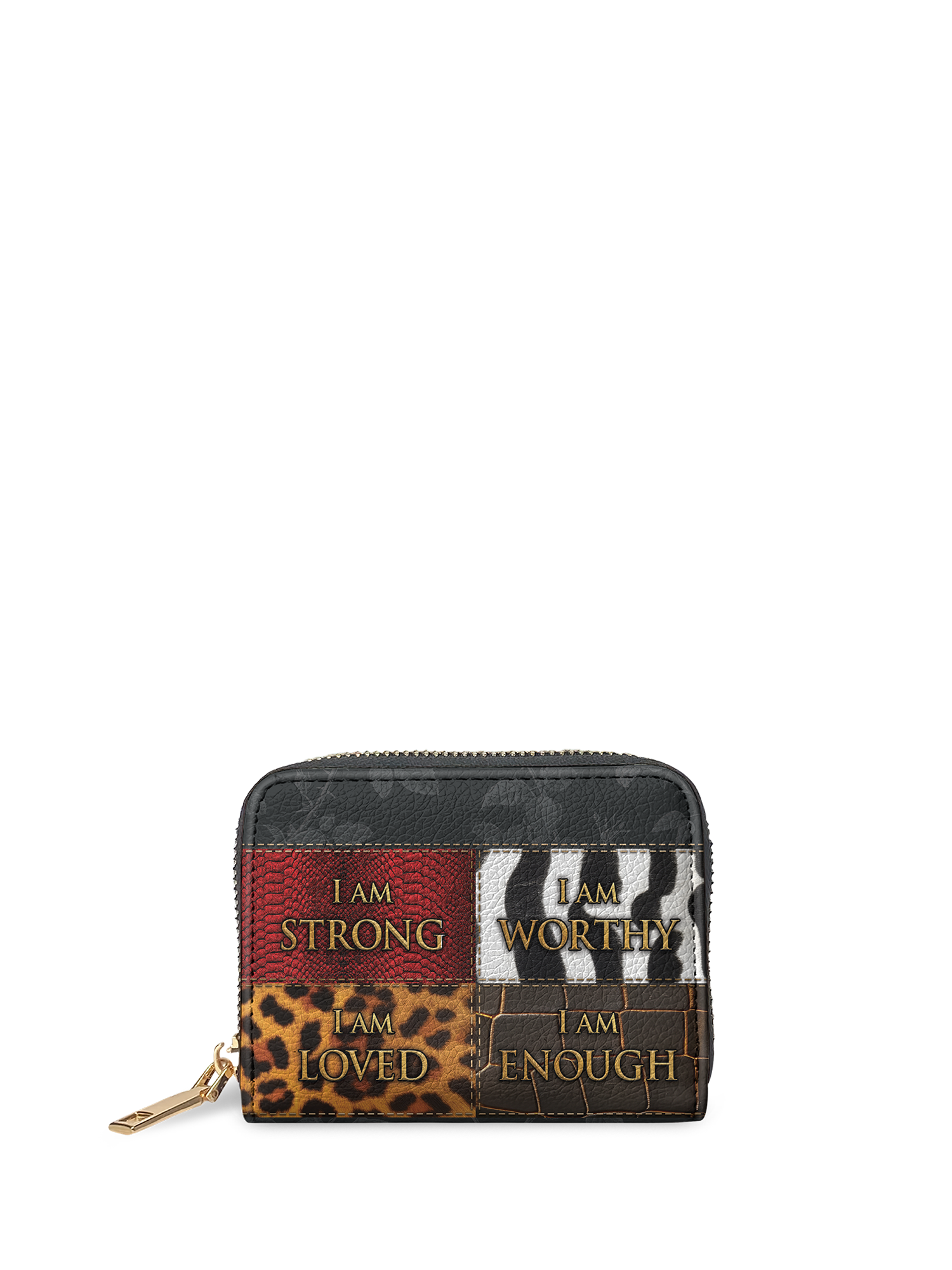 The Kadia Mini Wallet is small in size, mighty in message. Wrapped in fierce textures and golden affirmations—‘I am strong. I am worthy. I am loved. I am enough.’—this zip-around beauty keeps your essentials secure and your confidence louder than ever. Because your truth belongs in every pocket.