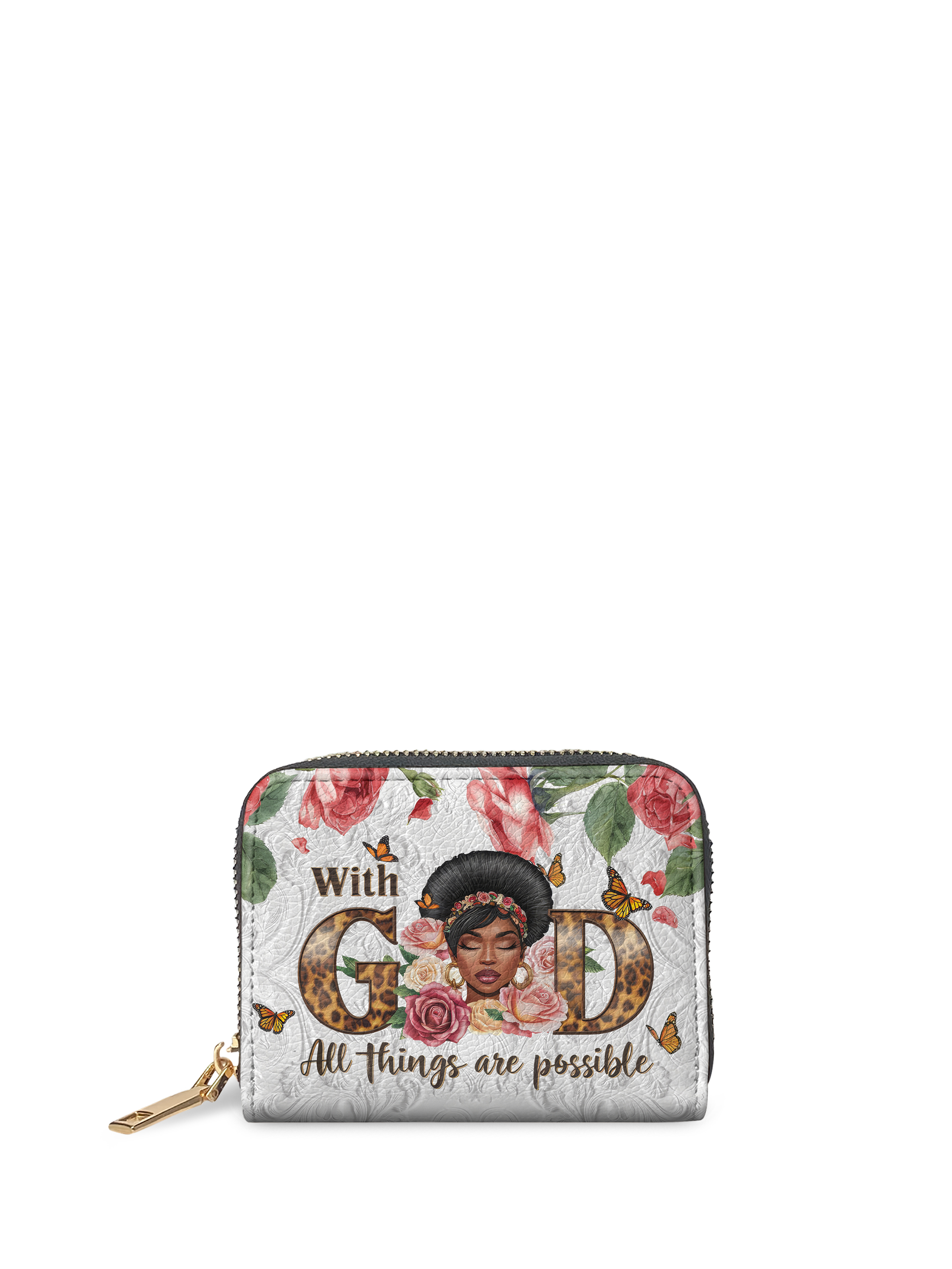 Wrapped in a serene palette of soft whites, lush greens, and delicate rose pinks, this wallet isn’t just a place to carry your essentials—it’s a declaration. Right in the center, bold leopard-print letters spell out “GOD” surrounded by blooming florals, golden butterflies, and a radiant Black woman crowned with roses, eyes closed in peace. Below it reads, “With God, all things are possible.” Because sis—you already know they are.