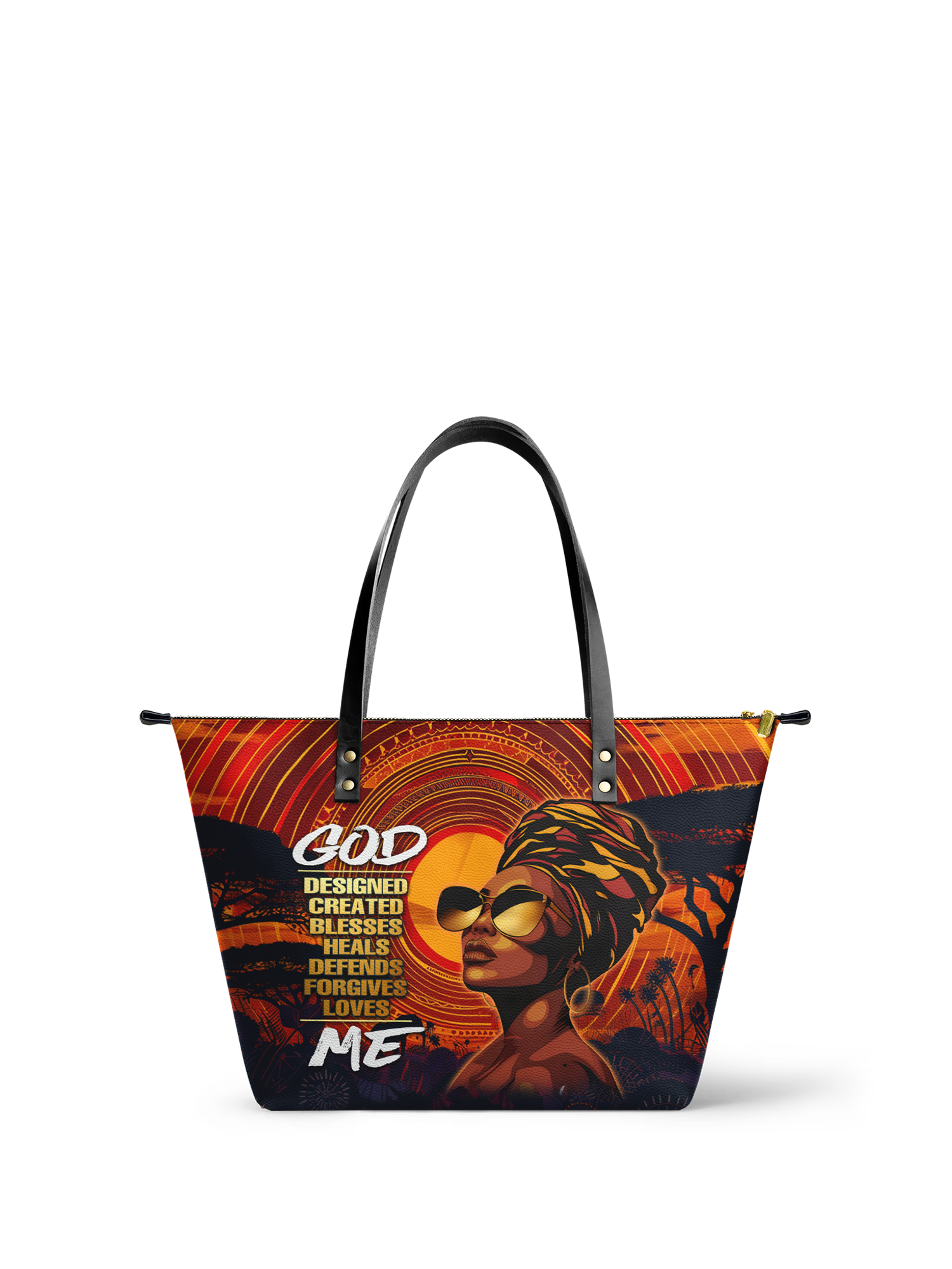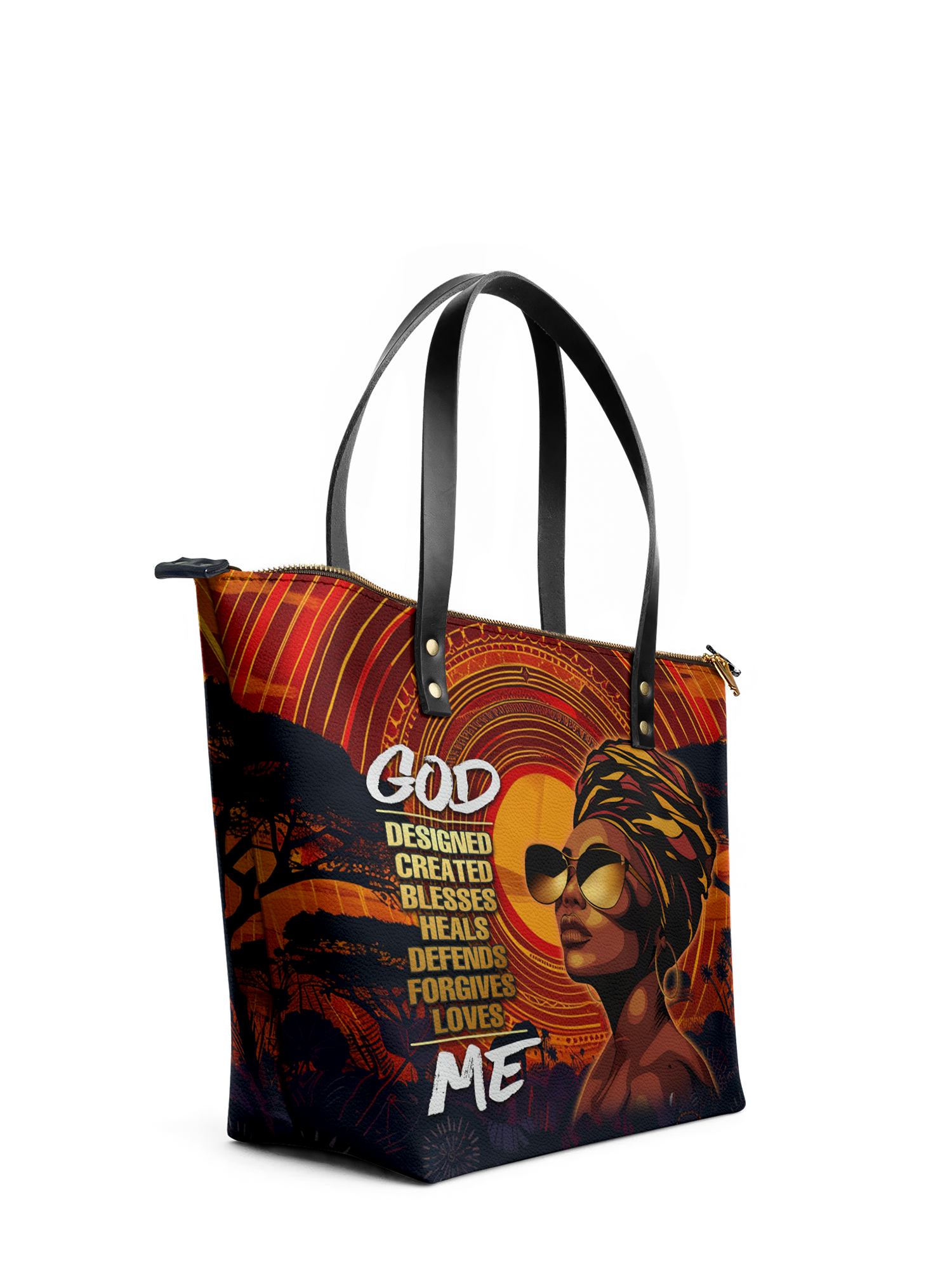 Named after the Ghanaian word for “gratitude,” the Aseda tote is a bold, sacred tribute to every Black woman who walks in divine favor. With radiant colors inspired by the African sunrise and a message that speaks straight to your soul—God designed, created, blesses, heals, defends, forgives, and LOVES me—this bag isn't just about style. It’s about identity. It’s about faith. It’s about remembering who you are and whose you are. Spacious, powerful, unforgettable—just like you. Carry this, and carry the light within you.
