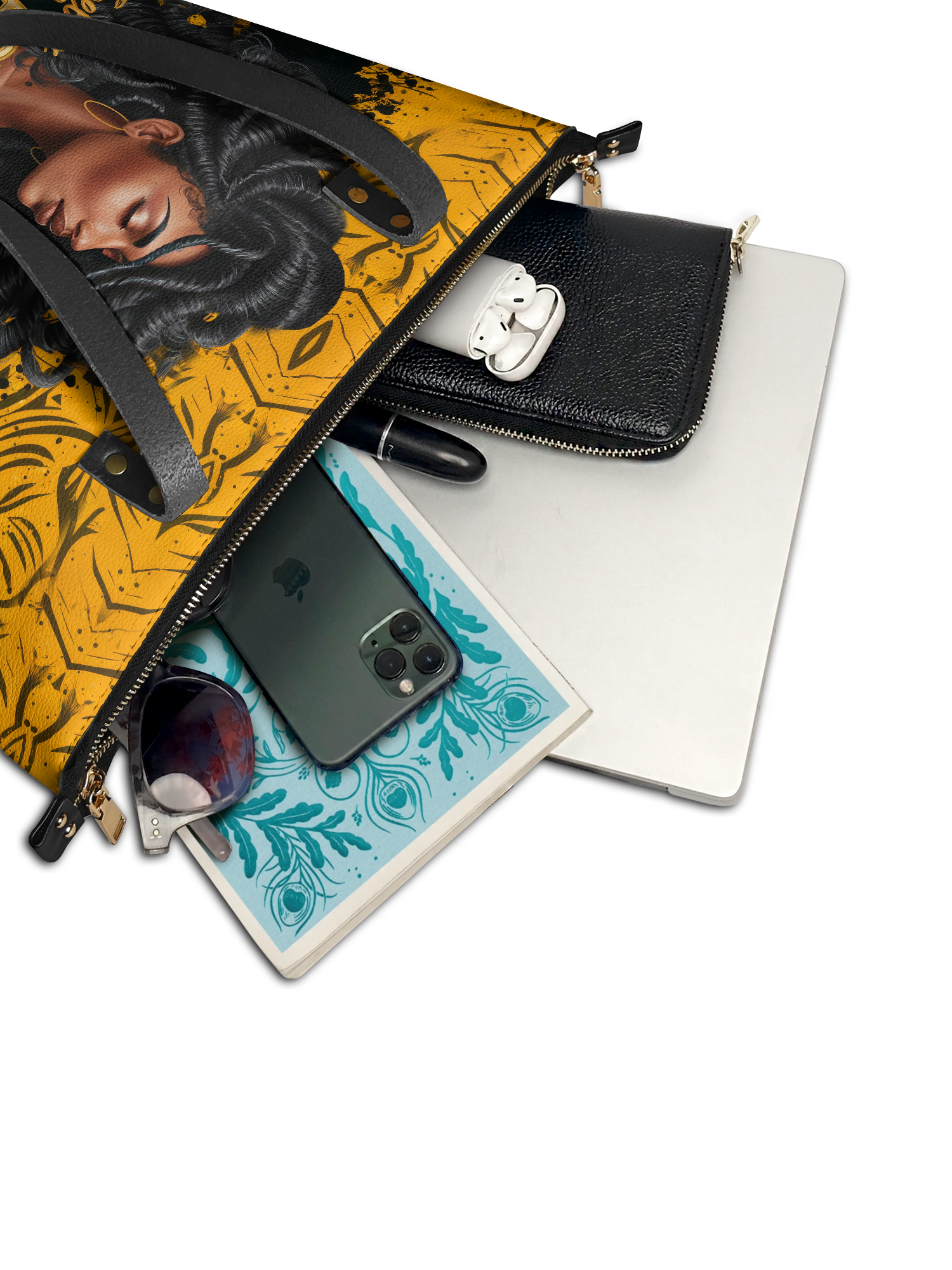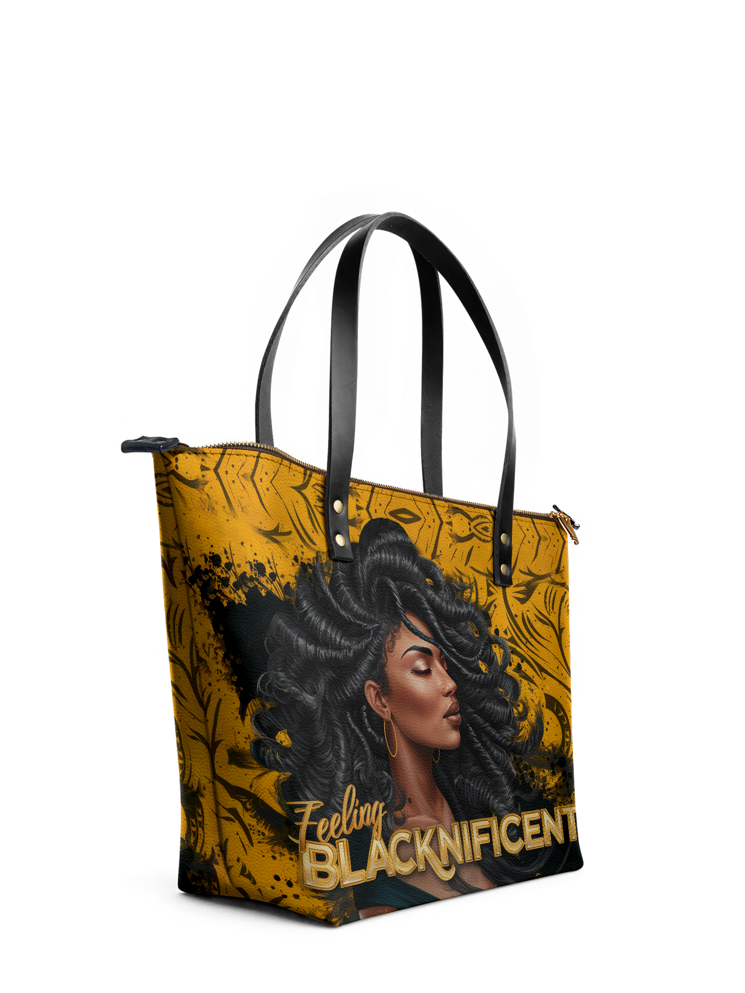 Blacknificent isn’t just a word—it’s a whole way of life. This tote was made for the days you walk out knowing exactly who you are. Loud, proud, and dipped in gold. It’s giving royalty, it’s giving confidence, it’s giving don’t even try me today. From the crown of coils to the unapologetic stare, every inch of this bag is Black girl magic on full display. Not soft-spoken. Not subtle. Just pure power wrapped in beauty—and ready to be carried by someone who knows she’s the moment.