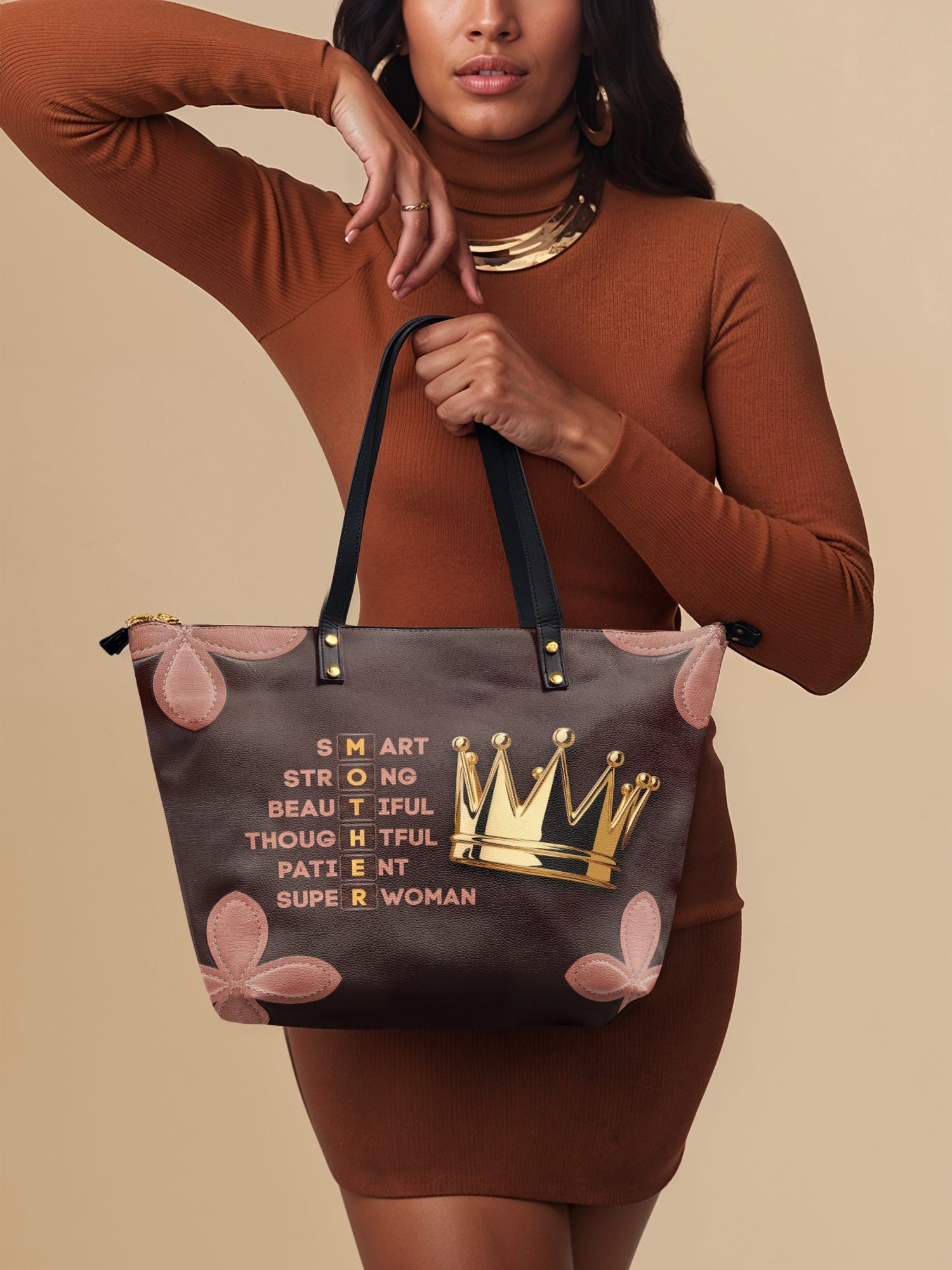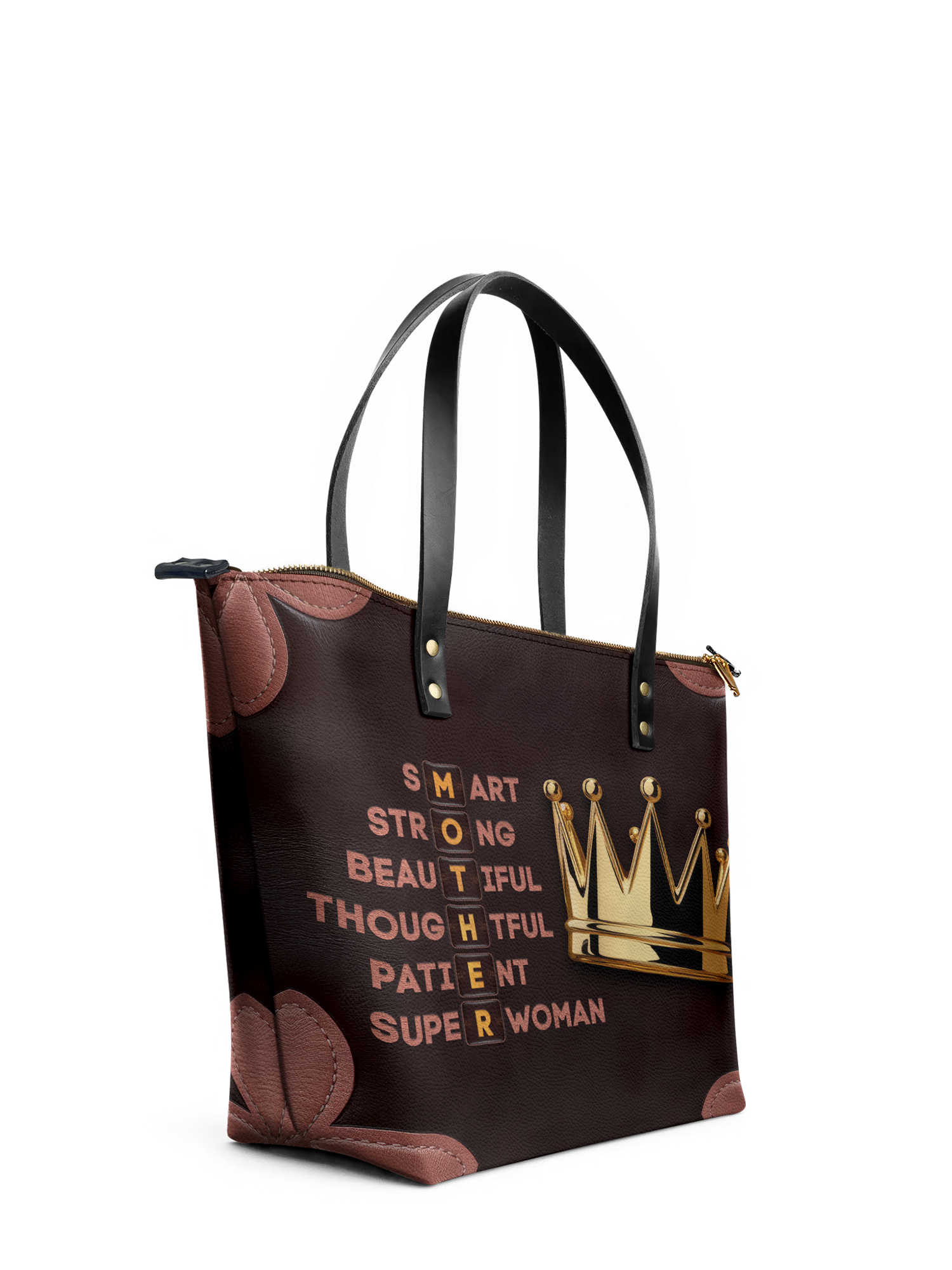 The design features powerful words—Smart, Strong, Beautiful, Thoughtful, Patient, Superwoman—all forming the word "Mother", a reminder of the qualities that define Black moms. The golden crown symbolizes the royalty and honor of motherhood, making this tote a statement of pride, love, and self-worth.