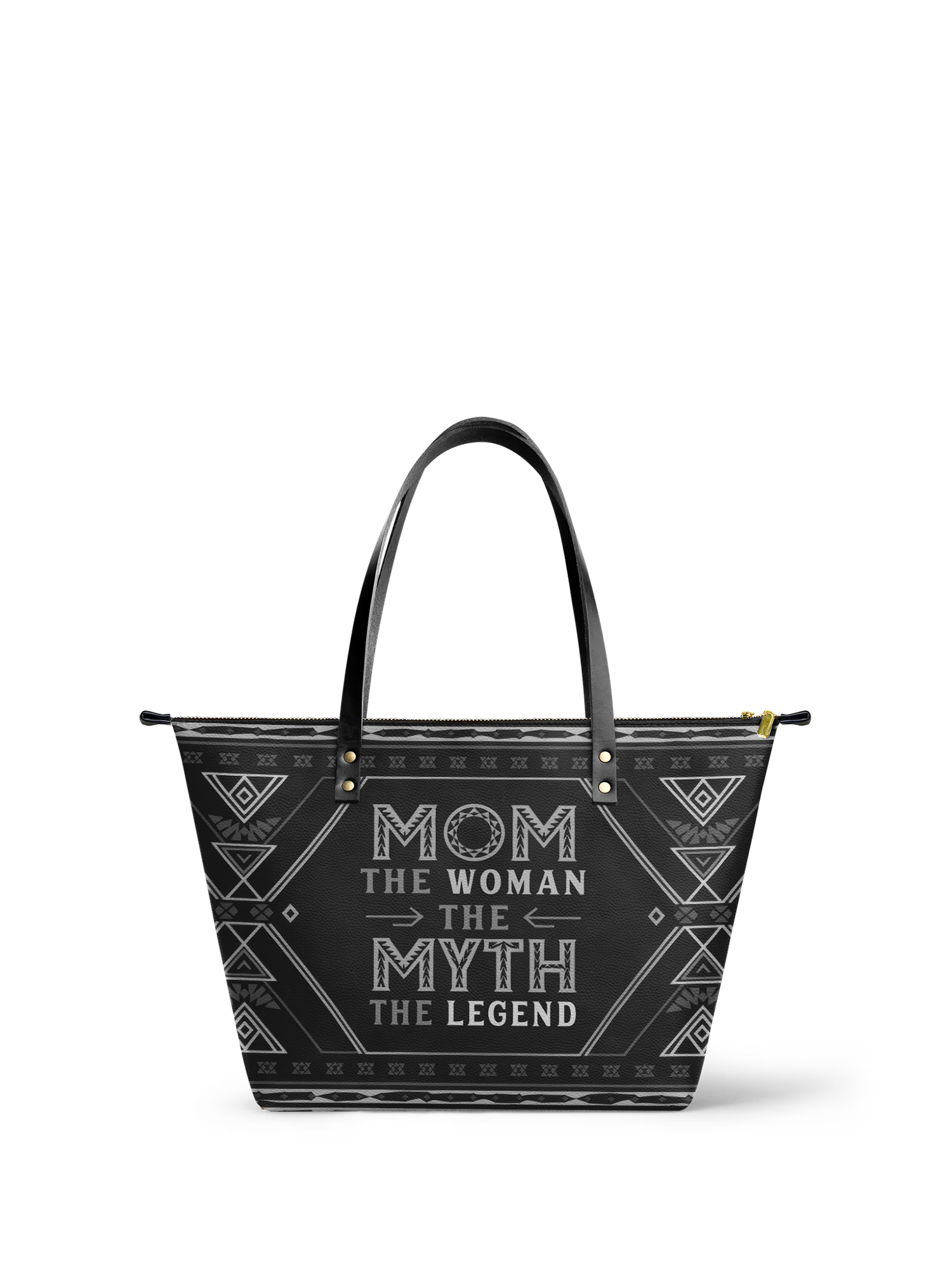 Featuring the bold quote "Mom – The Woman, The Myth, The Legend!", this tote is a powerful reminder of a mother's influence, resilience, and enduring greatness. Designed with Afrocentric patterns in a sleek black finish, it embodies both cultural pride and timeless elegance—a perfect statement piece for moms who lead, nurture, and inspire.