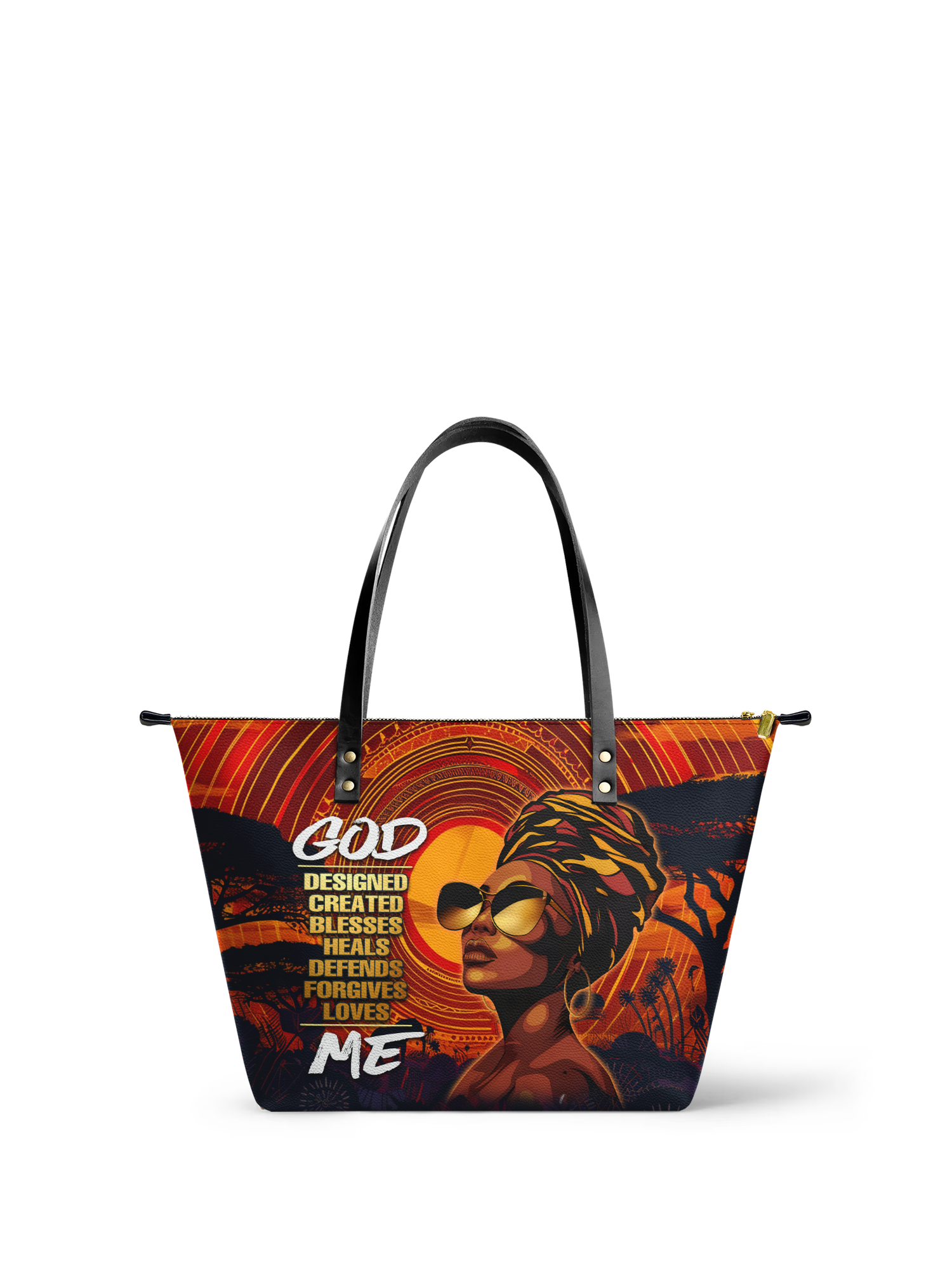 Named after the Ghanaian word for “gratitude,” the Aseda tote is a bold, sacred tribute to every Black woman who walks in divine favor. With radiant colors inspired by the African sunrise and a message that speaks straight to your soul—God designed, created, blesses, heals, defends, forgives, and LOVES me—this bag isn't just about style. It’s about identity. It’s about faith. It’s about remembering who you are and whose you are. Spacious, powerful, unforgettable—just like you. Carry this, and carry the light within you.
