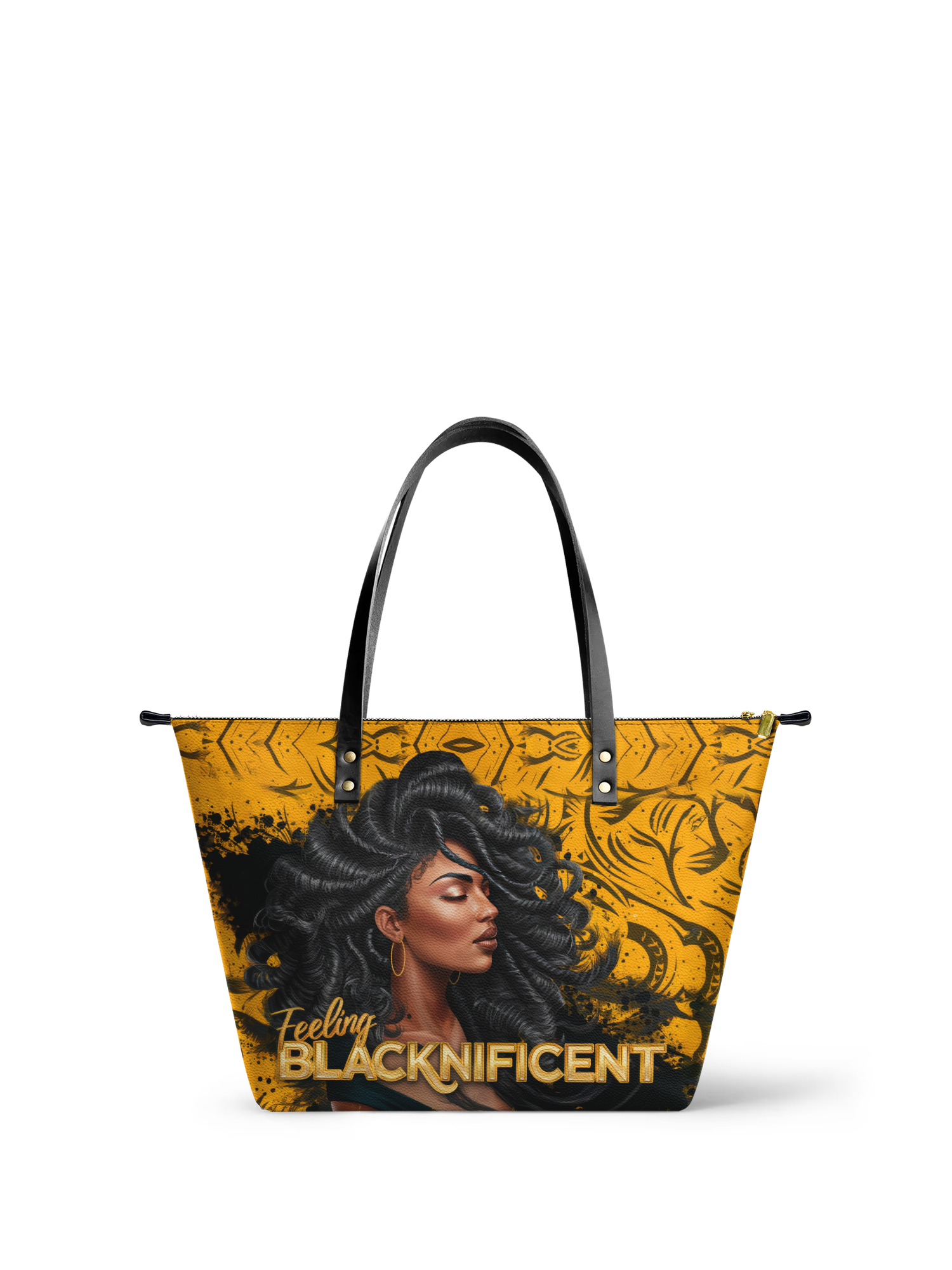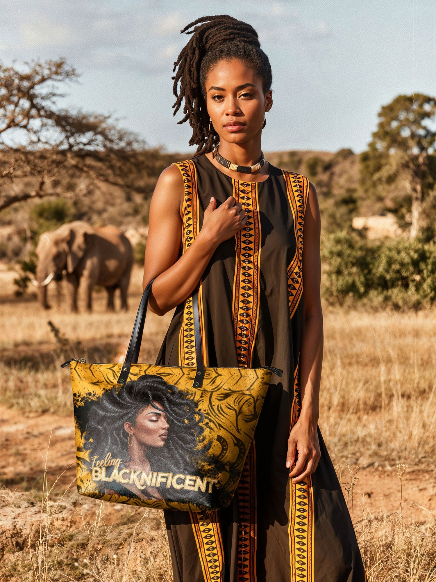 Blacknificent isn’t just a word—it’s a whole way of life. This tote was made for the days you walk out knowing exactly who you are. Loud, proud, and dipped in gold. It’s giving royalty, it’s giving confidence, it’s giving don’t even try me today. From the crown of coils to the unapologetic stare, every inch of this bag is Black girl magic on full display. Not soft-spoken. Not subtle. Just pure power wrapped in beauty—and ready to be carried by someone who knows she’s the moment.