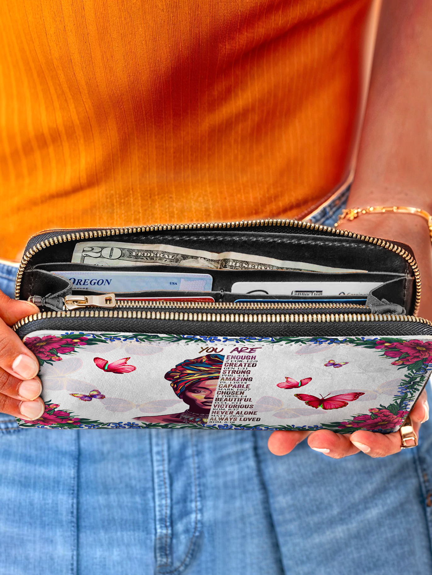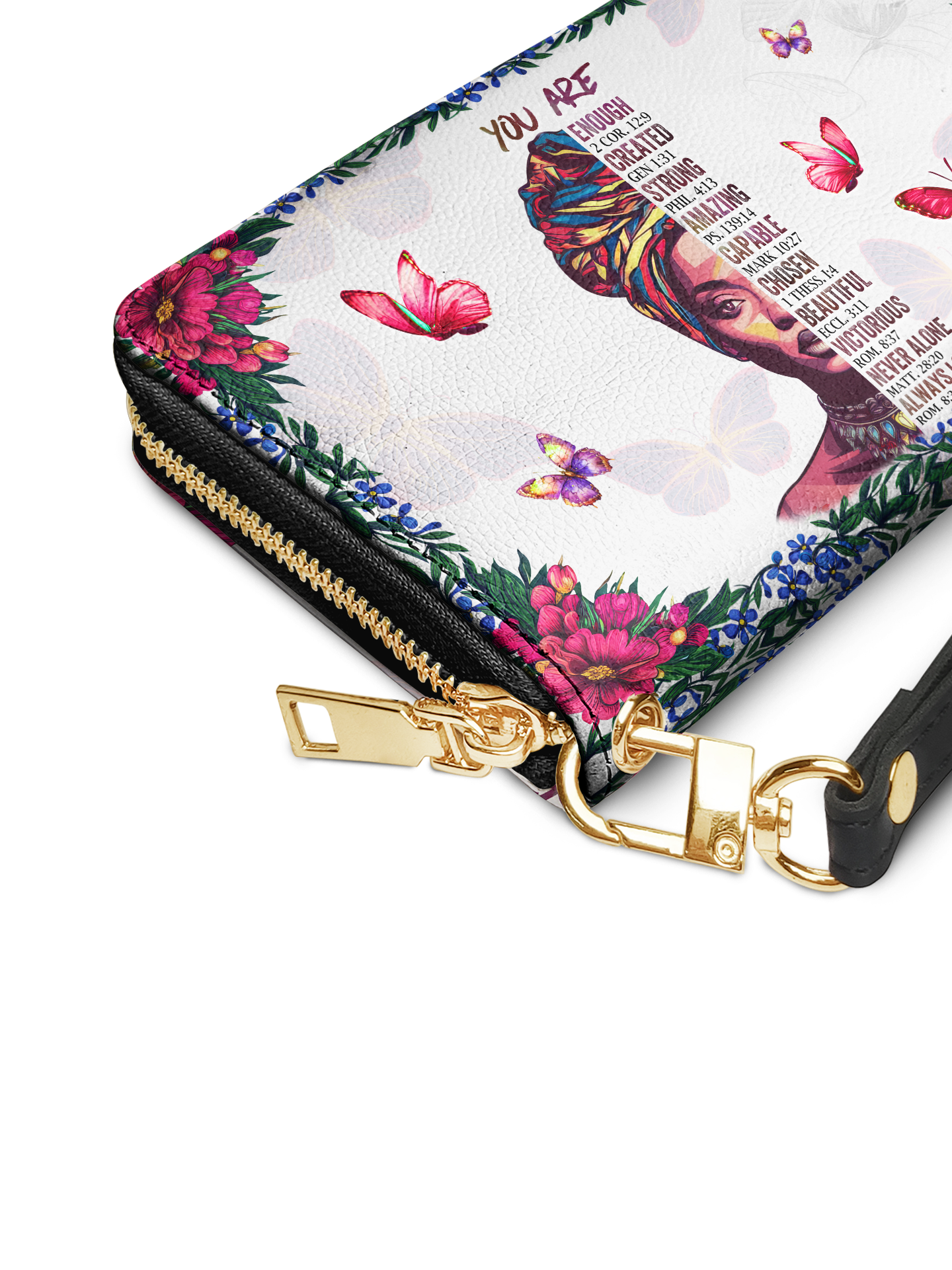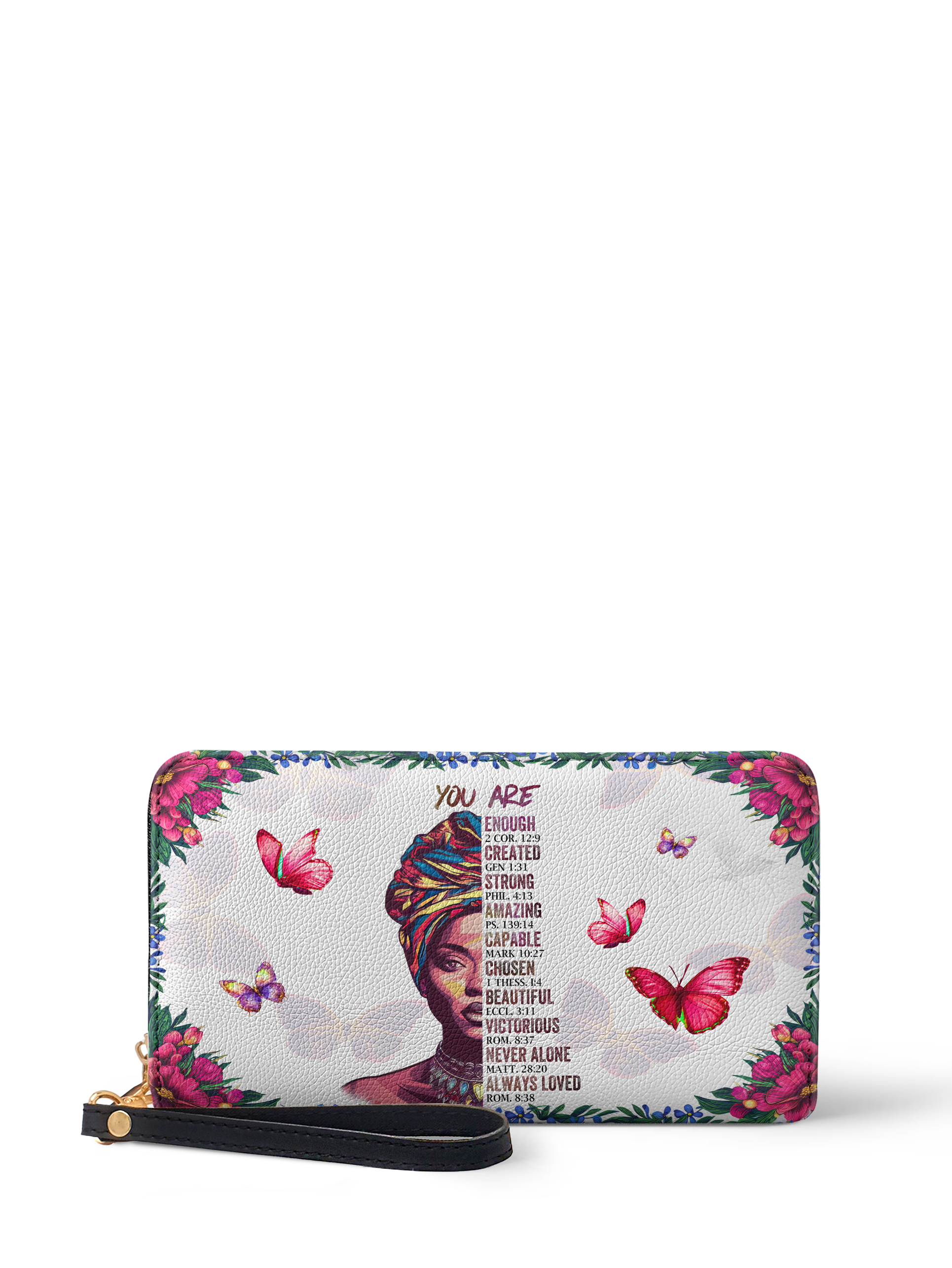 The Imani Affirmation wallet in white is soft, spiritual, and full of light. Surrounded by florals and fluttering butterflies, it carries powerful words that lift you up—scripture-backed truths about who you are and Whose you are. It’s more than a wallet—it’s a quiet moment of strength and grace you can hold onto all day. A little peace, a little power, right in your palm.