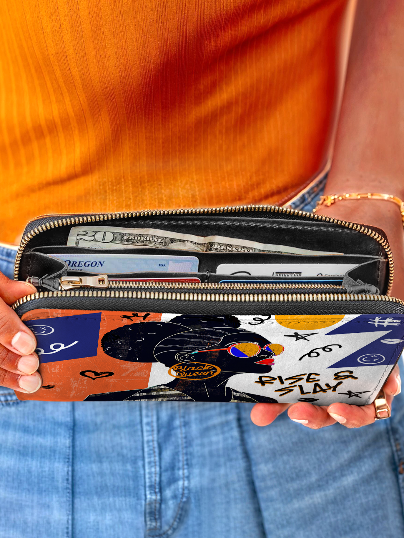 This wallet is spacious and stylish, holding beauty essentials, cash, cards, and a phone with ease.