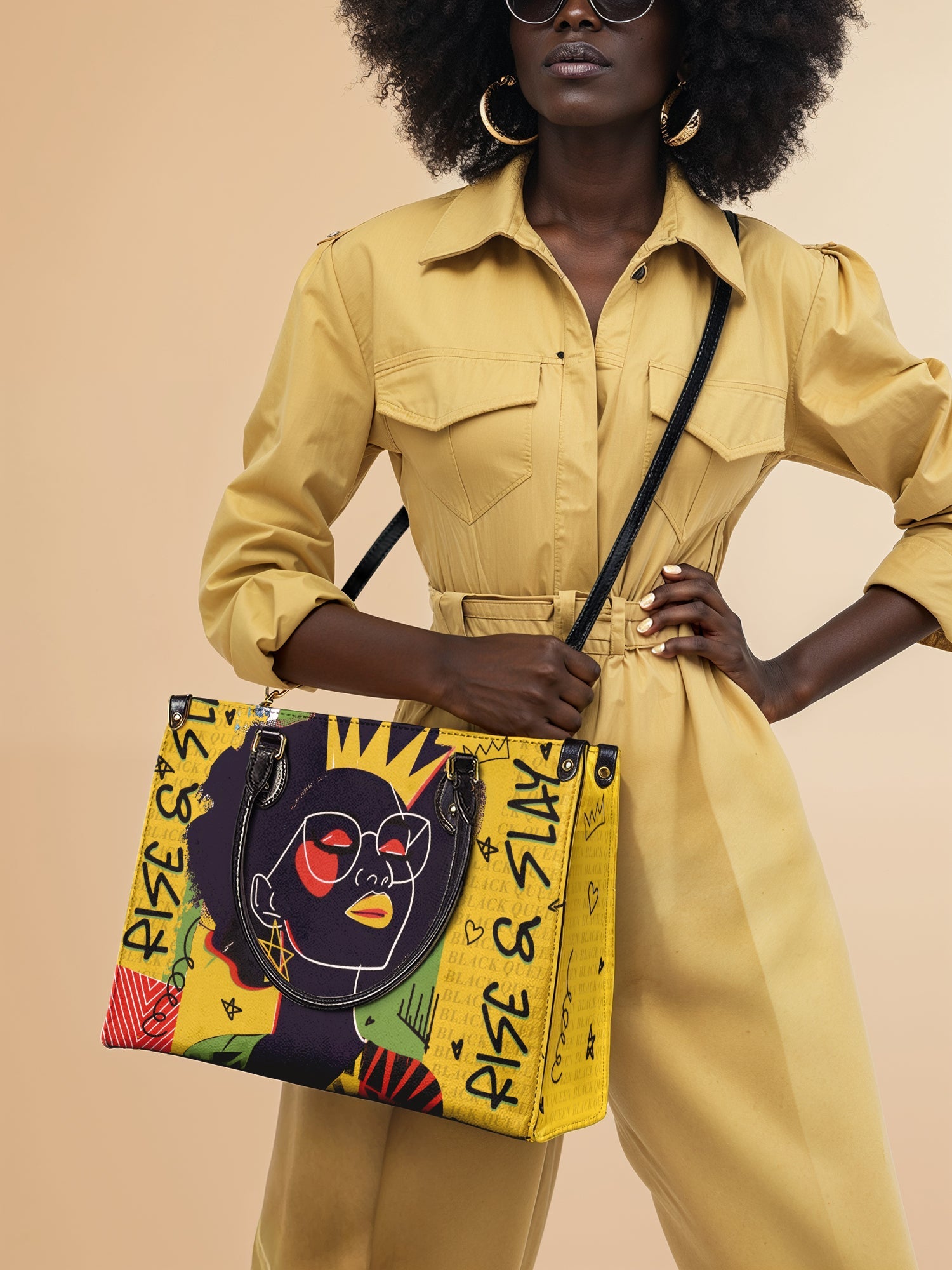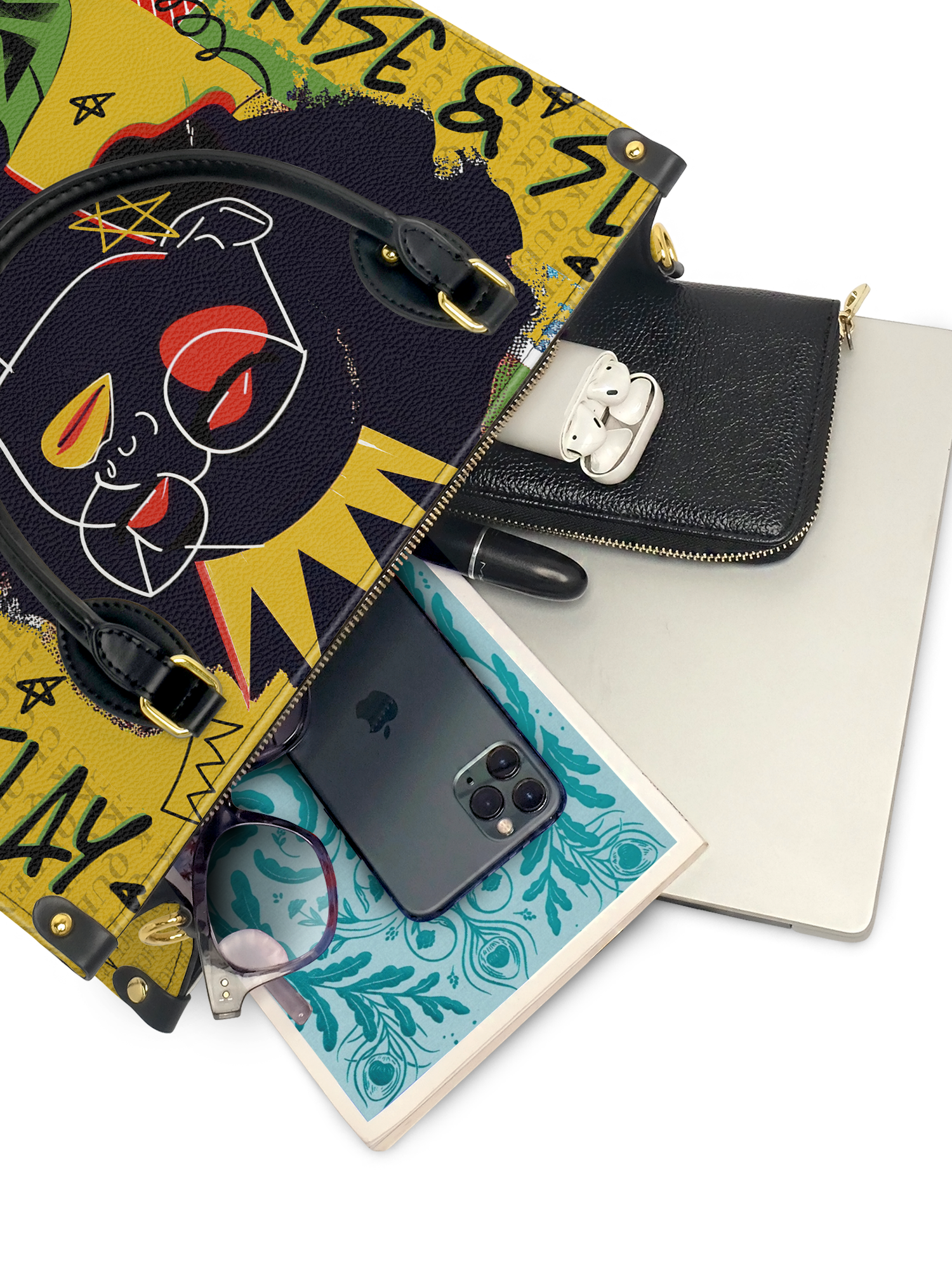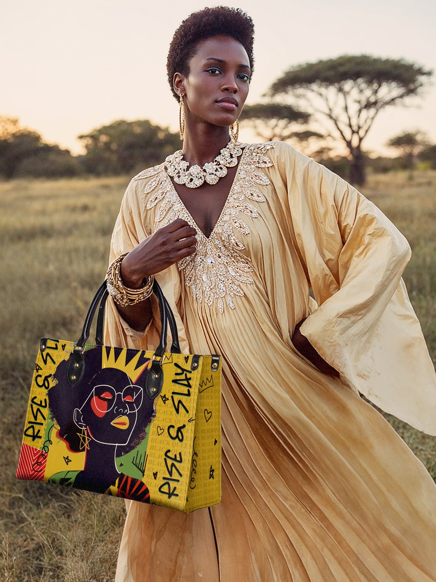 Featuring the empowering Rise & Slay artwork, this bag is a tribute to the courage and beauty of Black queens. Spacious, stylish, and unapologetically bold—carry Aina as a daily reminder to rise, slay, and shine with confidence!