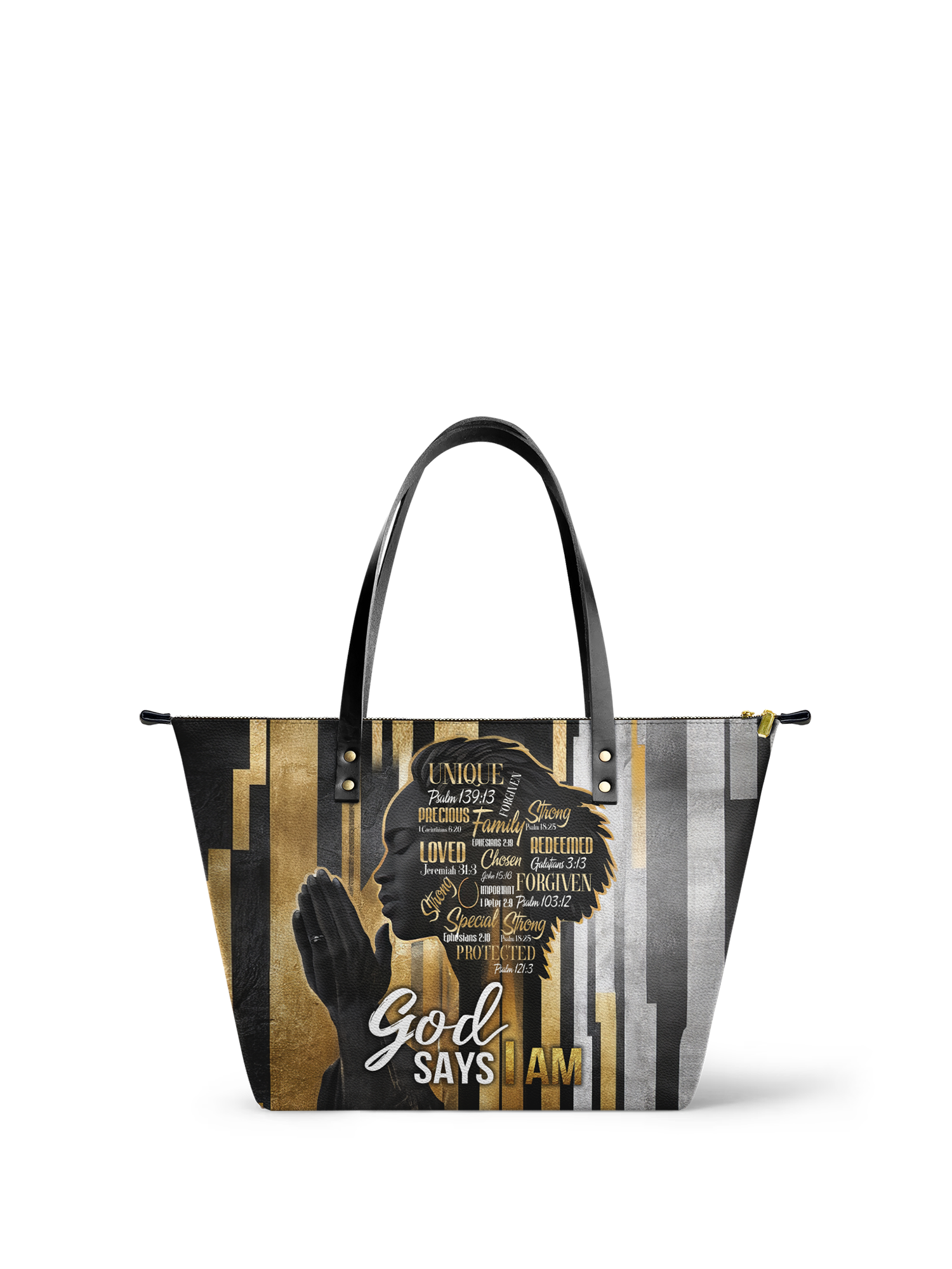 The Amara Leather Tote is faith you can carry. Drenched in gold and grace, it features a silhouette in prayer and scriptures that affirm who God says you are—Chosen. Redeemed. Protected. Strong. Whether at church or out in the world, this tote reminds you: you walk covered and called.