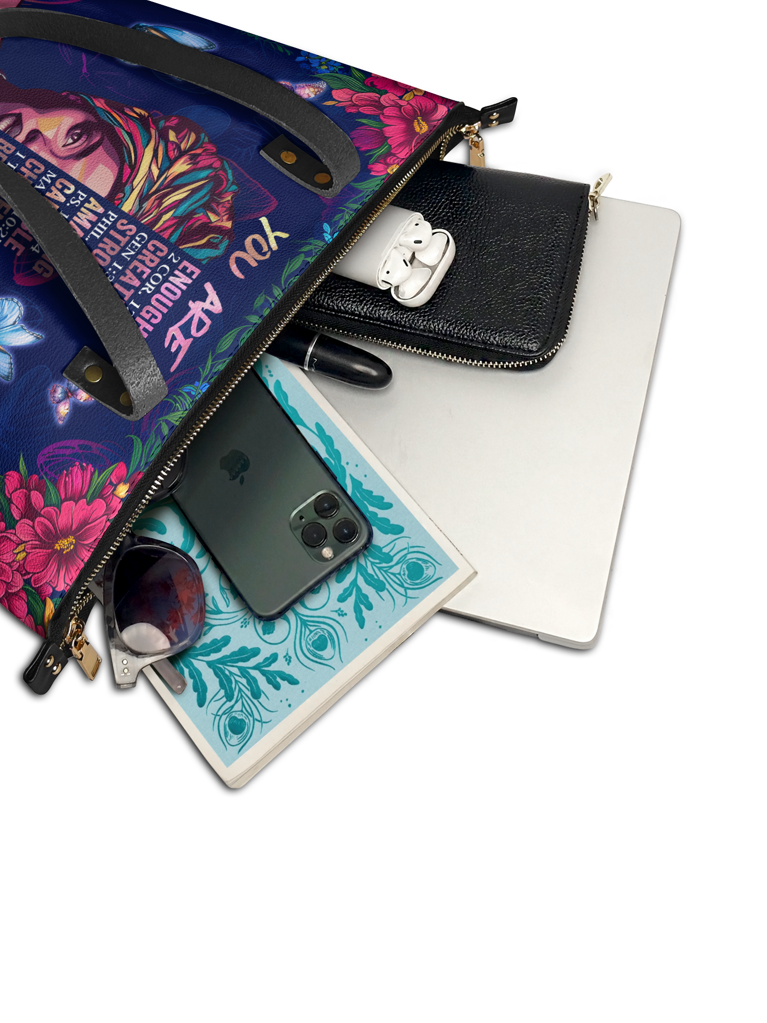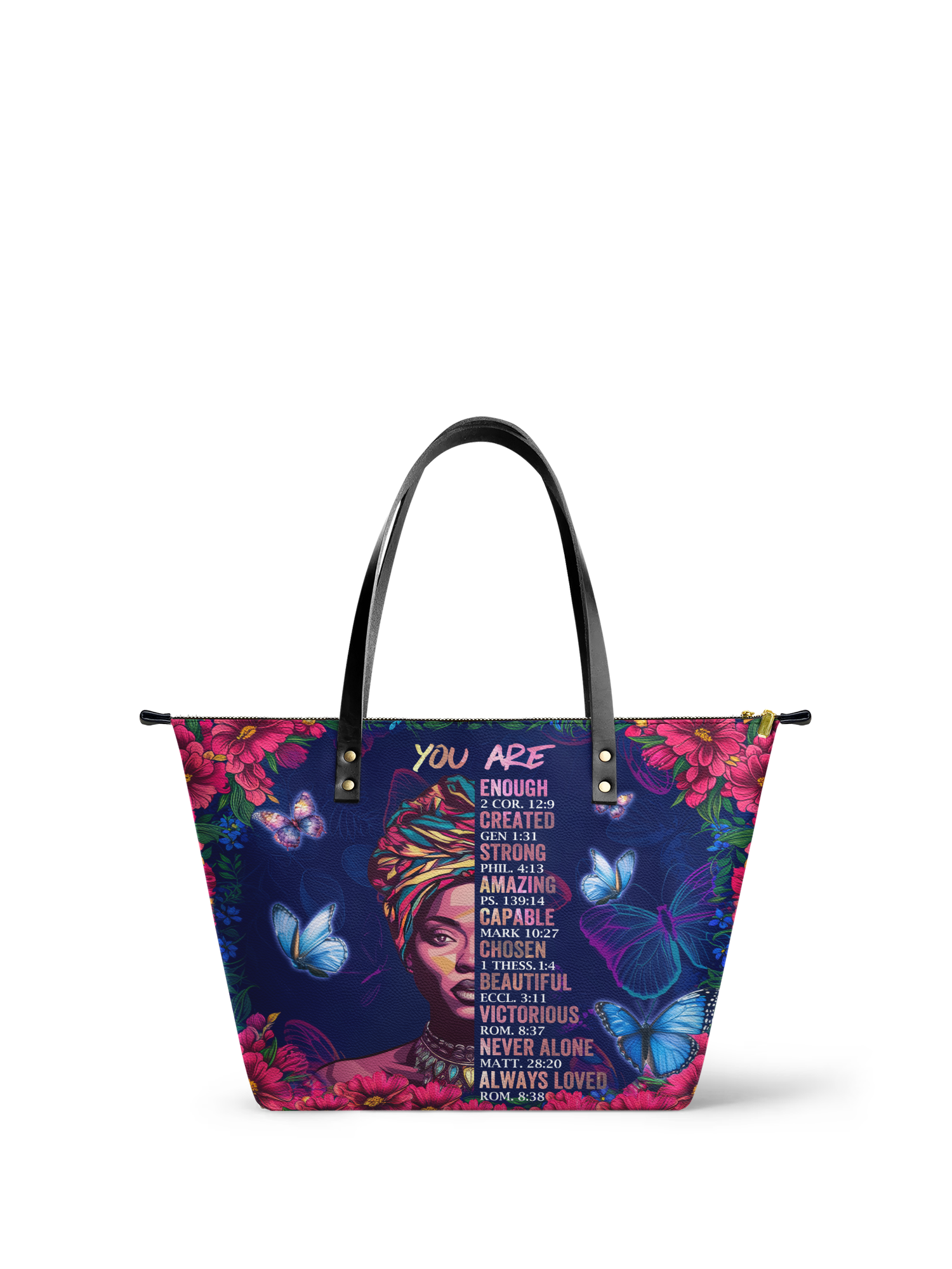 The "Imani Affirmation Tote" is a powerful reminder of the strength, beauty, and faith that Black women carry every day. Featuring uplifting Bible verses, it celebrates the truth that you are enough, strong, beautiful, and never alone. Adorned with vibrant butterflies and flowers, this tote blends style and divine inspiration, making it a perfect companion for carrying your essentials while empowering you to rise and shine.