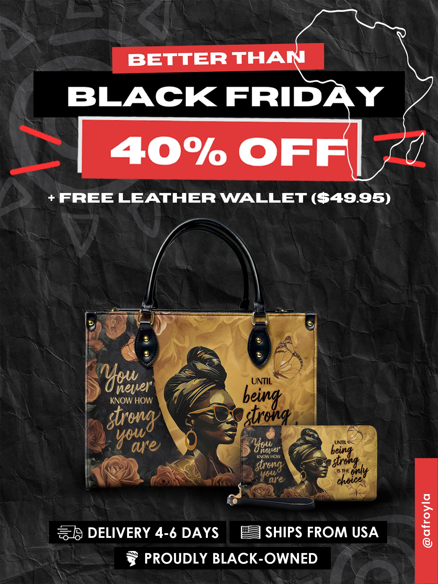 The "Siyanda" Strong Handbag is a tribute to the unshakable strength of Black women. Featuring the powerful quote "You never know how strong you are until being strong is the only choice," this bag is a reminder of resilience, courage, and grace. With rich golden tones and elegant artwork, "Siyanda" is more than a handbag—it’s a statement of power and perseverance. Carry it with pride, because your strength is unmatched.