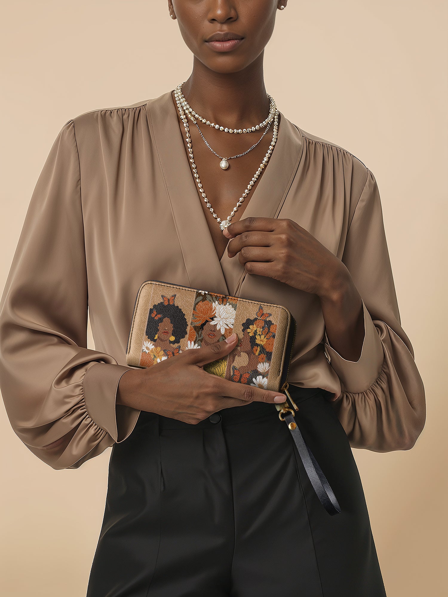 This wallet is spacious and stylish, holding beauty essentials, cash, cards, and a phone with ease.