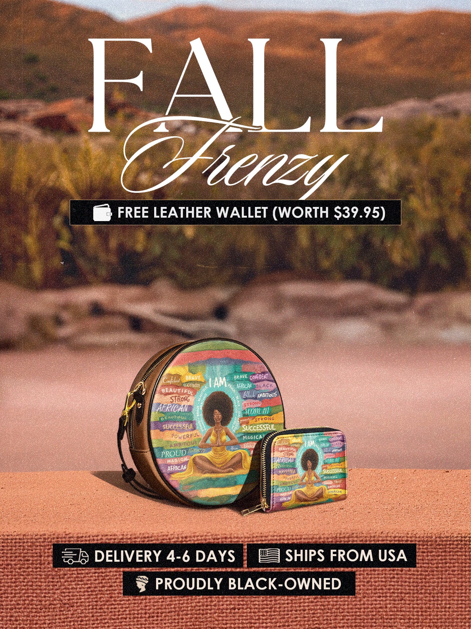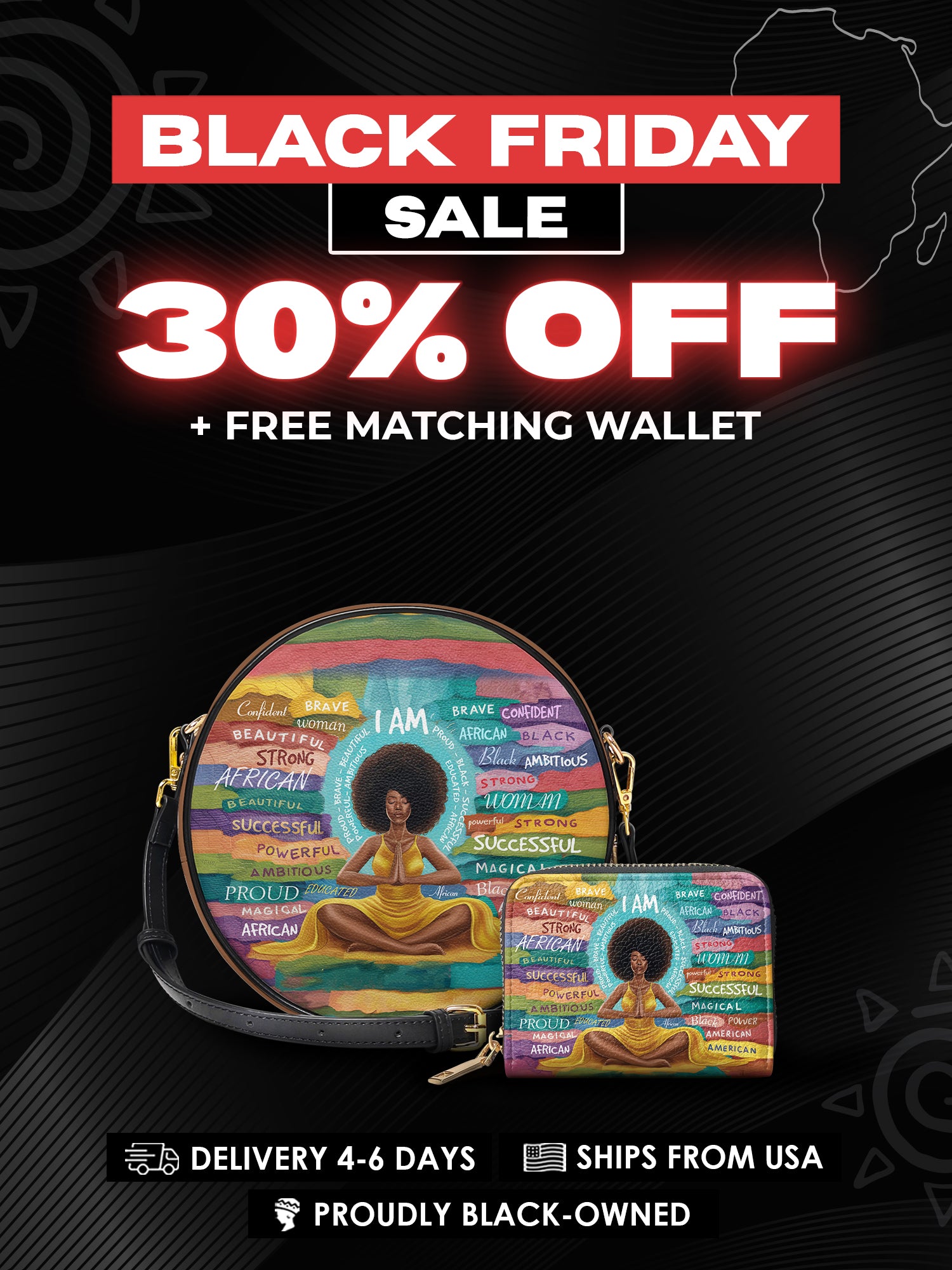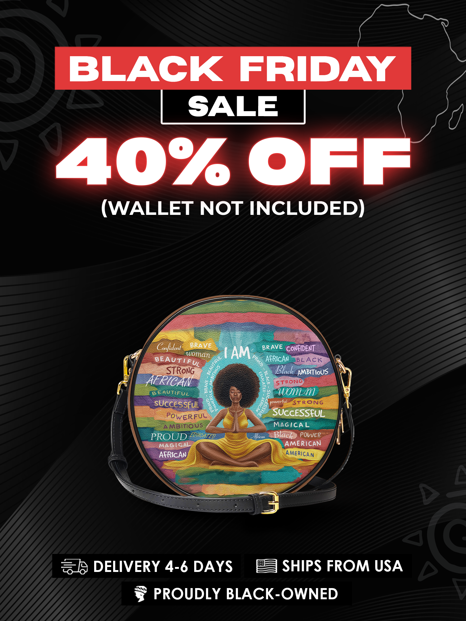You are the vibe. The vision. The vessel. The AfroEssence Circle Bag wraps that truth in rich color and bold affirmation. At the heart? A serene Black woman grounded in meditation, surrounded by a chorus of who she is—Strong. Beautiful. Ambitious. Magical. Proud. African.