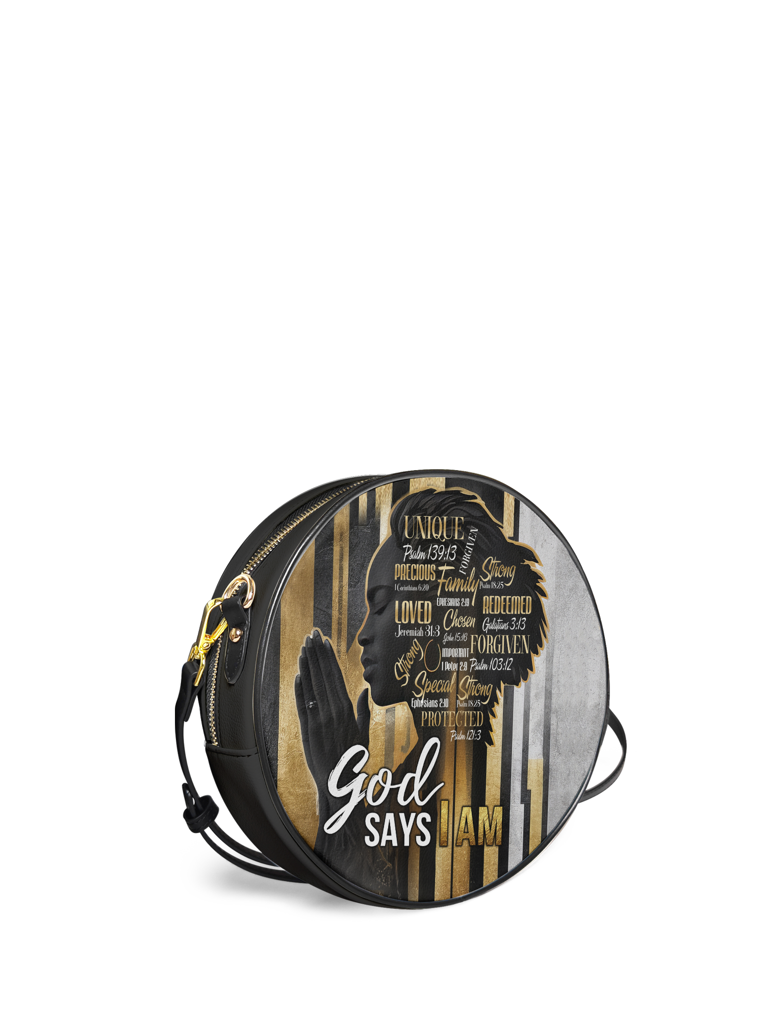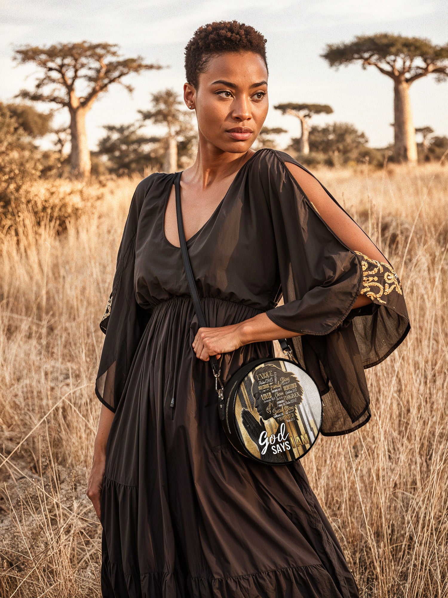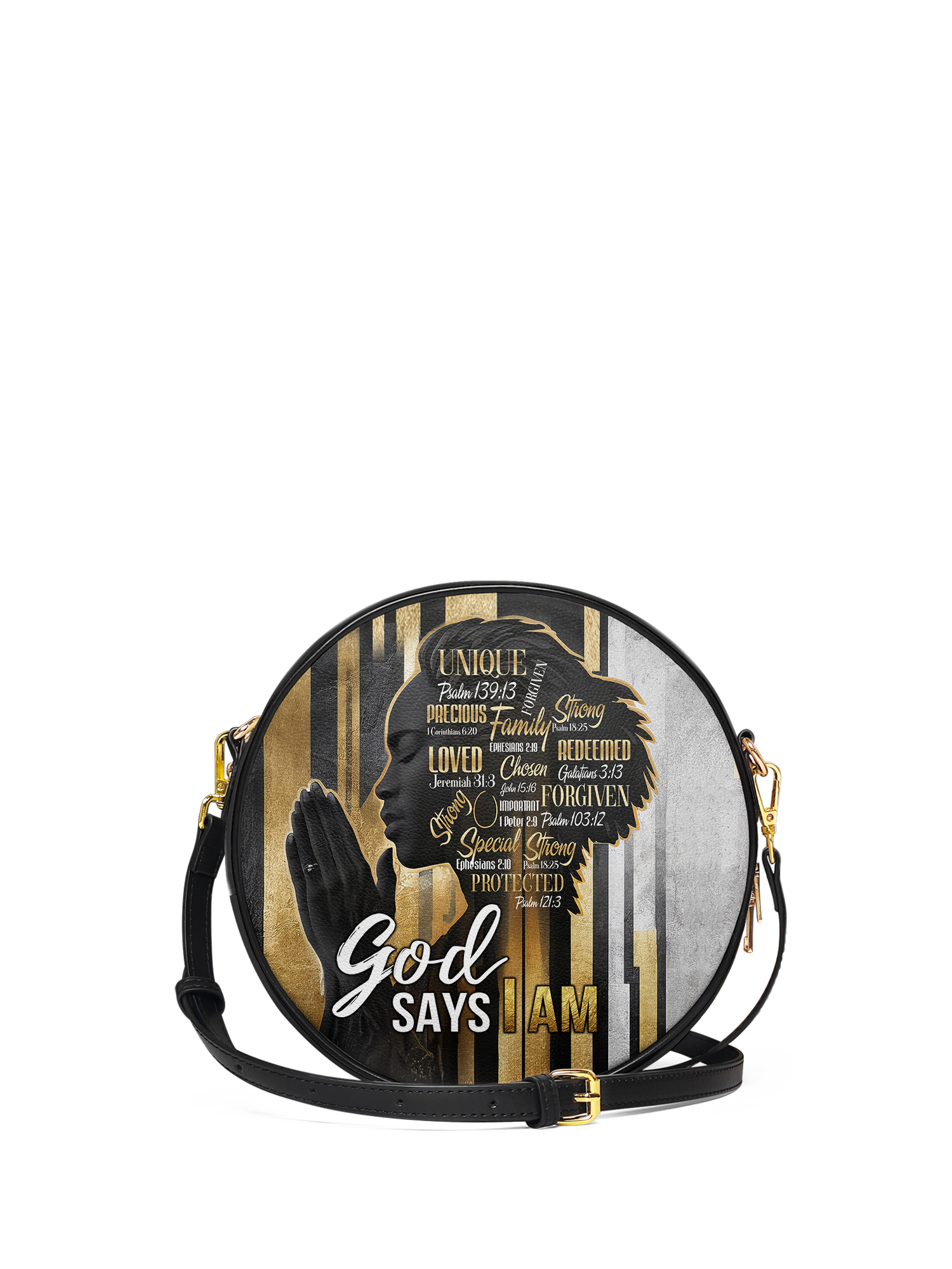 The Amara Circle Bag is more than fashion—it’s a declaration of faith. With a bold silhouette of a Black woman in prayer, layered in shimmering gold, deep black, and sacred affirmations, this round beauty says it loud: God Says I AM.