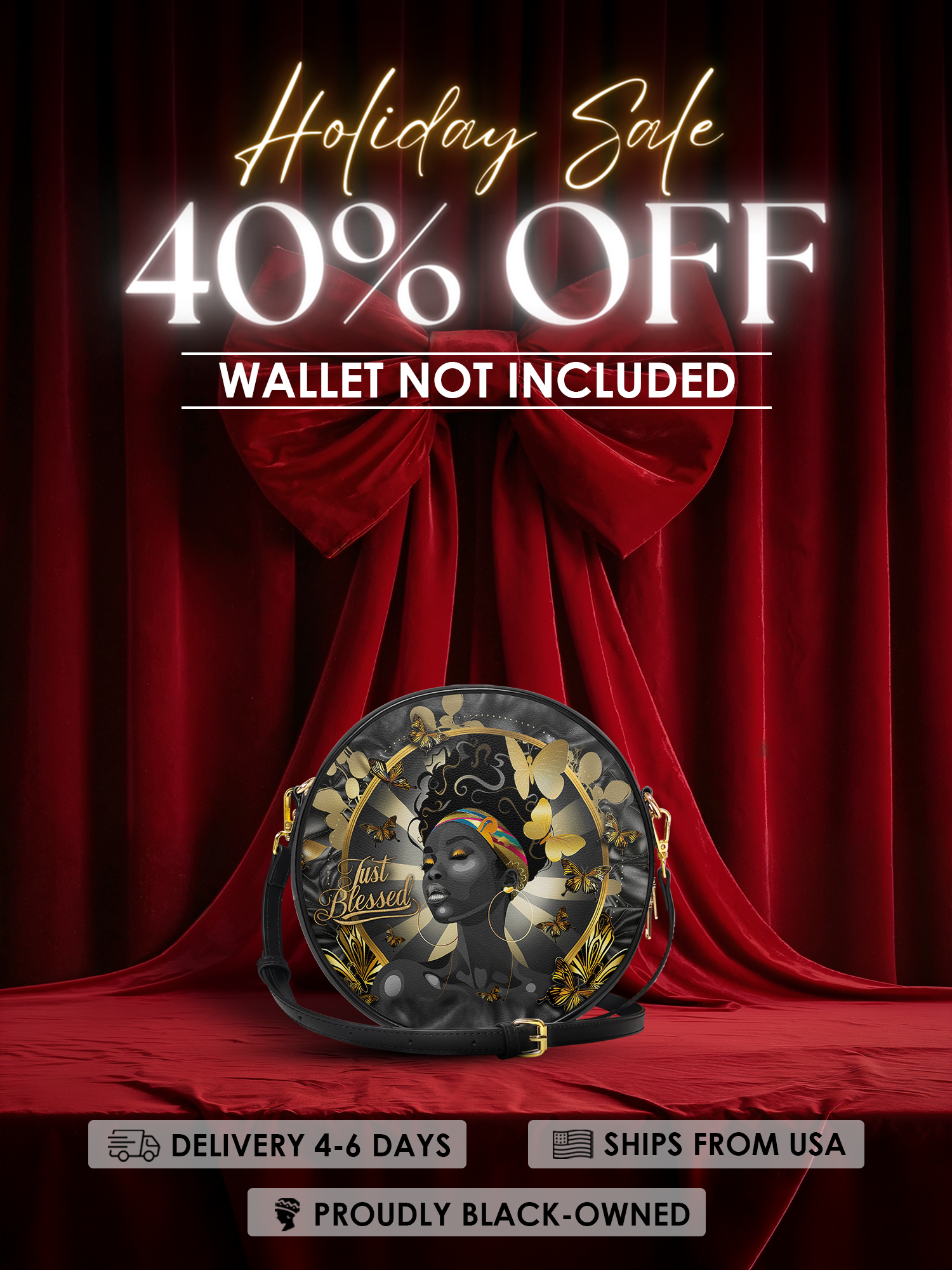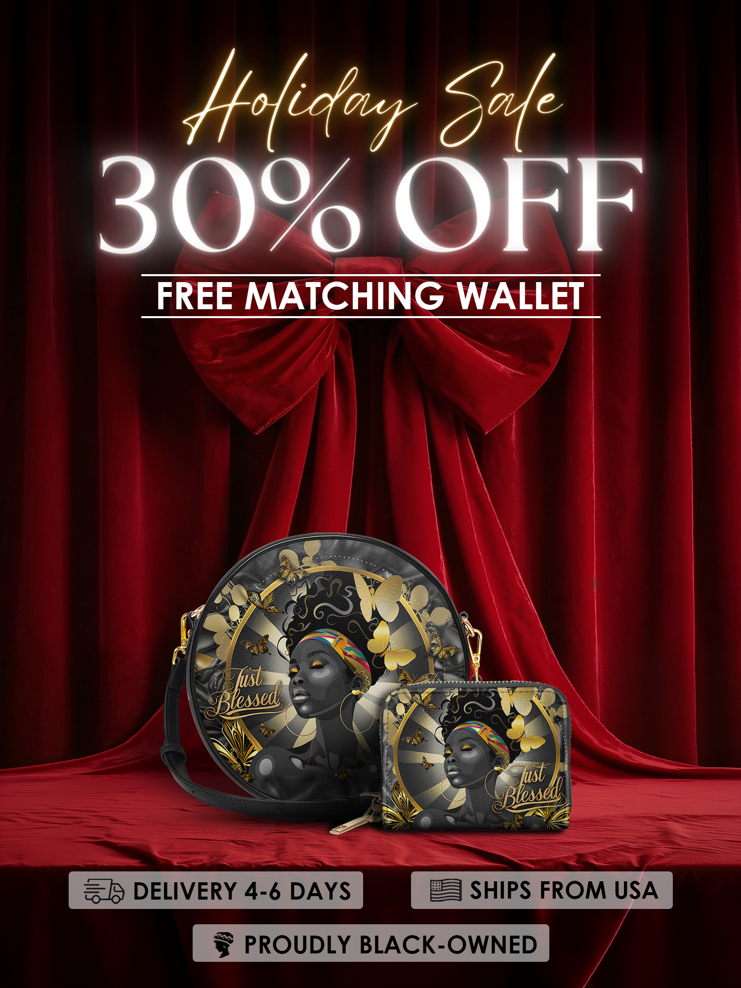Wrapped in soft black and gold, this bag holds more than your daily essentials—it holds a message. The portrait of a Black woman, head high and eyes radiant, anchors the design with unapologetic grace. She’s surrounded by golden butterflies and light beams, as if the universe itself is bowing in awe. The words “Just Blessed” shimmer beside her—not as a boast, but a quiet truth.