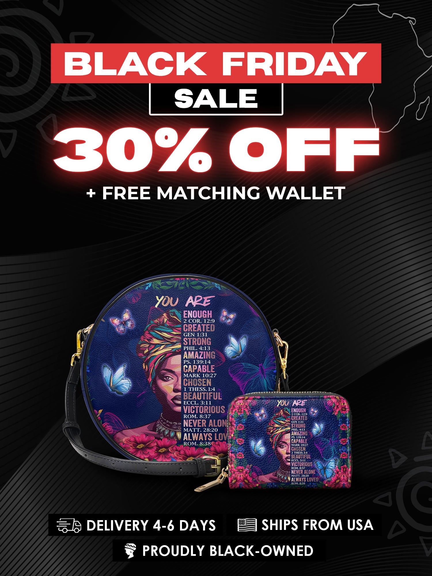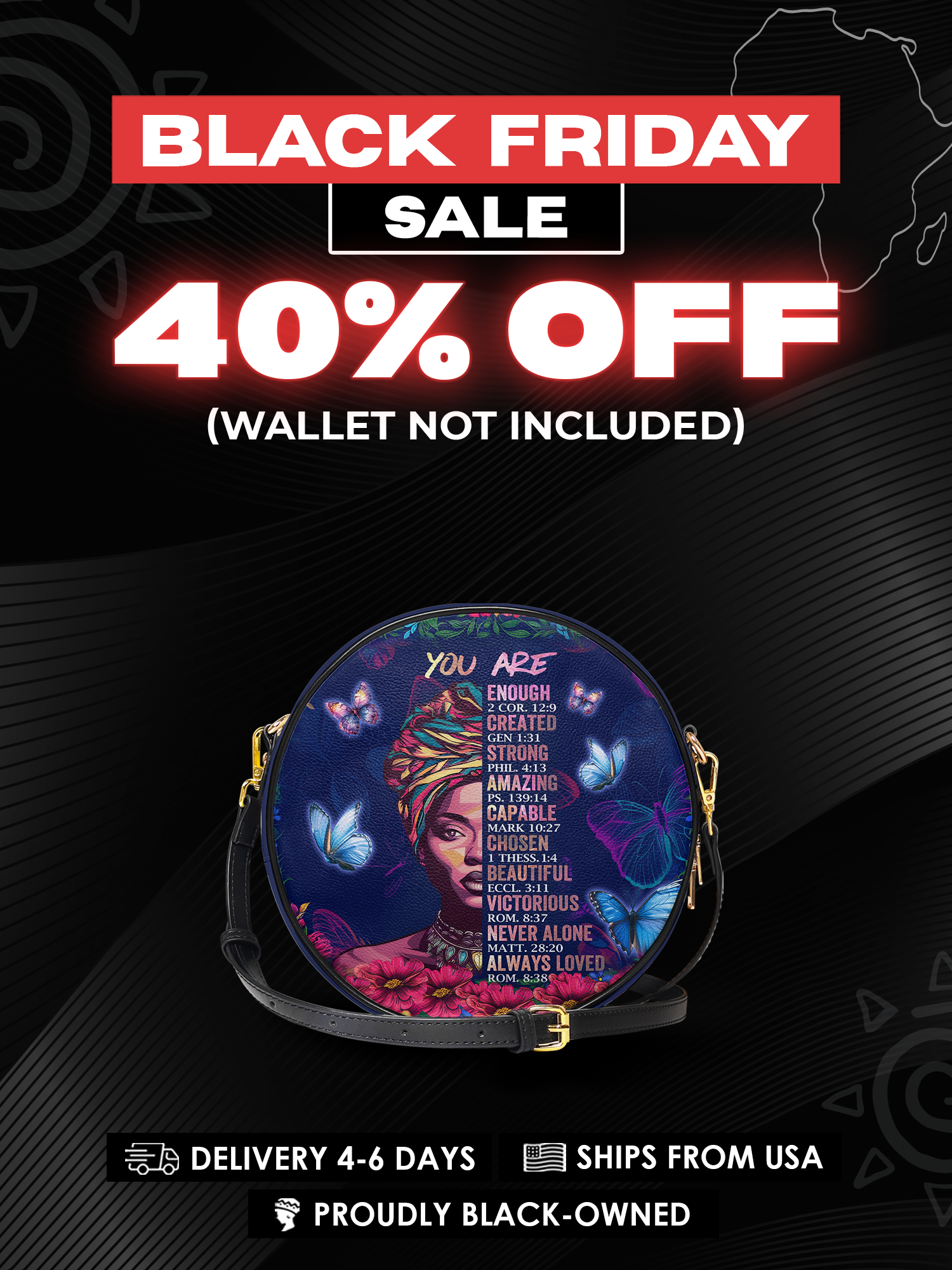 Imani means ‘faith’—and this bag is a whole affirmation. Wrapped in butterflies, crowned in scripture, the Imani Circle Bag whispers truth to your soul: You are strong. Chosen. Enough. Beautiful. Whether you carry it to church or brunch, this bag reminds you—your power was spoken into existence.