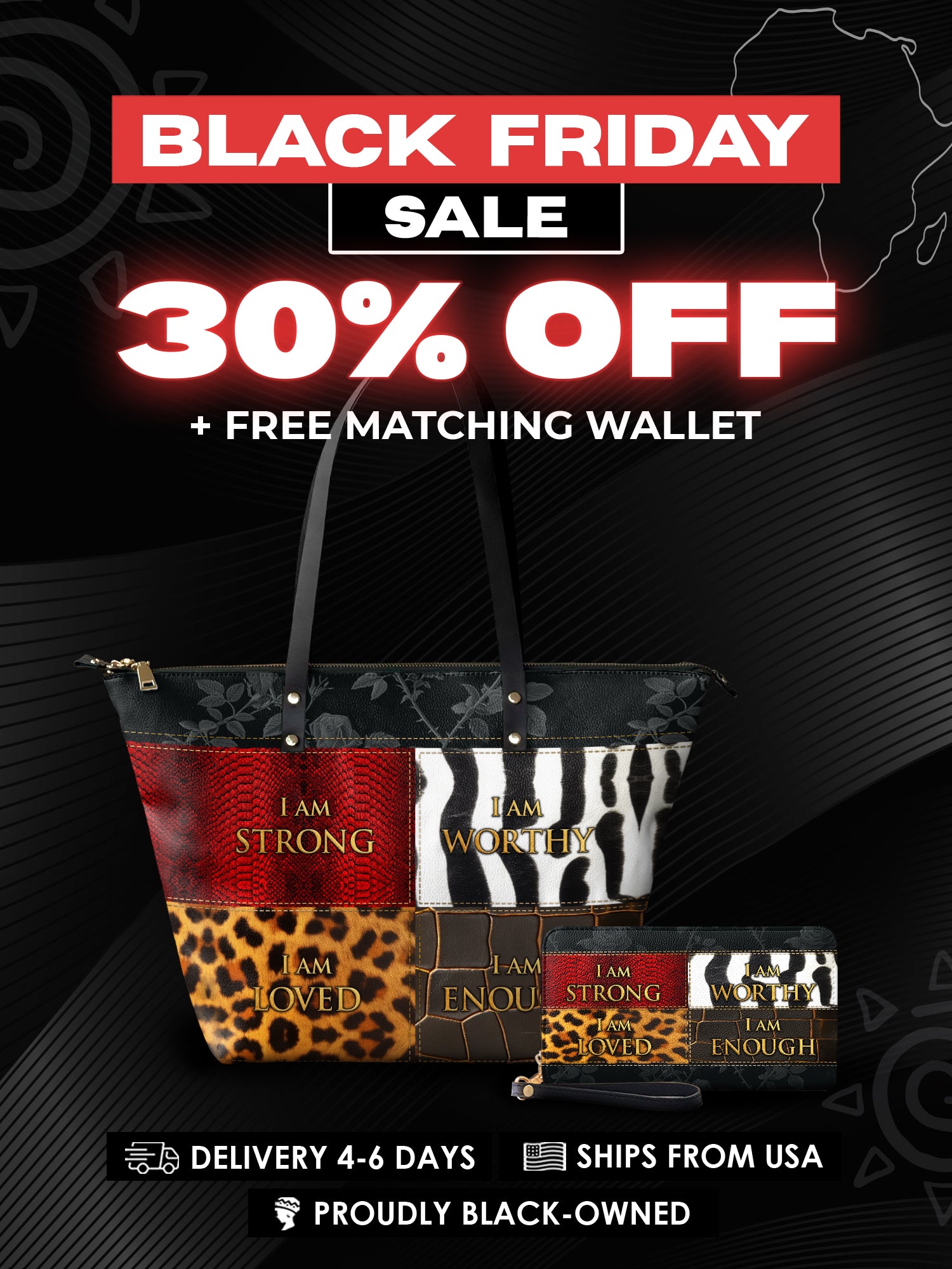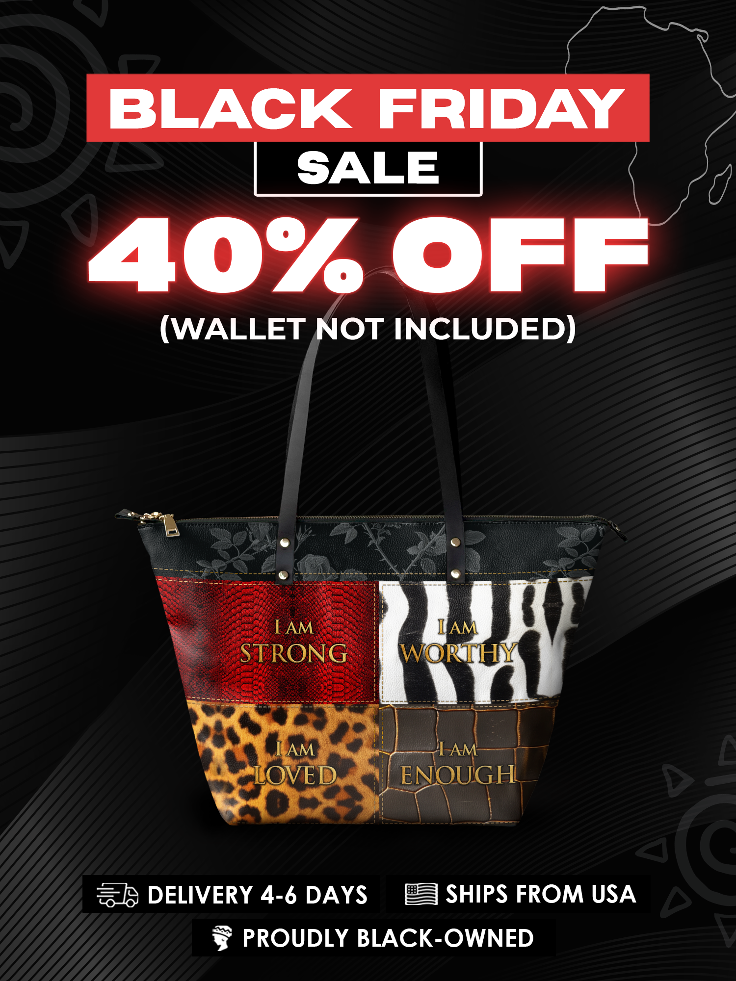 The "Kadia" Tote, meaning "strong leader," is a bold statement of self-worth. Featuring "I am strong, worthy, loved, enough", it celebrates the power of Black women. Inspired by Africa’s iconic animals—snake, zebra, leopard, and crocodile—this tote symbolizes resilience, confidence, and beauty. Carry it as a daily affirmation of your strength!