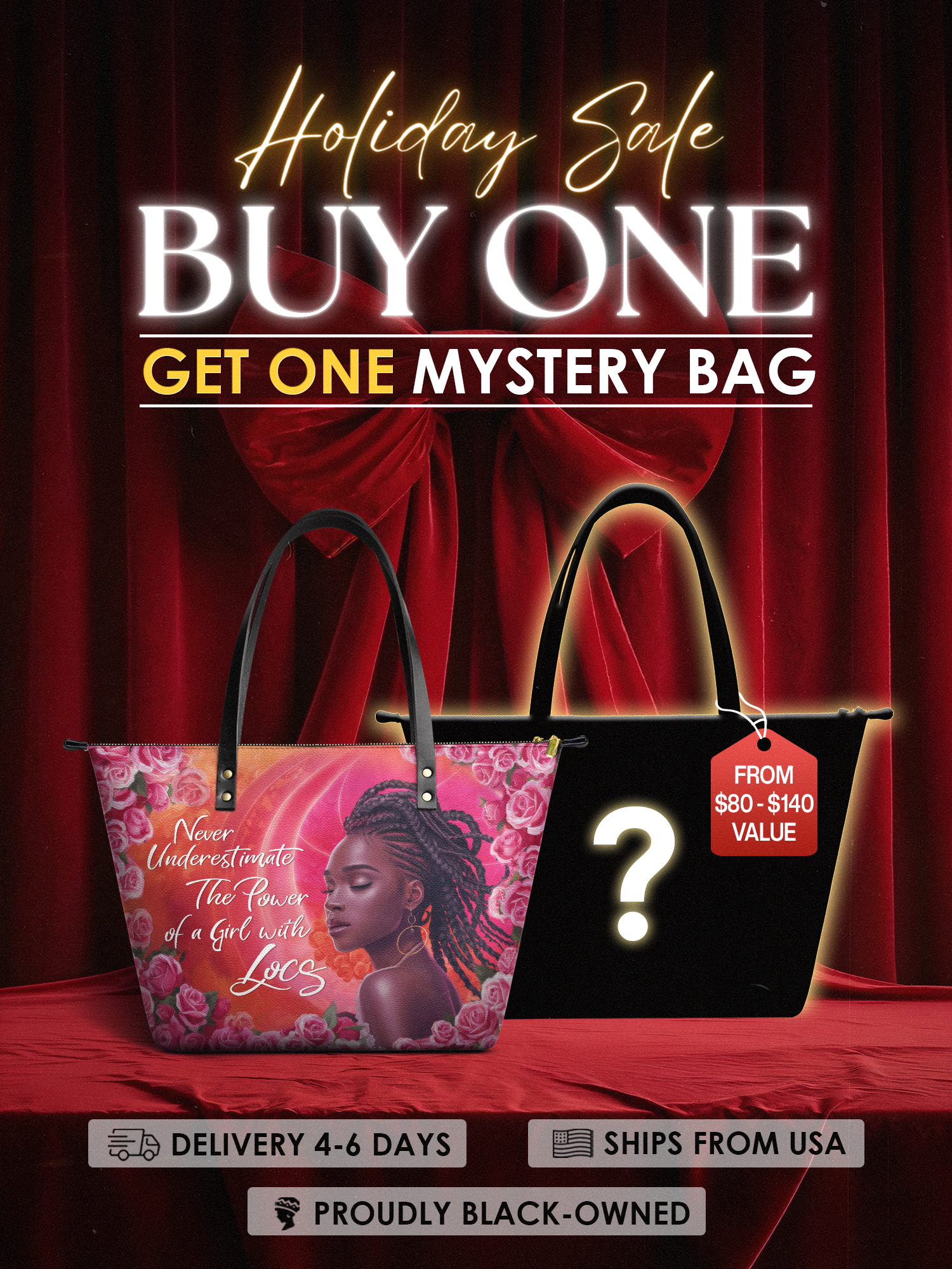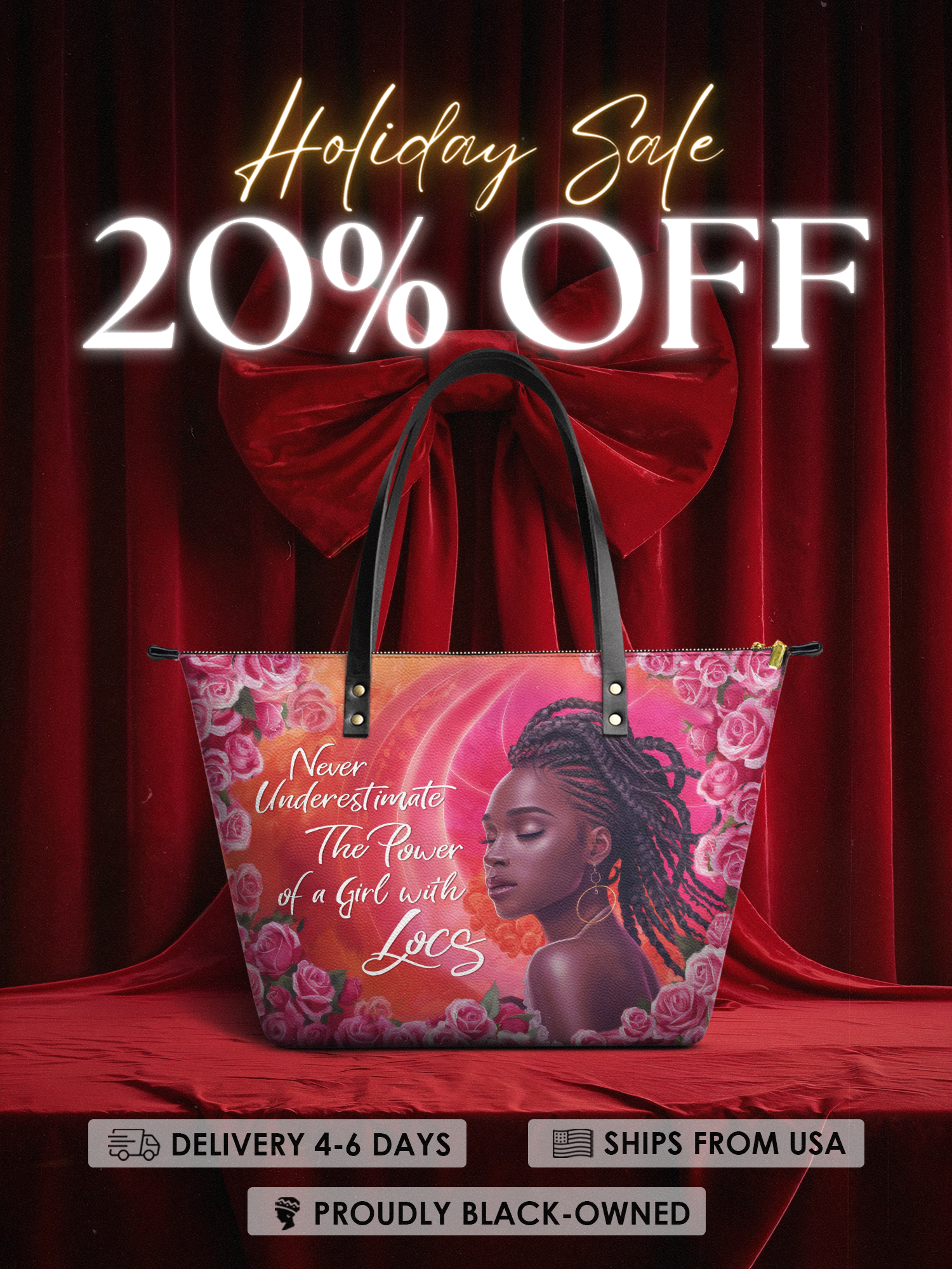 The Loclani tote is a whole love letter to the power of locs. Not just a hairstyle—but a story, a crown, a statement. She stands soft, yet strong, surrounded by roses and glowing in her truth. This bag reminds the world that when a girl’s got locs, she’s not to be underestimated. She's grounded. She's grown. And she’s walking in beauty, boldness, and grace. Carry it as a quiet flex—or a loud one. Either way, it speaks volumes before you ever say a word