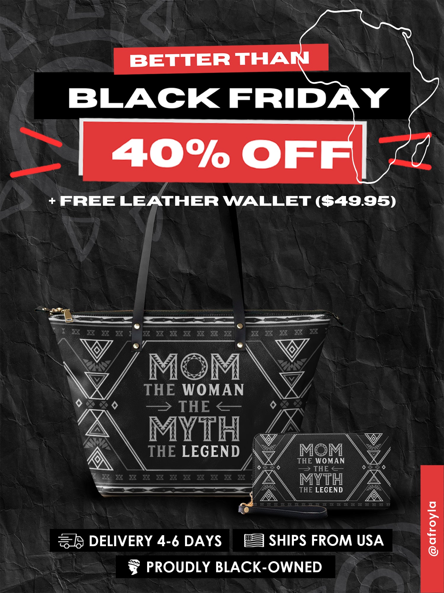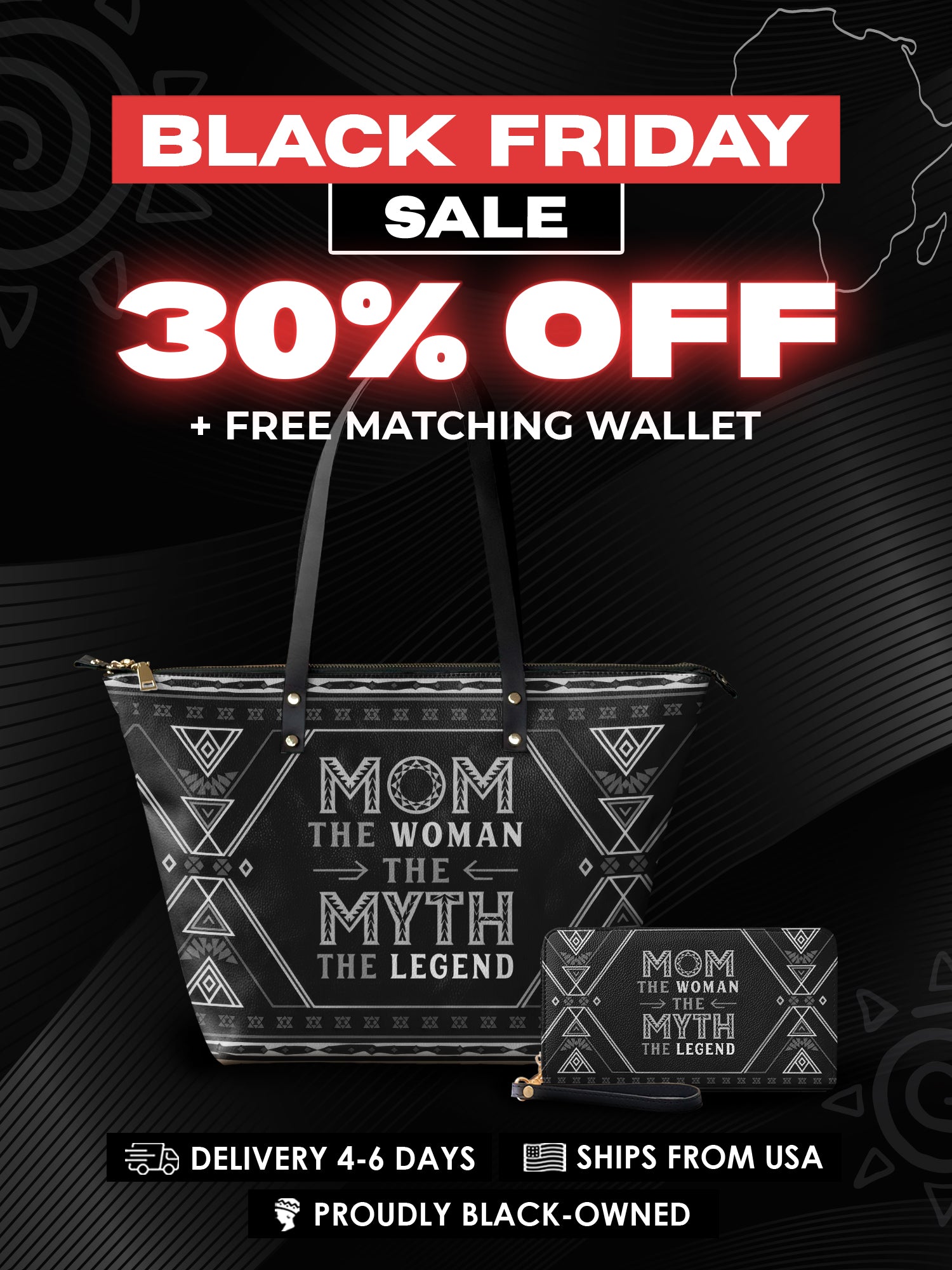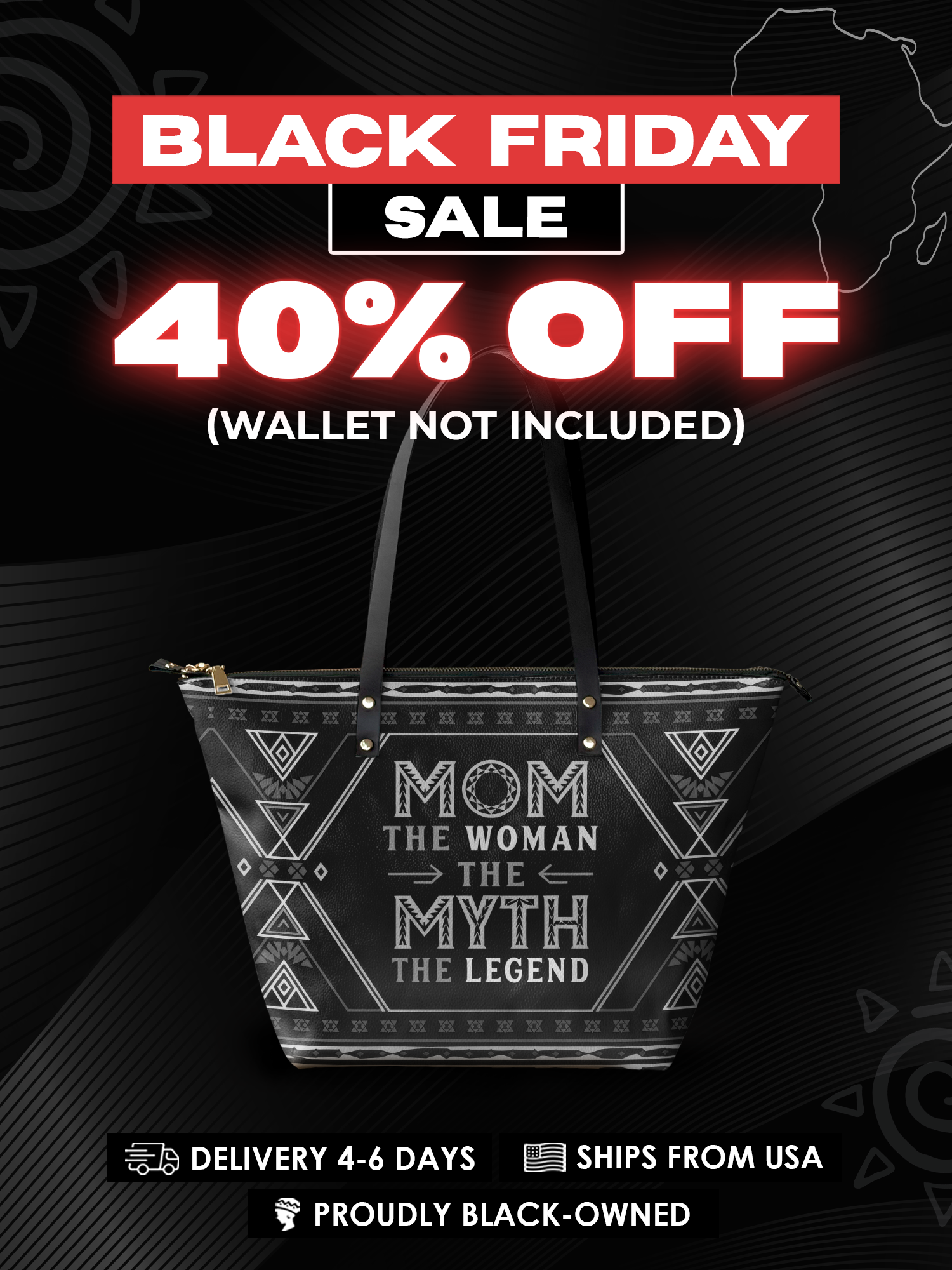 Featuring the bold quote "Mom – The Woman, The Myth, The Legend!", this tote is a powerful reminder of a mother's influence, resilience, and enduring greatness. Designed with Afrocentric patterns in a sleek black finish, it embodies both cultural pride and timeless elegance—a perfect statement piece for moms who lead, nurture, and inspire.