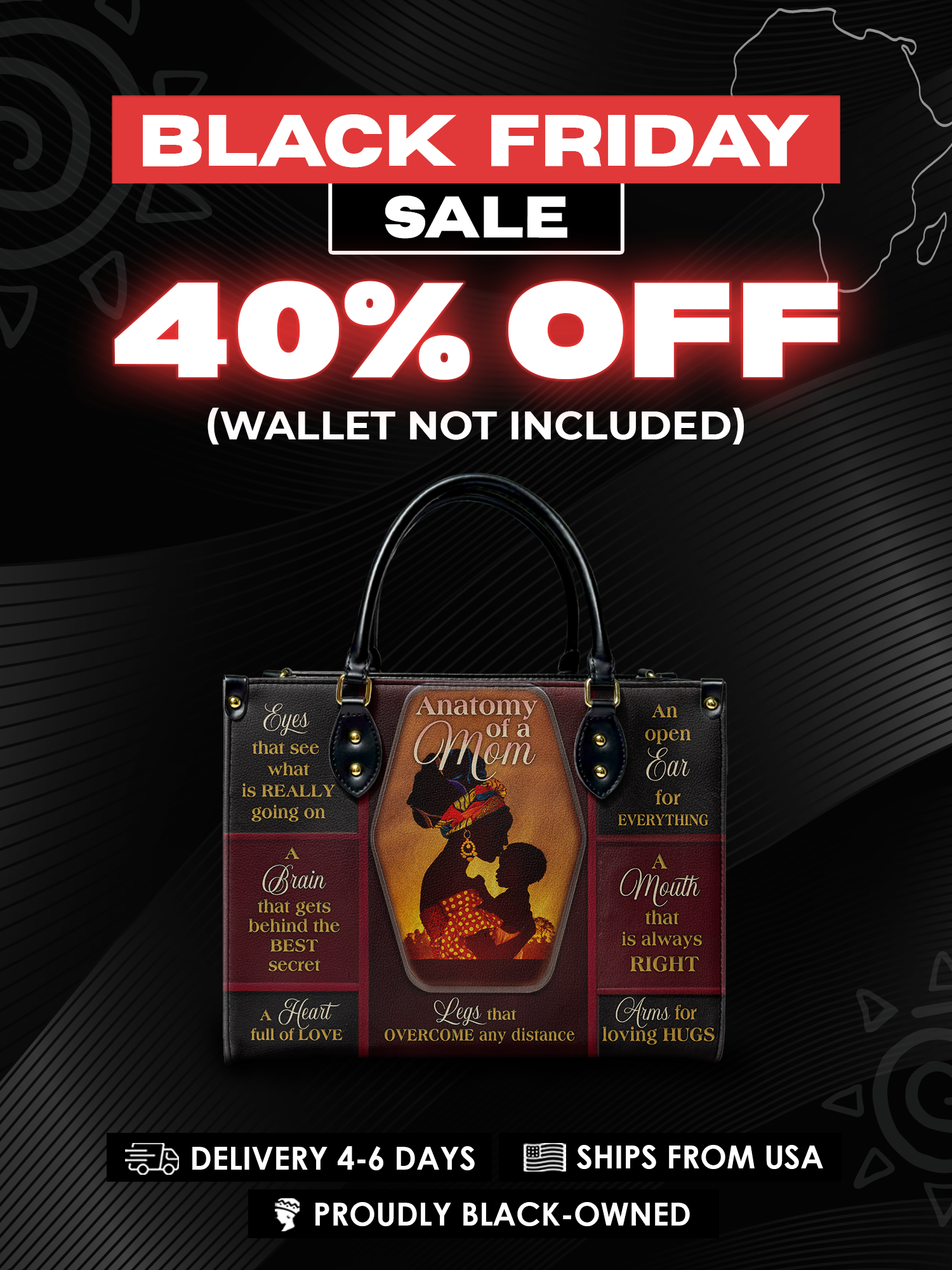 The Mamoya Handbag, blending Mama (mother) and Joya (joy), celebrates the heart and strength of Black motherhood. Featuring "Anatomy of a Mom," this design honors the wisdom, love, and resilience that shape every Black mother.