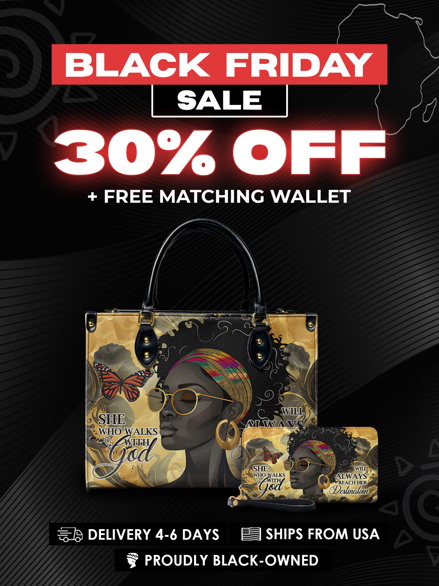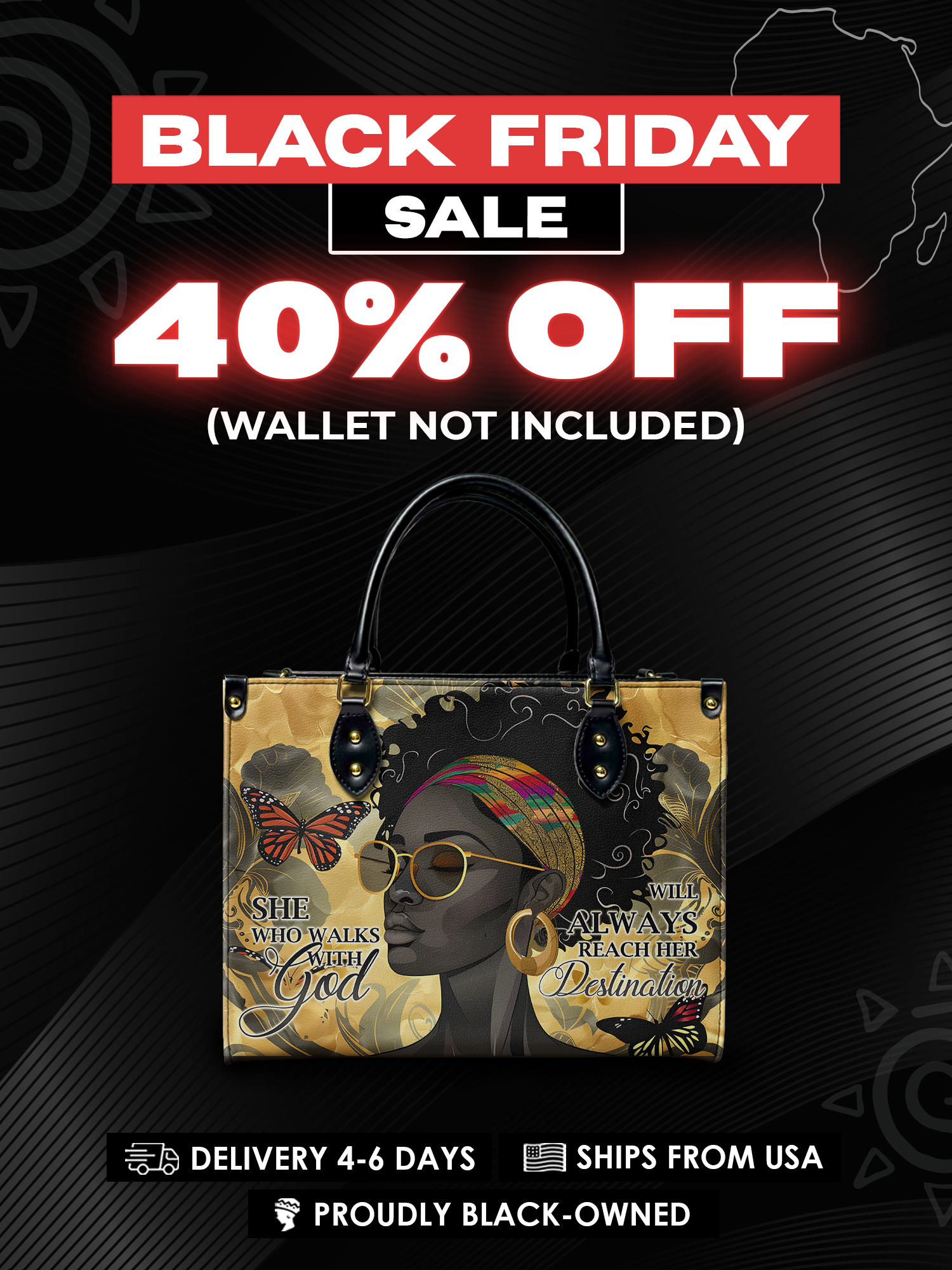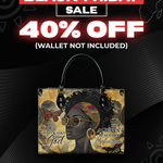 The Njia Handbag, meaning "path" in Swahili, symbolizes faith and strength. Featuring the quote "She who walks with God will always reach her destination" this design celebrates the resilience of Black women. The artwork showcases a regal Black woman with bold confidence, surrounded by butterflies representing transformation. Made from premium leather, this handbag is a stylish reminder that faith leads the way.