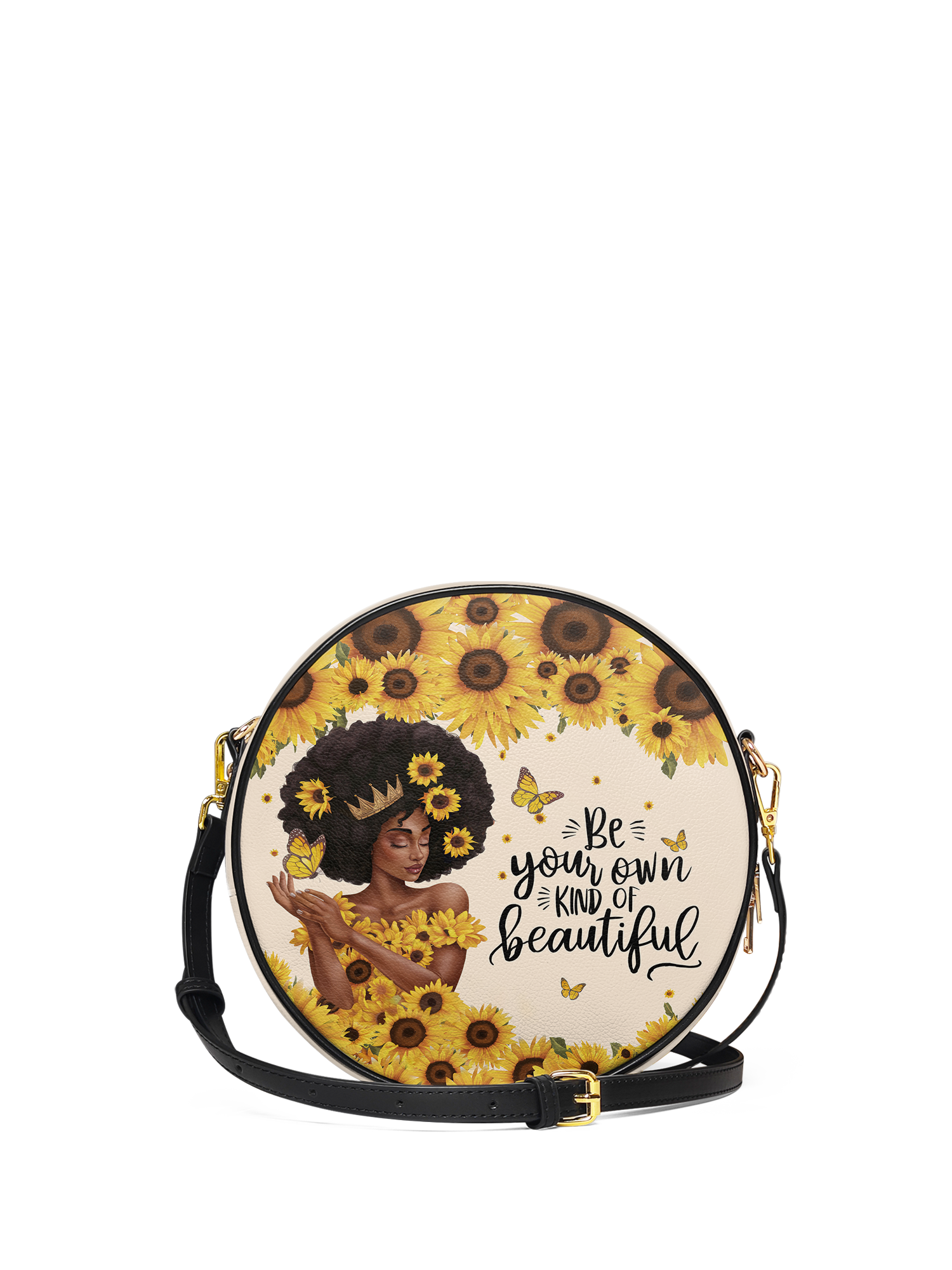 Zuriya means ‘beautiful’—and this bag blooms with it. Surrounded by sunflowers and crowned in self-love, the Zuriya Circle Bag reminds you: beauty isn’t about fitting in—it’s about showing up as YOU. Radiant. Free. Divine. It’s not just a bag—it’s a soft, sunlit celebration of your authentic shine.