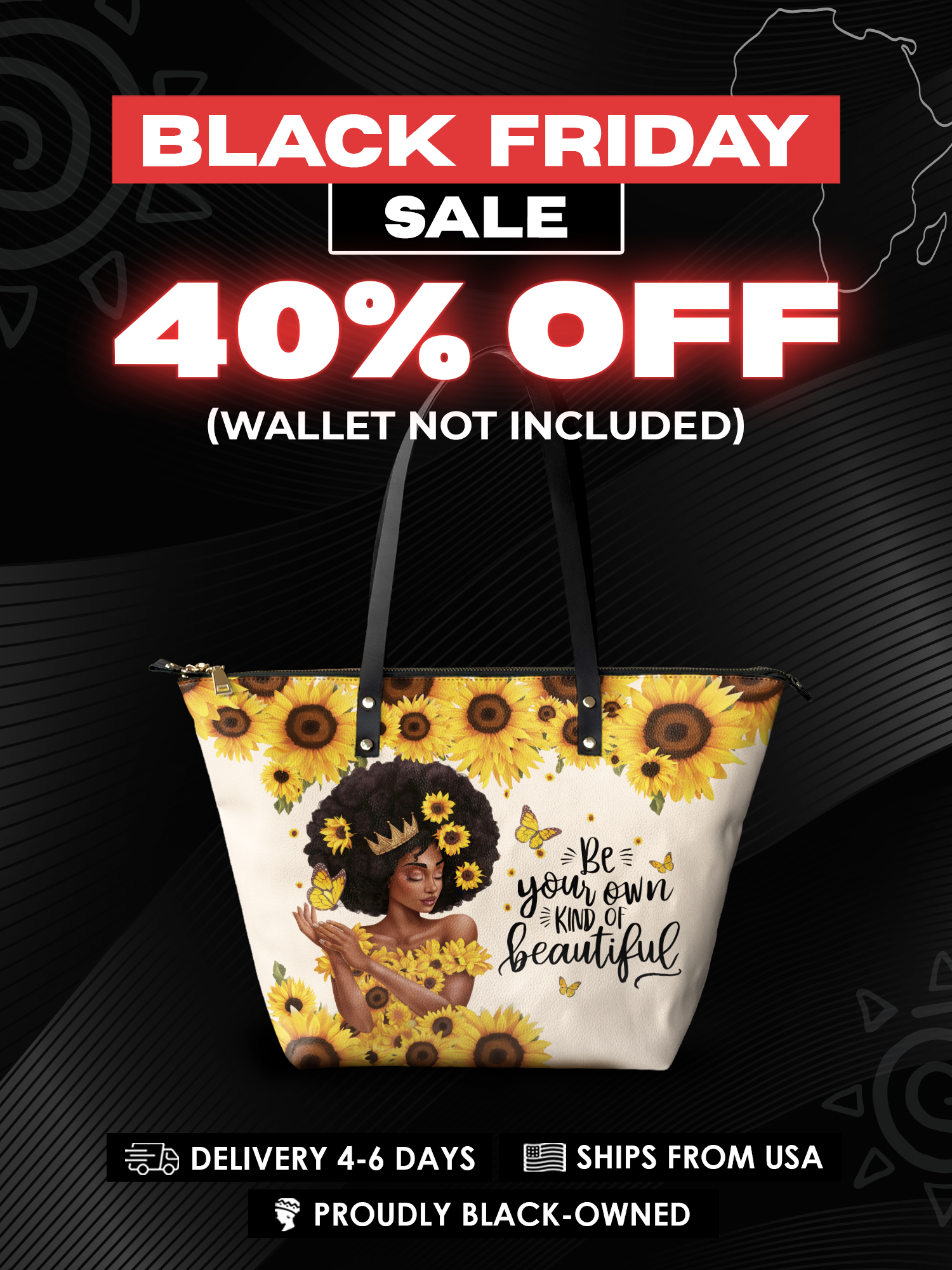 The Zuriya Tote, inspired by the Swahili name Zuri, meaning "beautiful", is a tribute to Black women’s unique radiance. Featuring the uplifting quote "Be your own kind of beautiful," this tote reminds you to embrace and love yourself fully. Designed with vibrant sunflowers and a regal queen, Zuriya is a symbol of confidence, joy, and self-worth. Carry it with pride and shine your light everywhere you go!